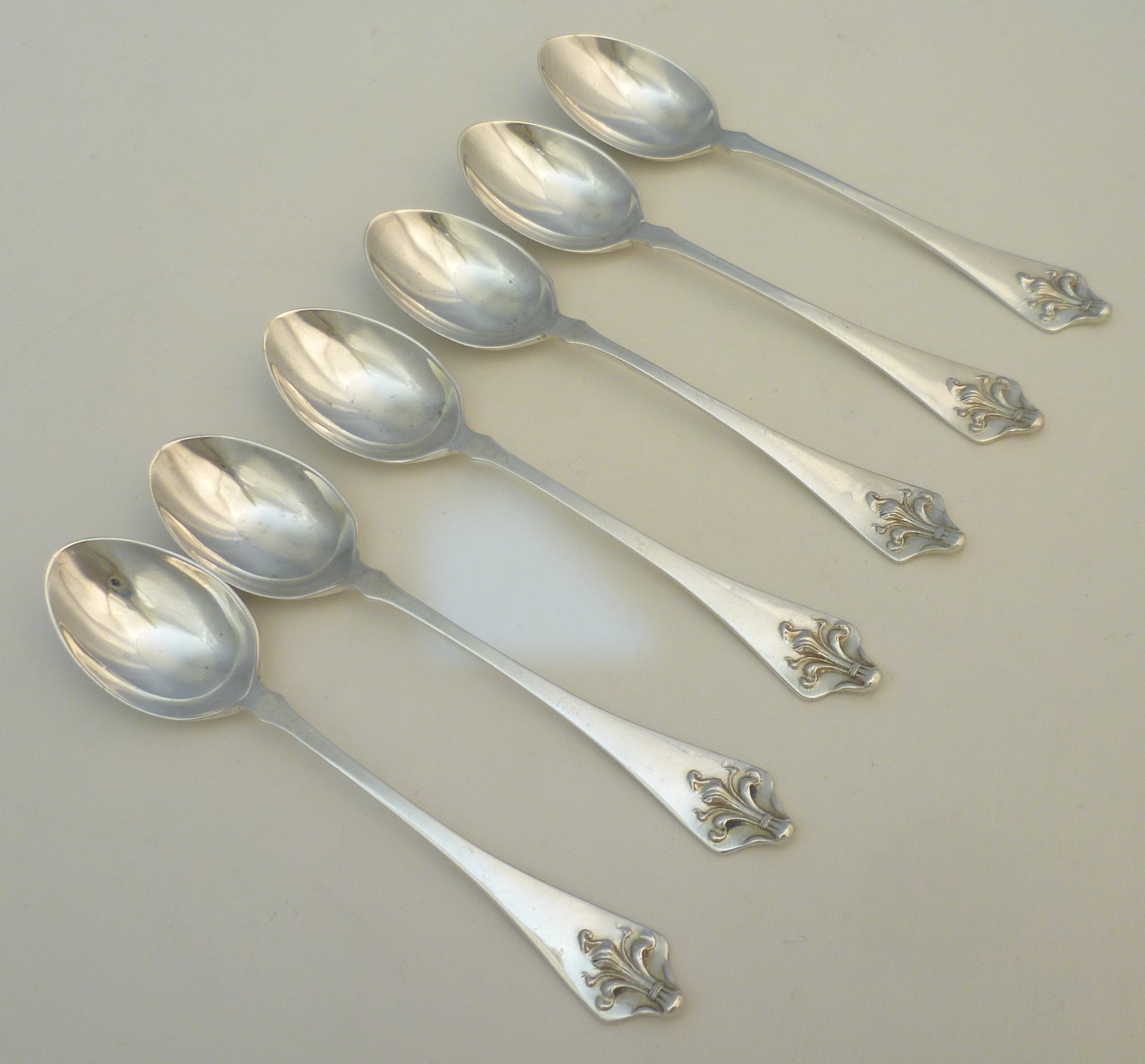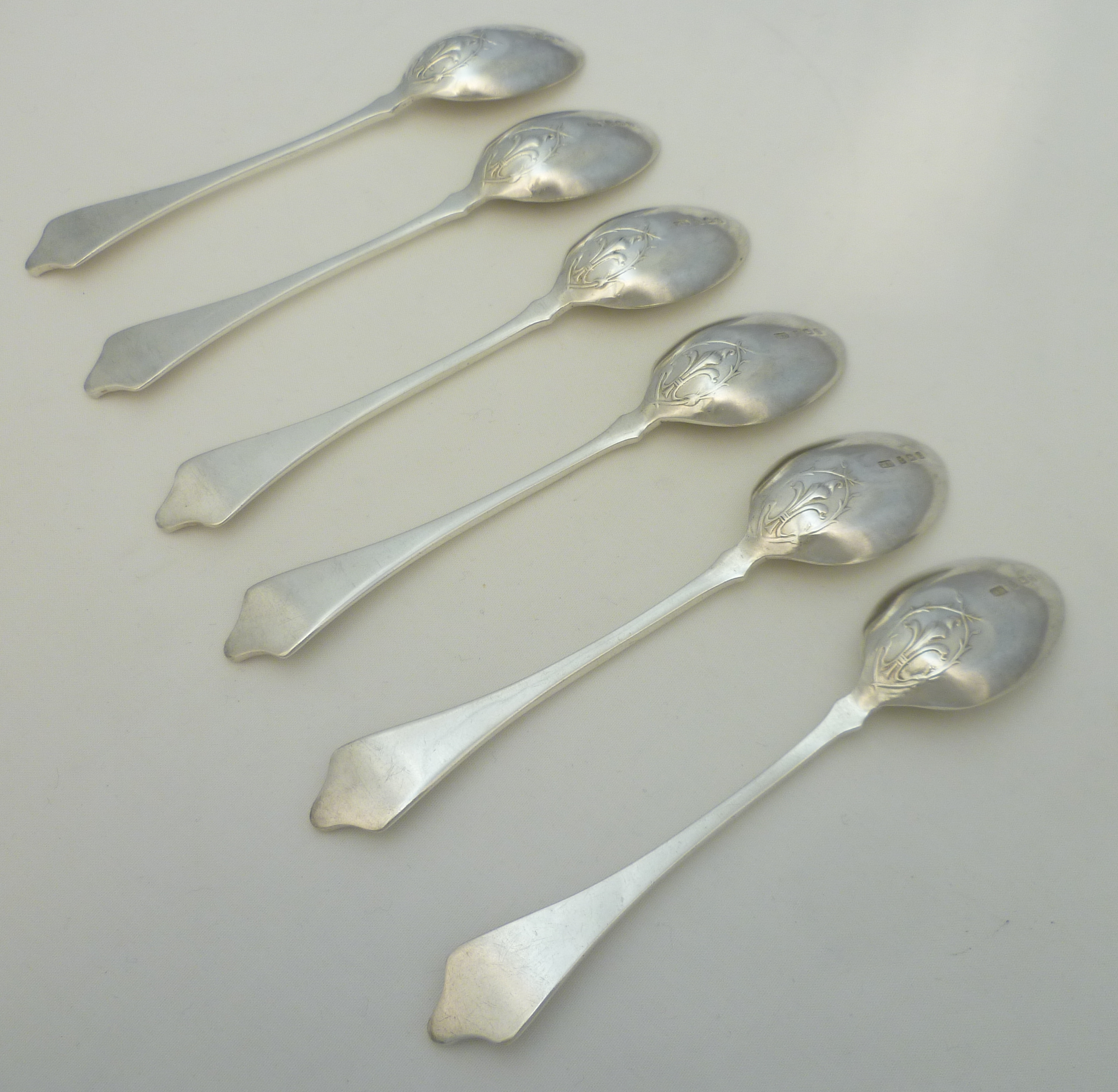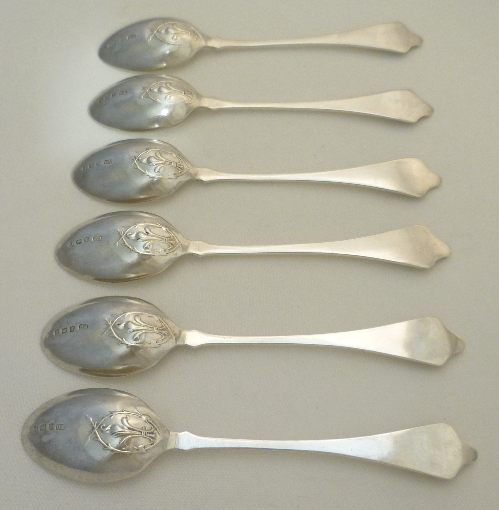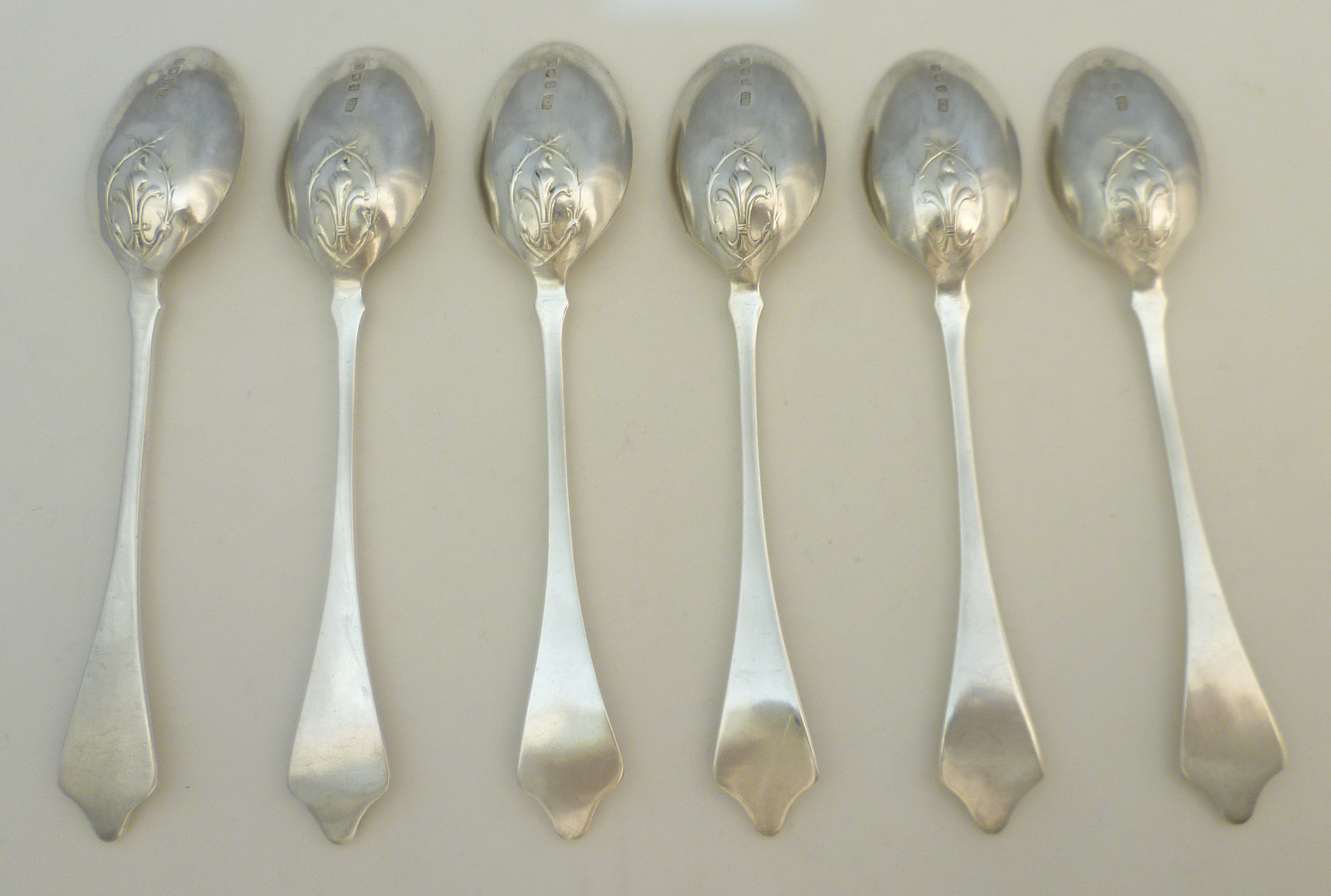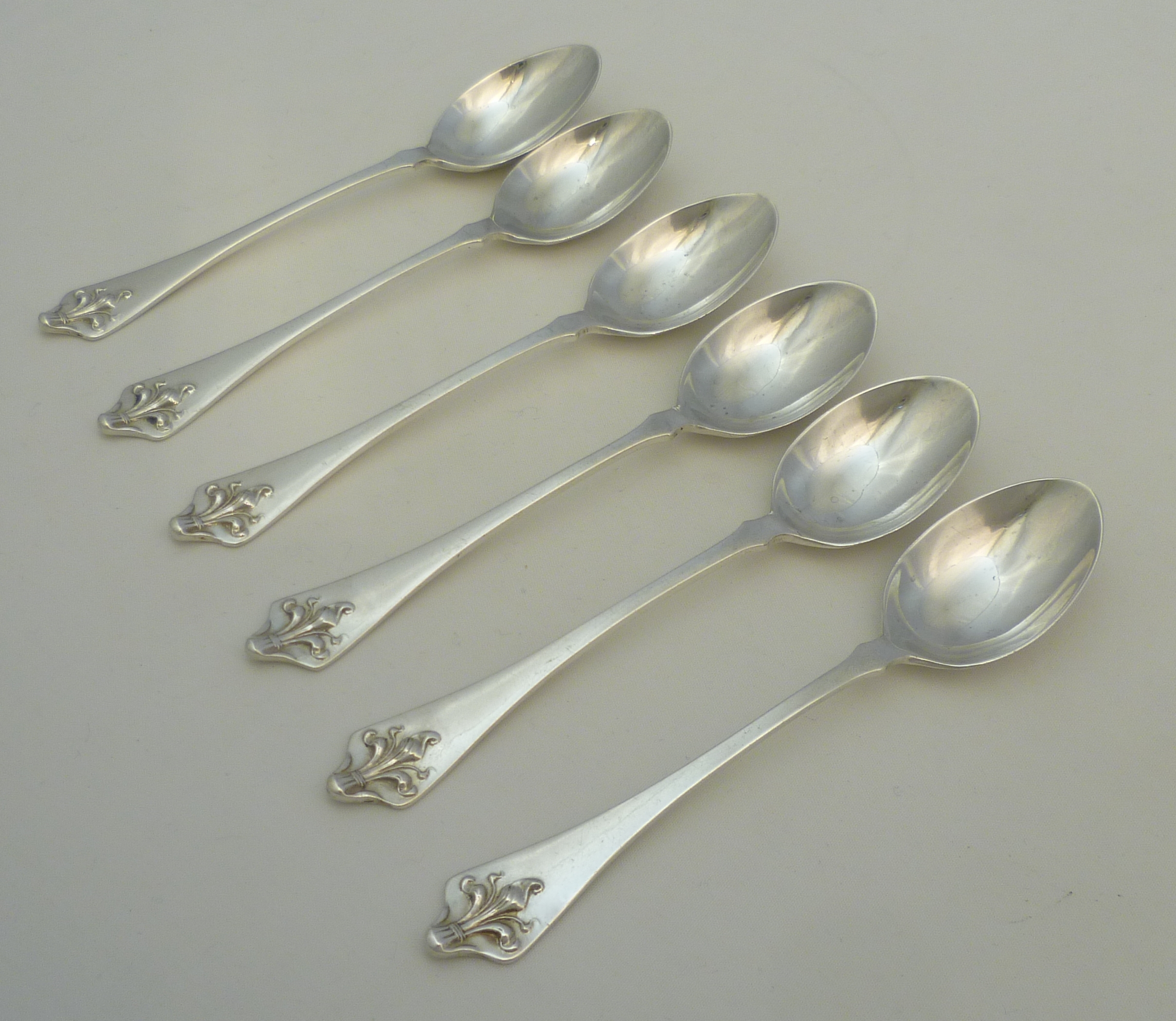 DESCRIPTION | Unusual set of six antique solid sterling silver Dog Nose pattern tea or coffee spoons with cast swag decoration to the terminal fronts and bowl backs. |