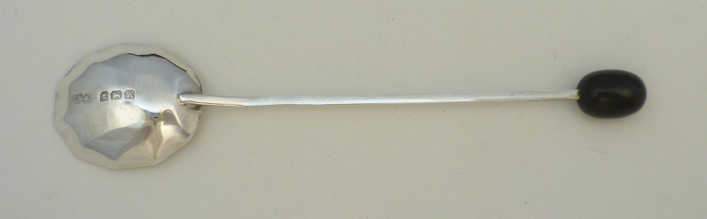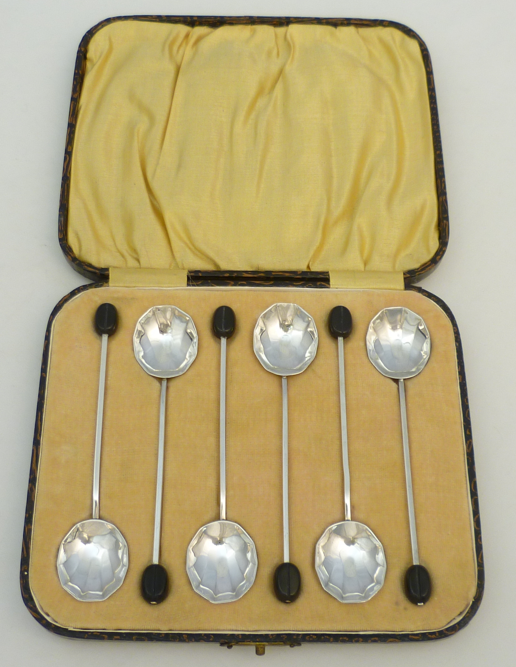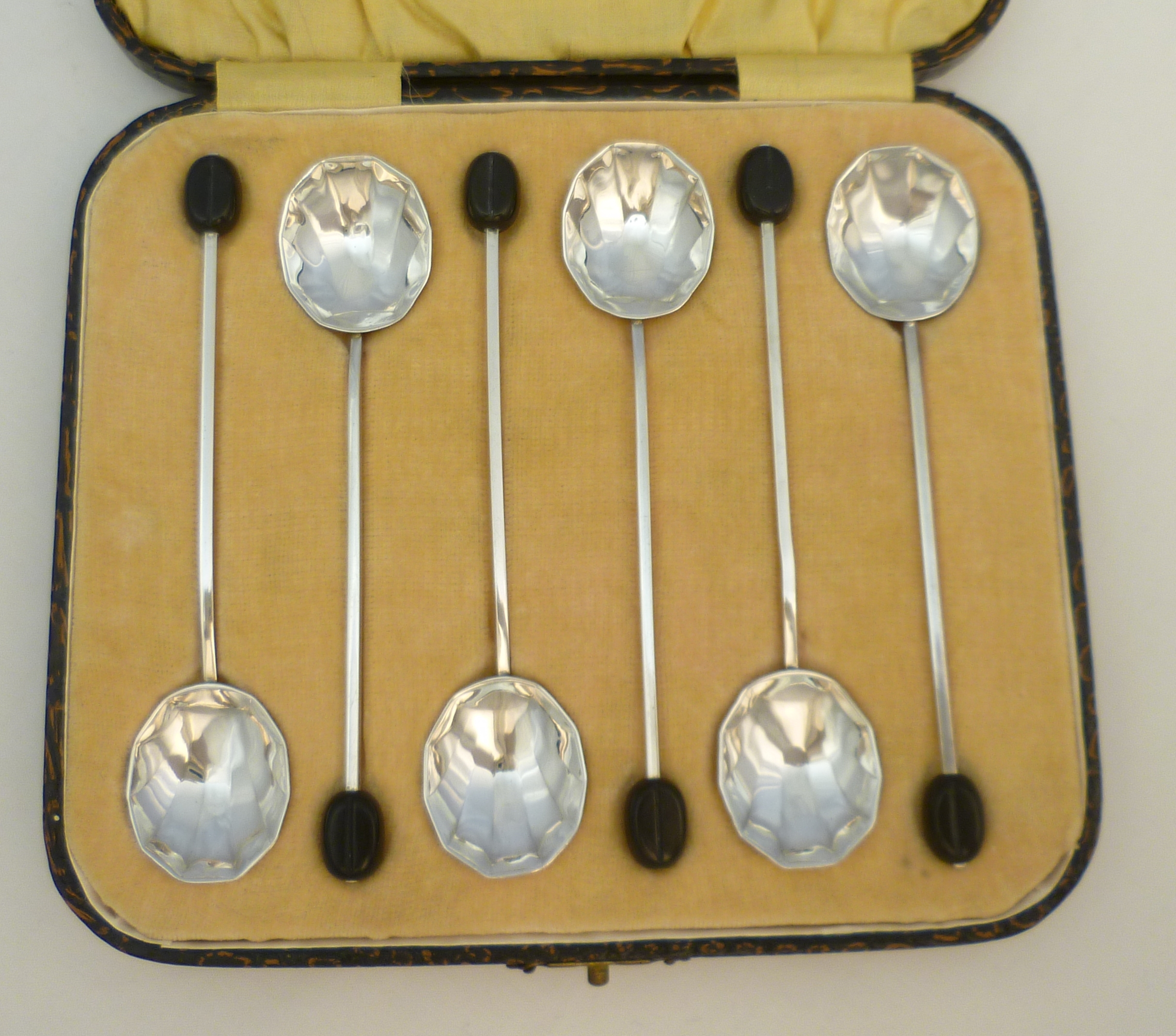 DESCRIPTION | Pretty and cased set of six solid sterling silver coffee spoons with coffee bean form terminal decoration. |