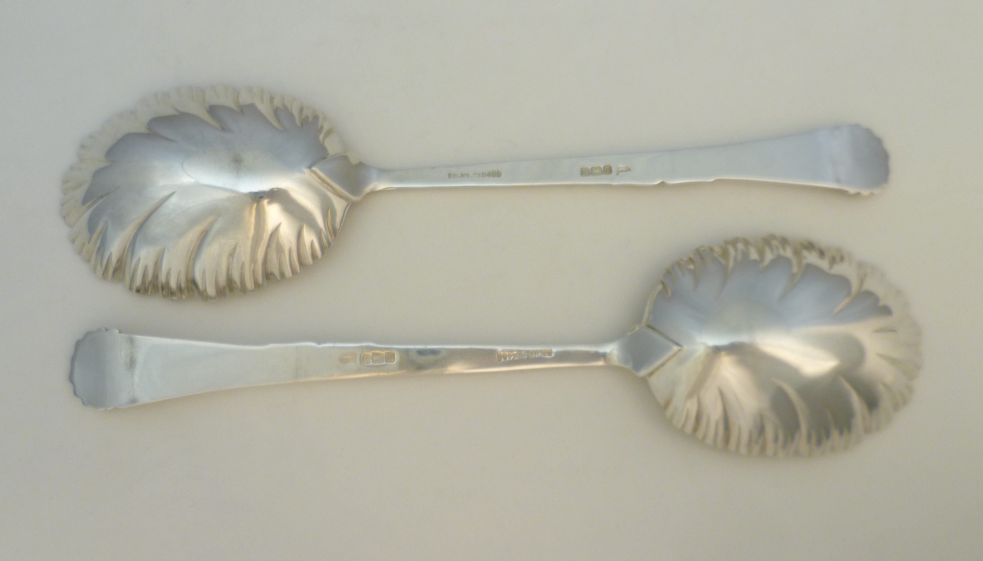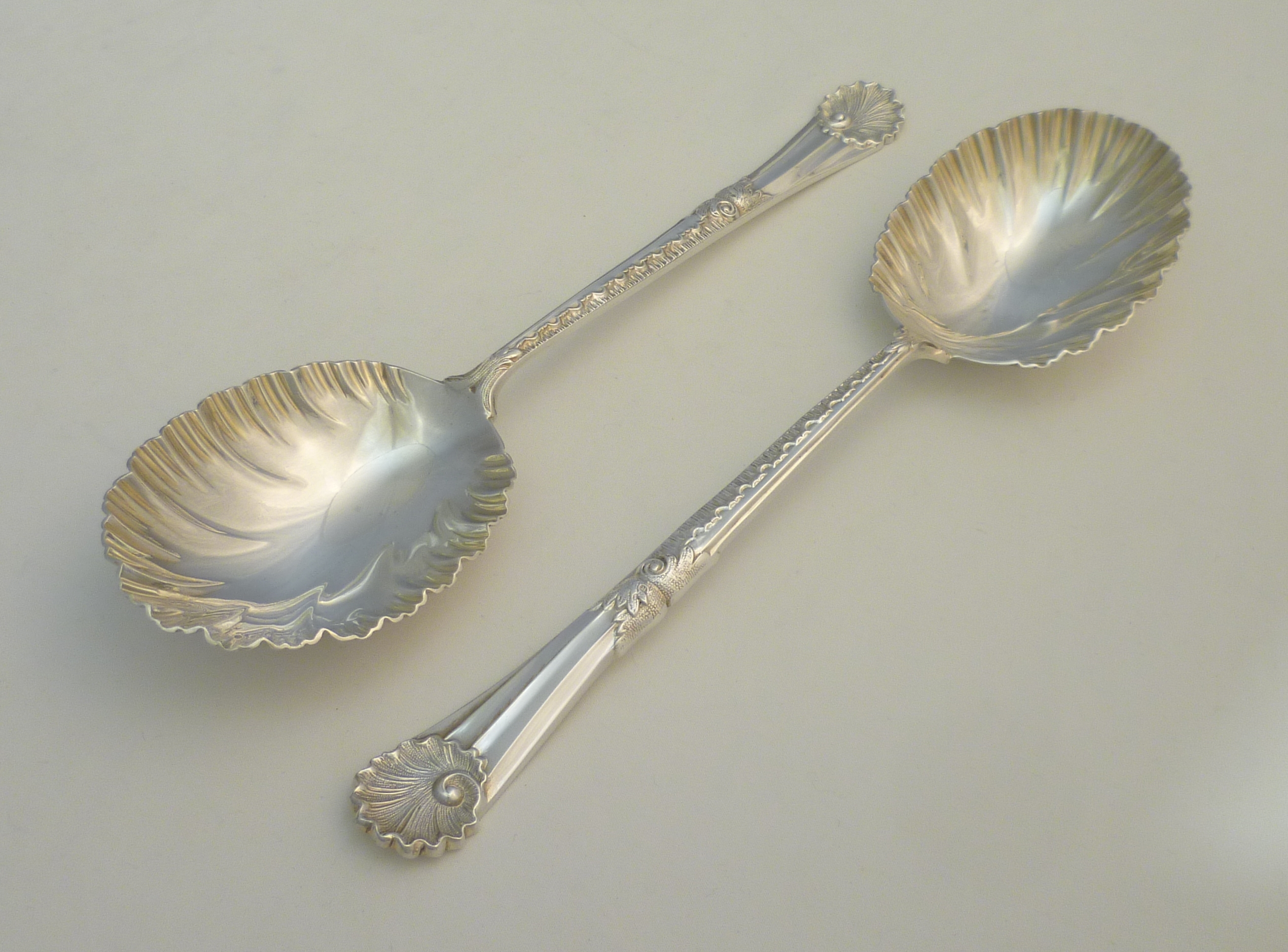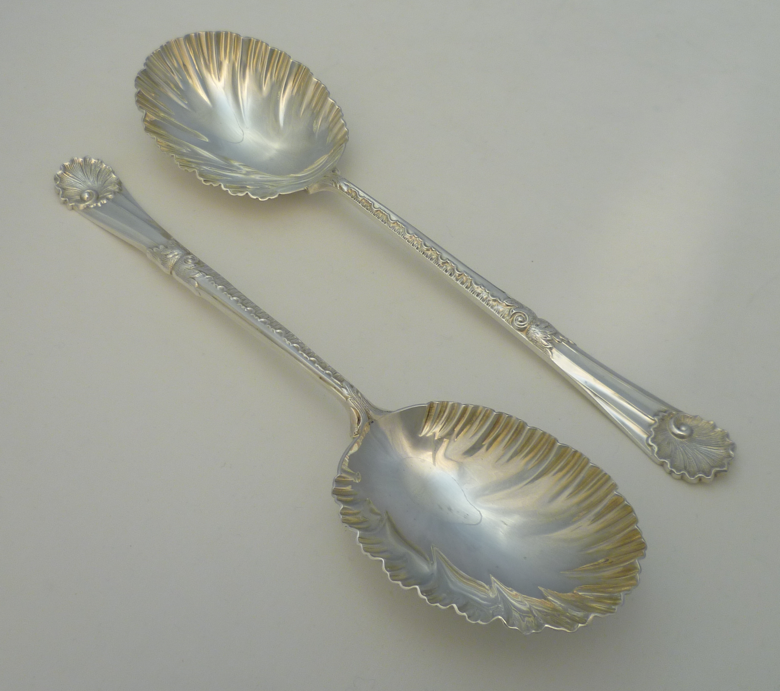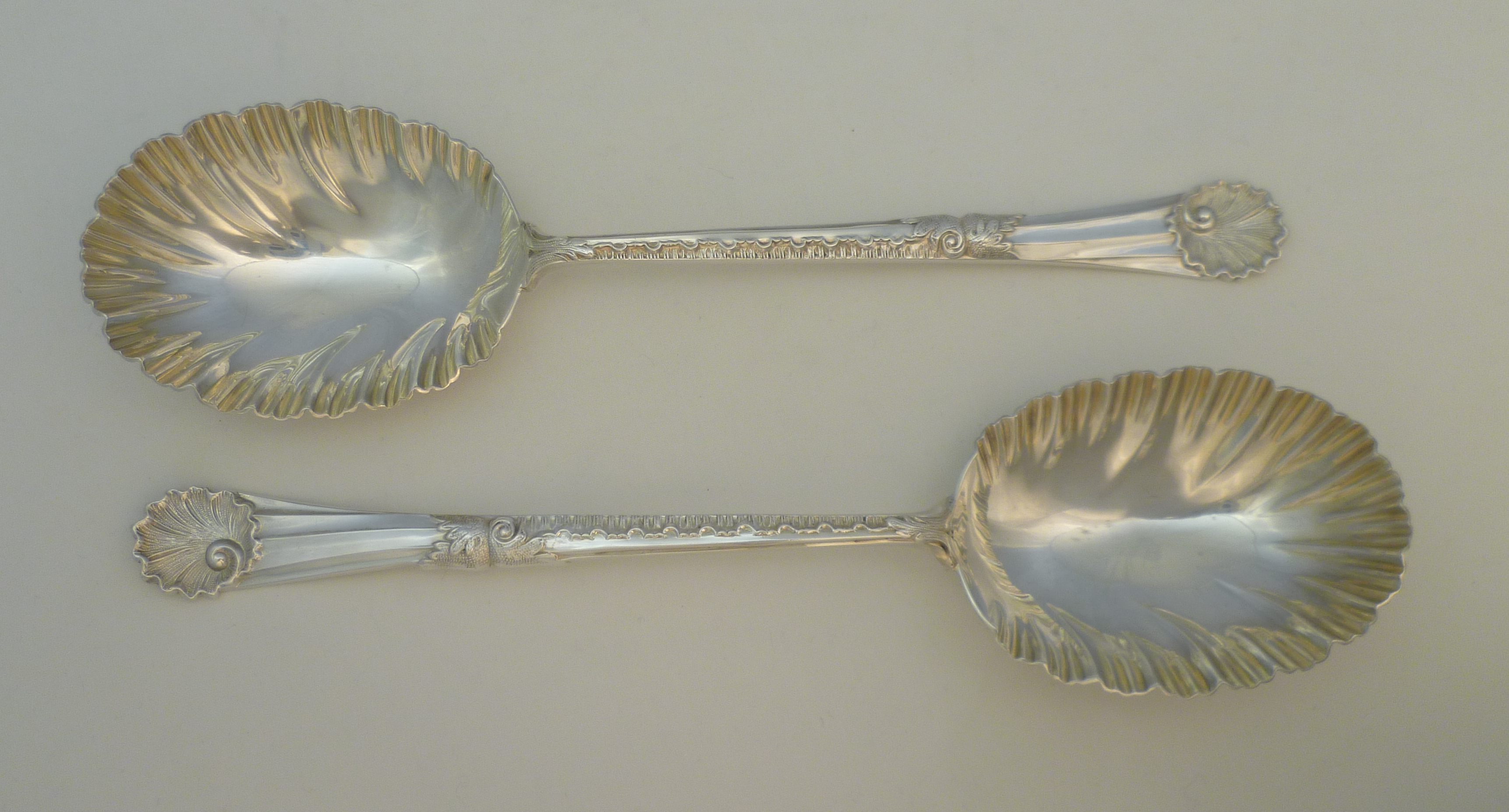 DESCRIPTION | High quality and heavy pair of Edwardian solid sterling silver rococo serving spoons with shell bowls, cast and engraved stem decoration and beautifully detailed shell terminals. |