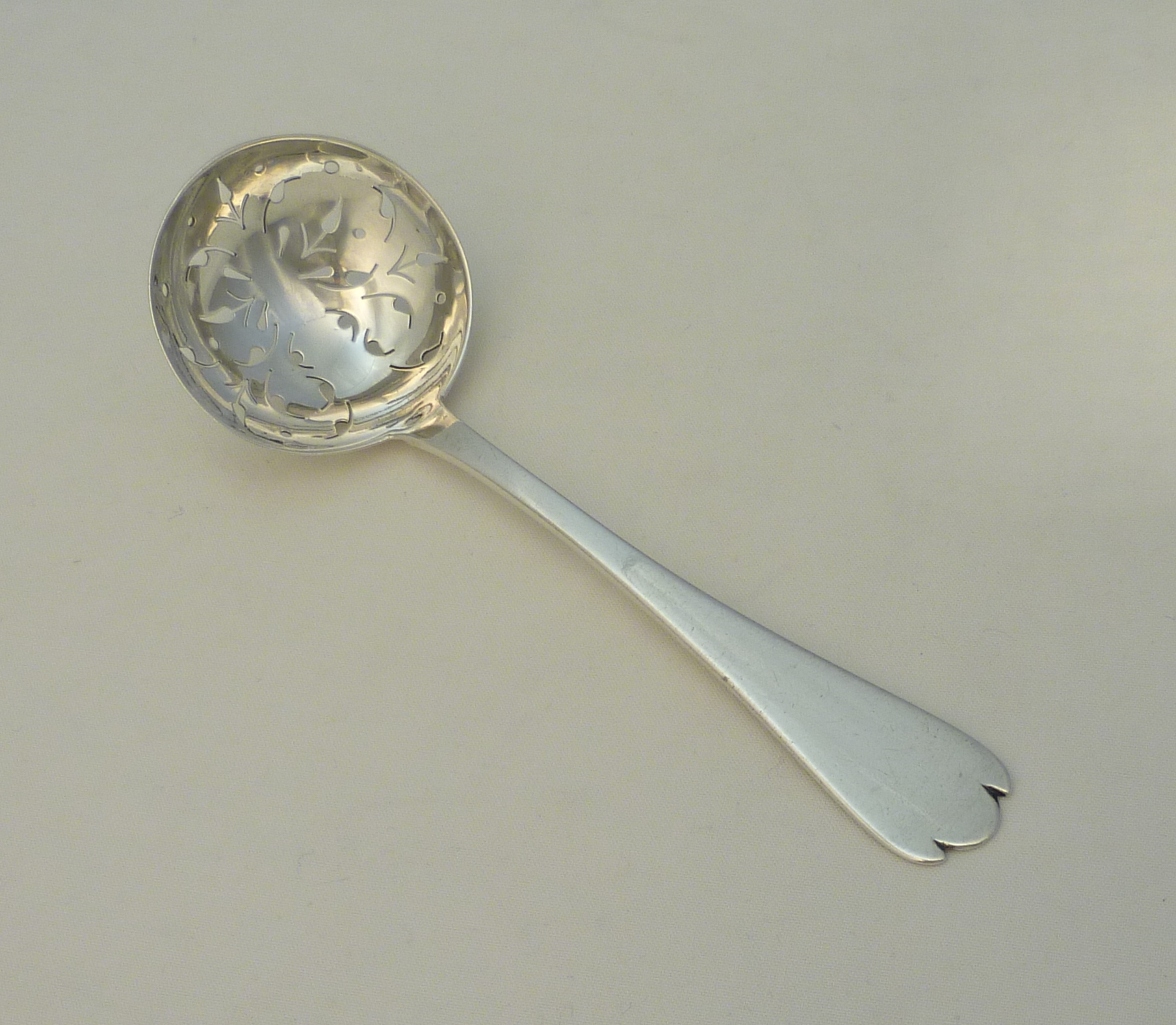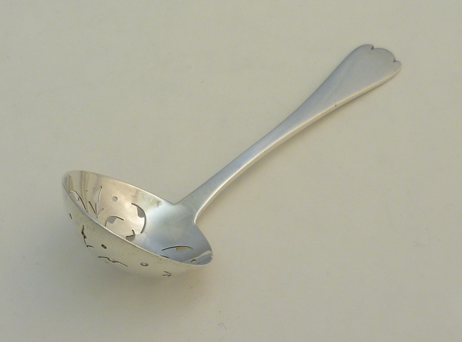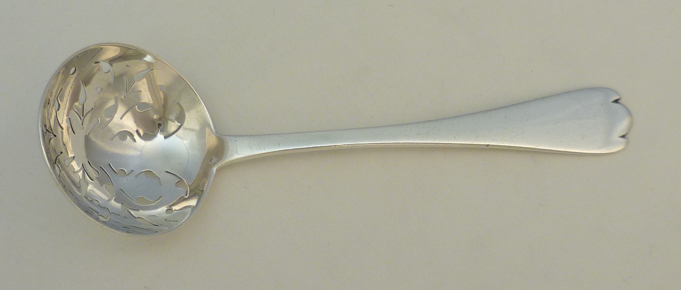 DESCRIPTION | Antique Edwardian solid sterling silver Trefid with Rat Tail pattern sifter ladle with a beautifully hand pierced bowl and no engraving or erasure. |