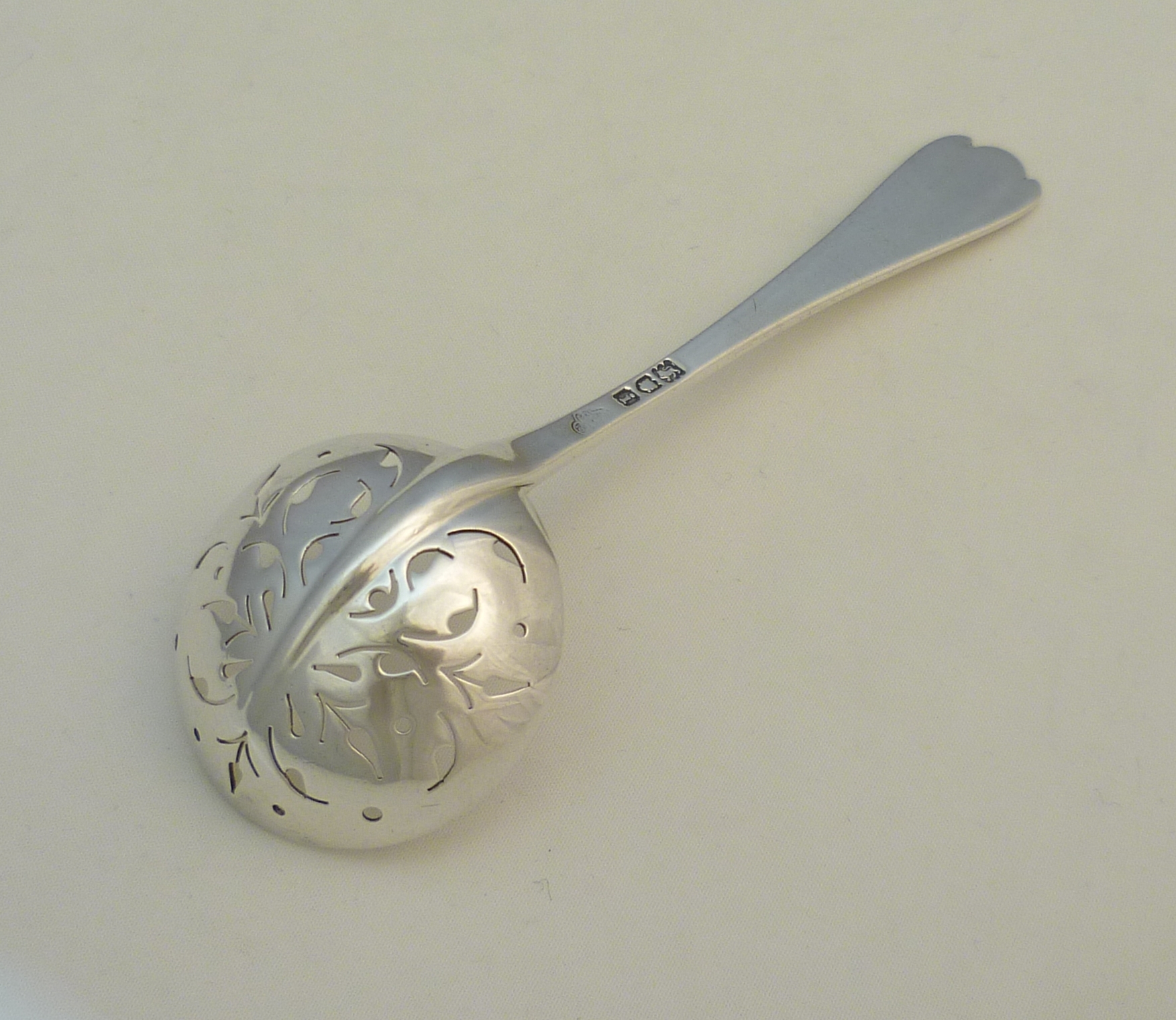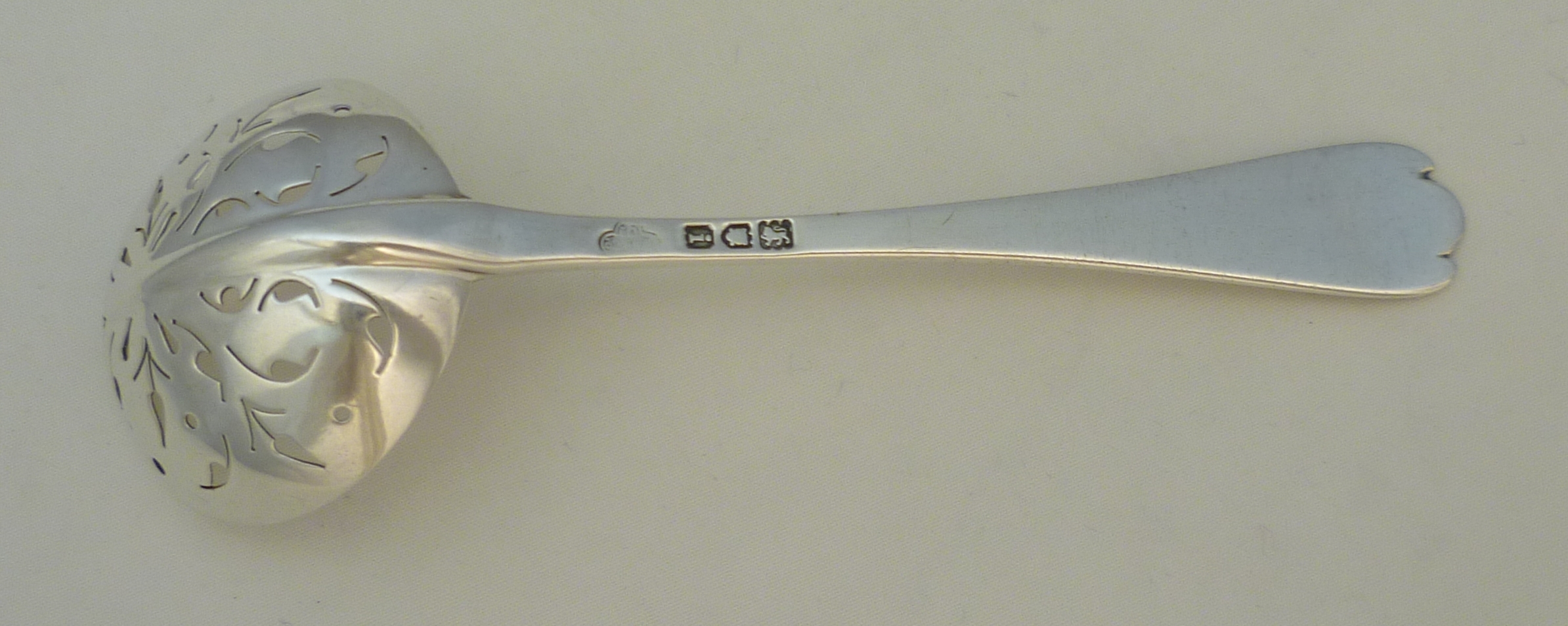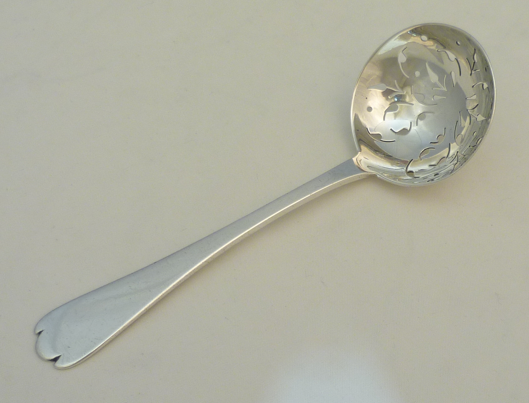 DESCRIPTION | Antique Edwardian solid sterling silver Trefid with Rat Tail pattern sifter ladle with a beautifully hand pierced bowl and no engraving or erasure. |