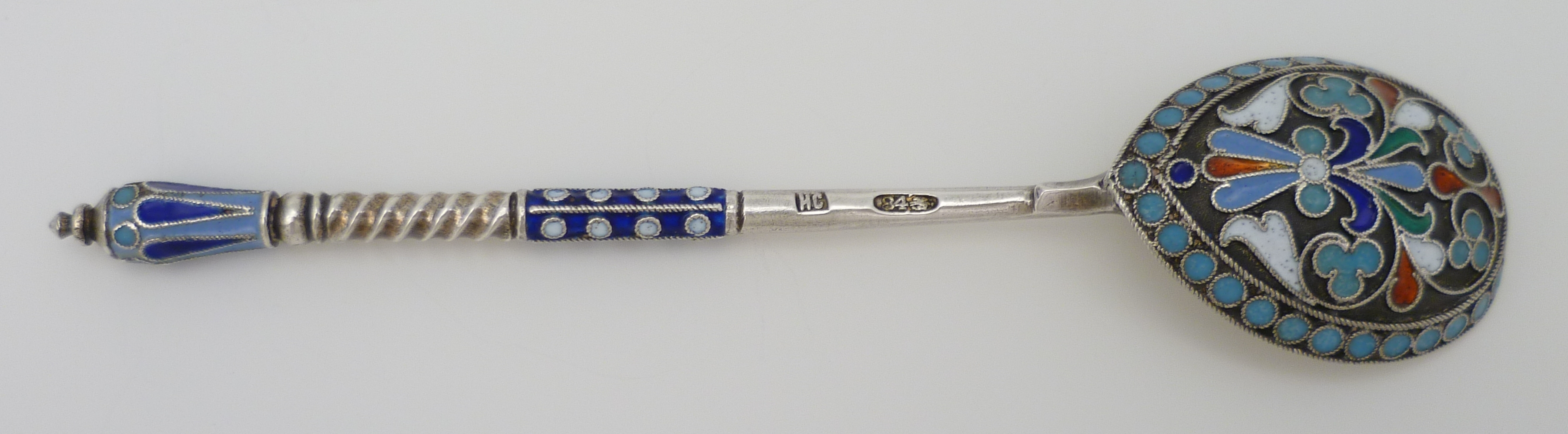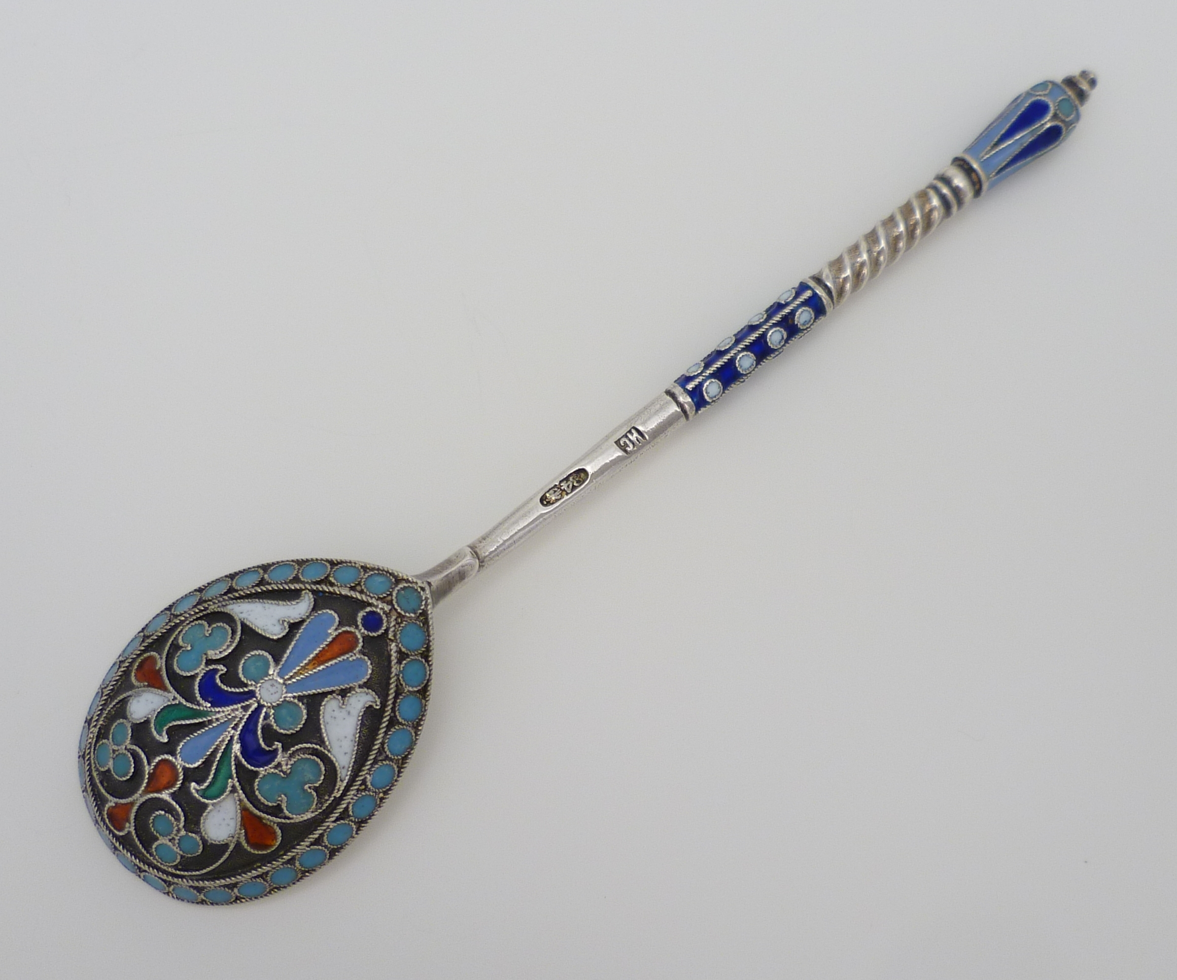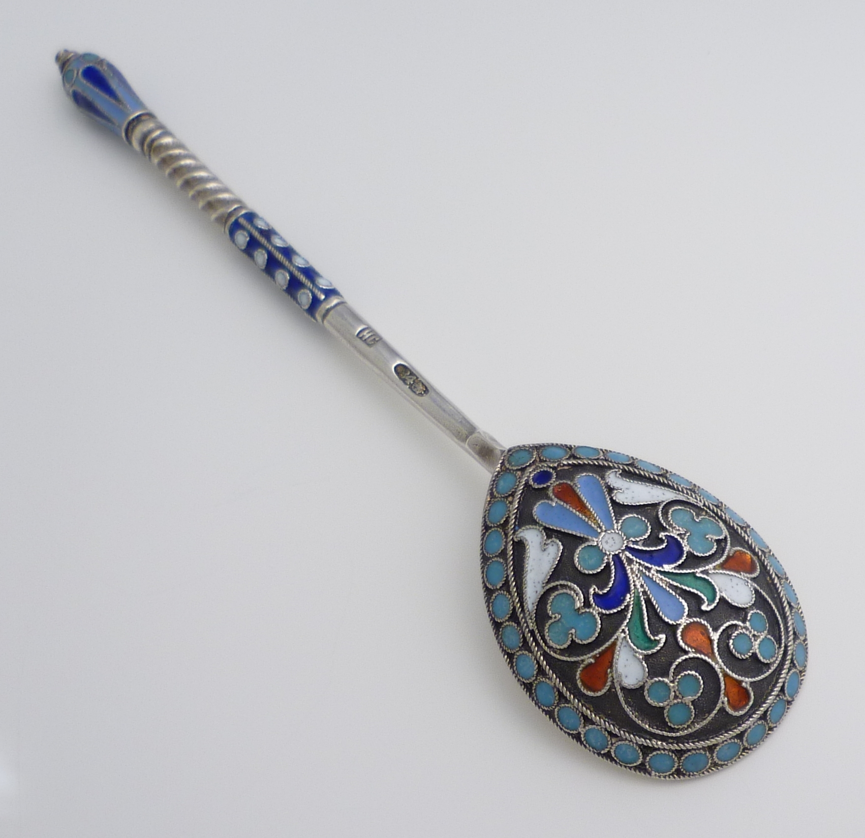 DESCRIPTION | Antique Russian solid silver spoon (lozhka) with cloisonne enamel and filigree decoration. |