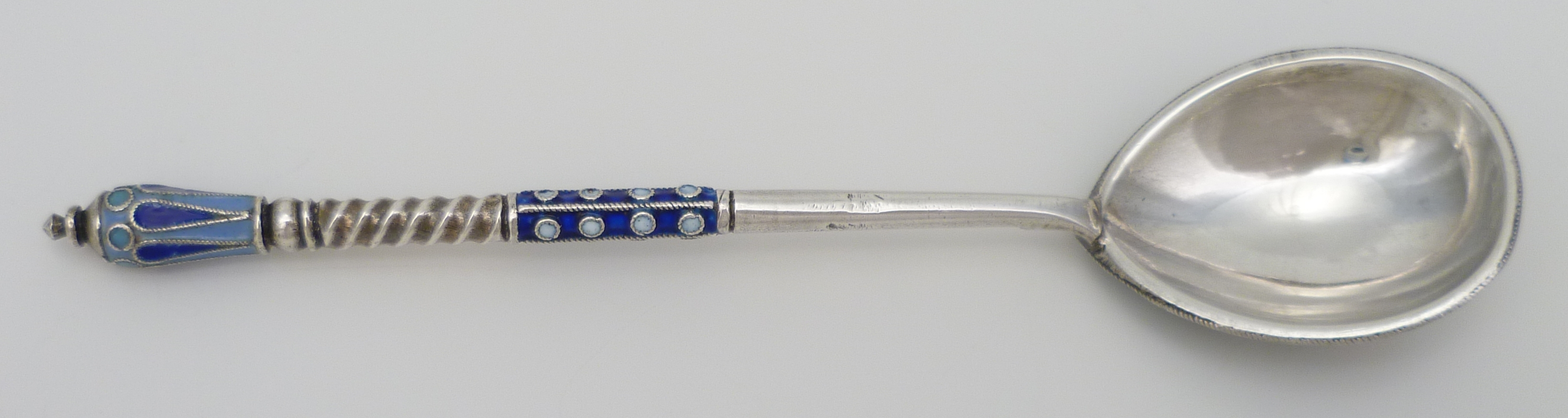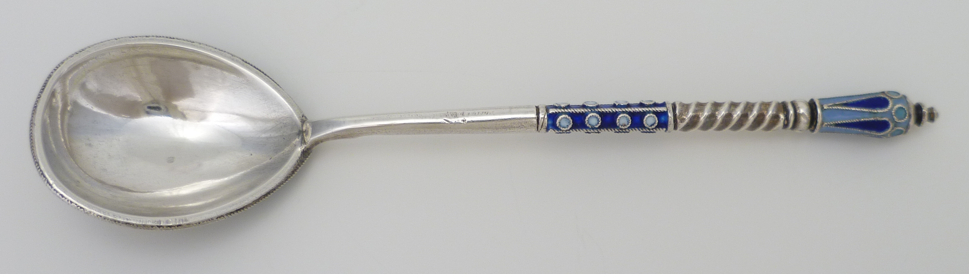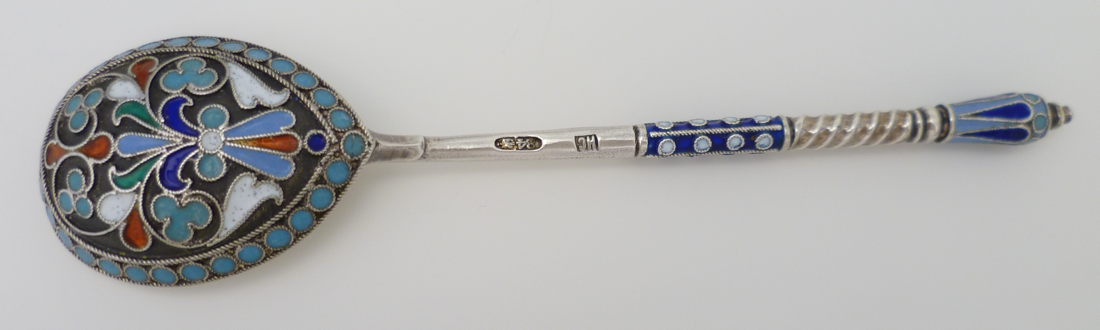 DESCRIPTION | Antique Russian solid silver spoon (lozhka) with cloisonne enamel and filigree decoration. |