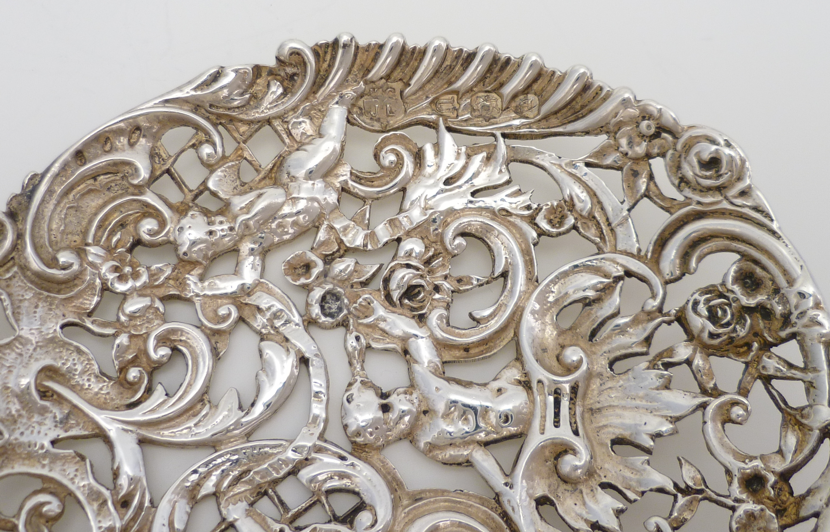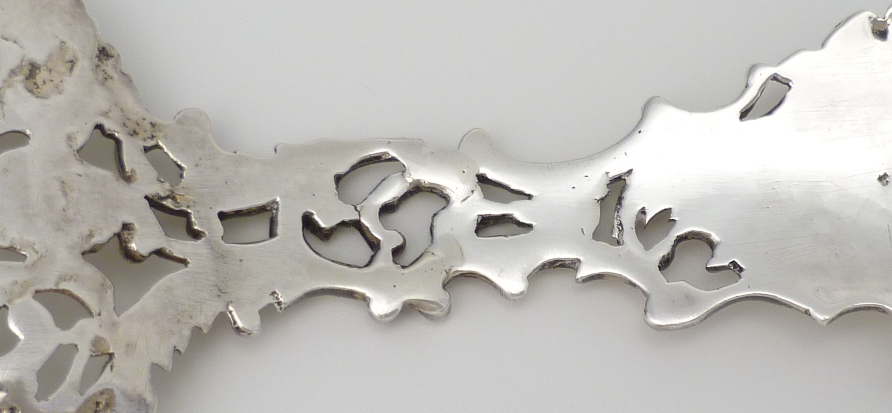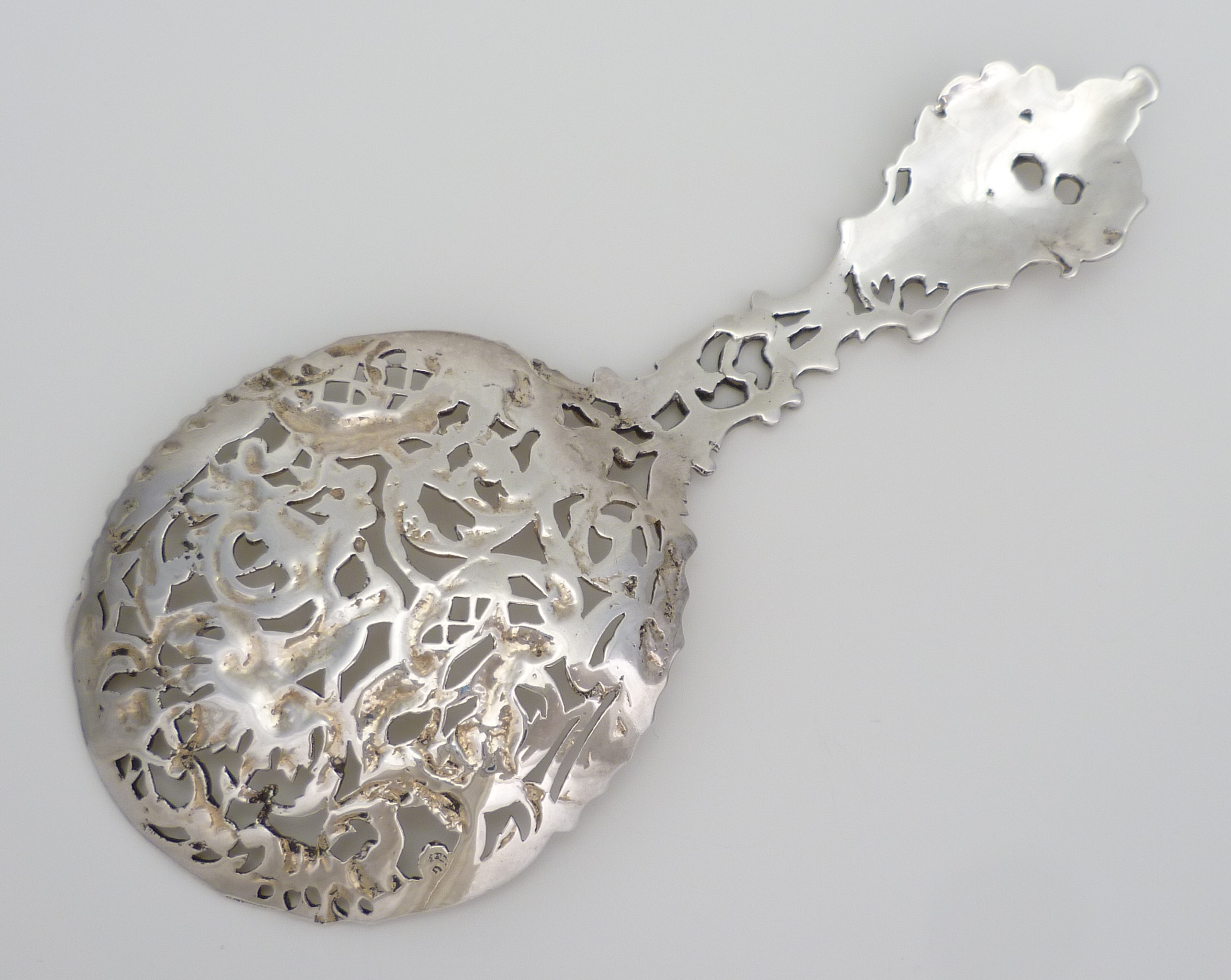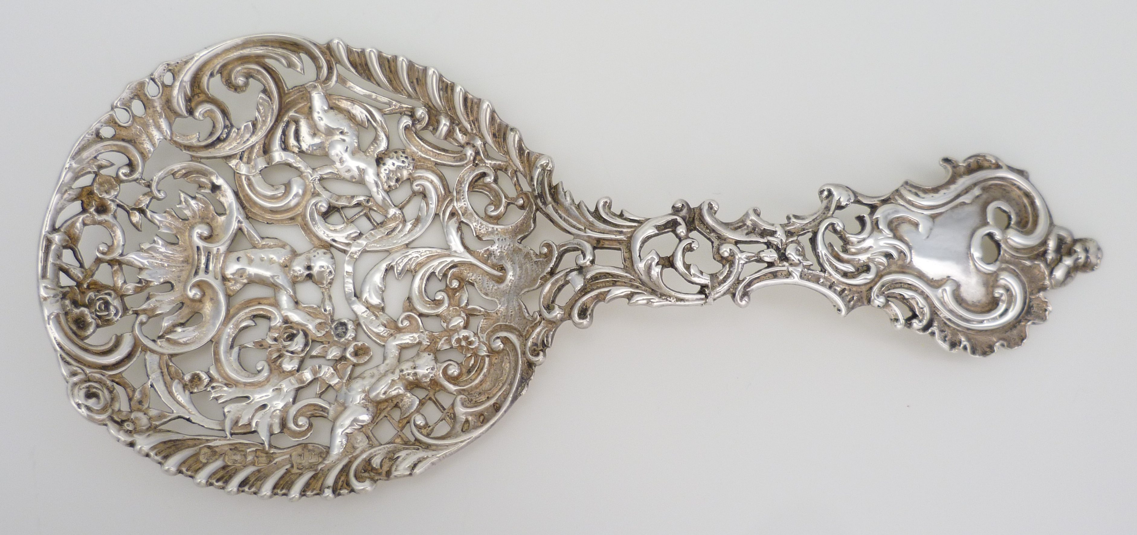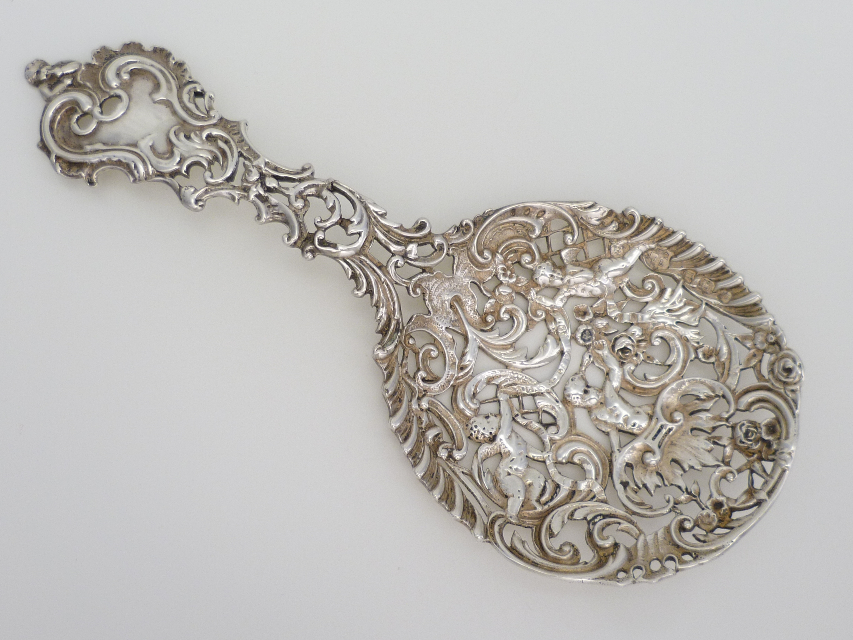 DESCRIPTION | Antique English Victorian cast, pierced and engraved solid sterling silver spoon with cherub and rococo scroll decoration. |