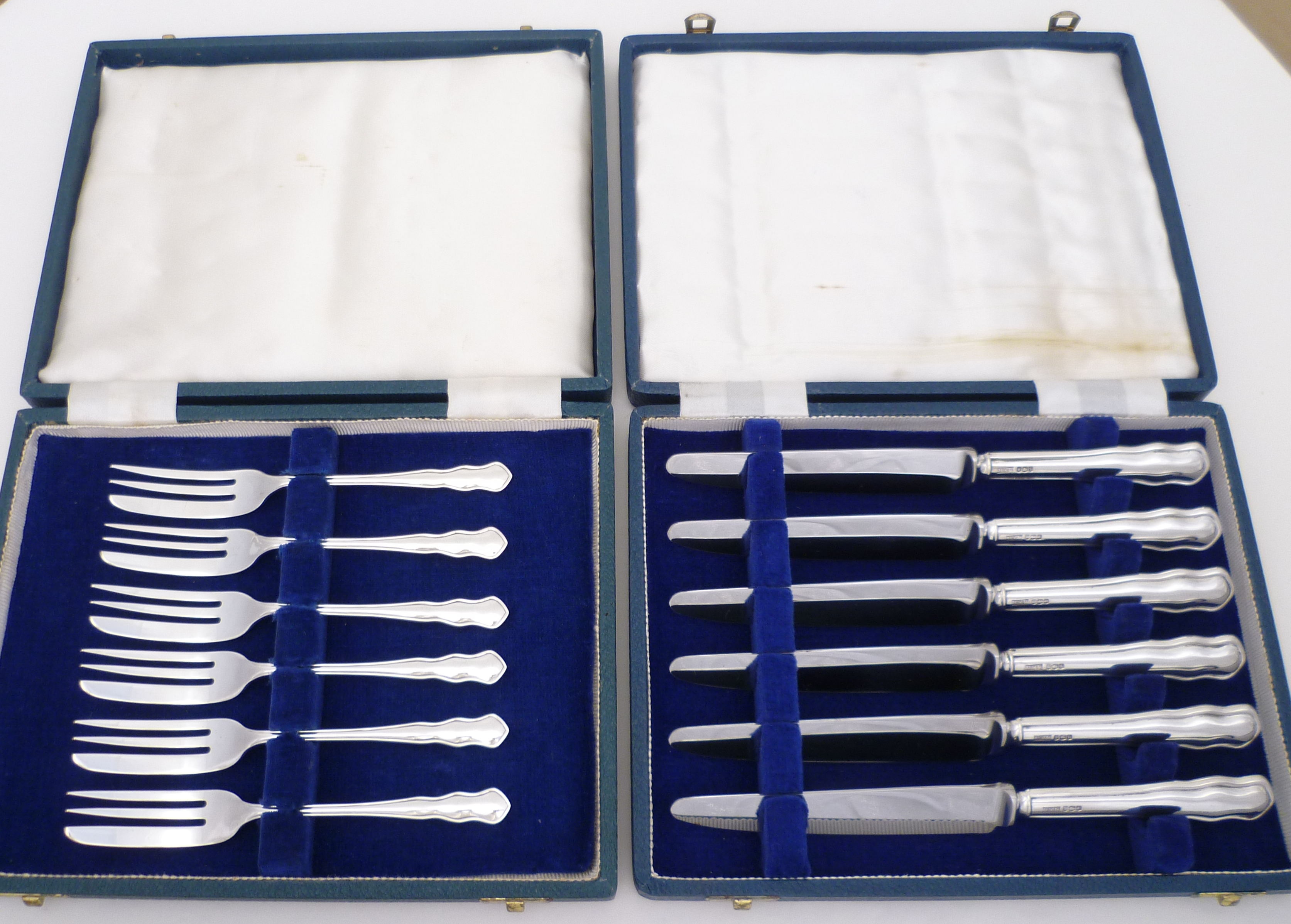 DESCRIPTION | Cased set of six solid sterling silver pastry or cake forks and a cased set of the matching silver handled tea knives. The knives have stainless steel blades and soldered joints to the handles so can be cleaned in a dishwasher. |