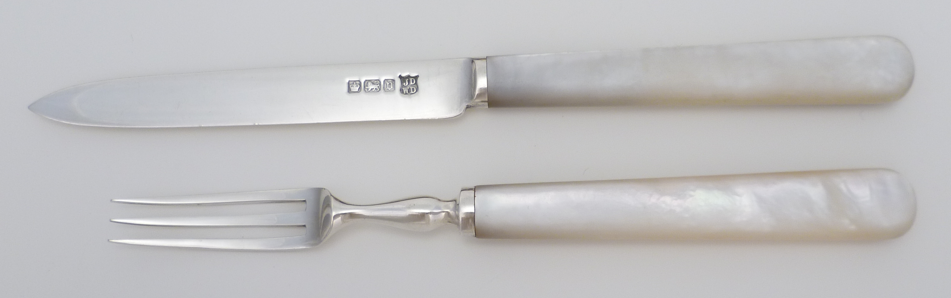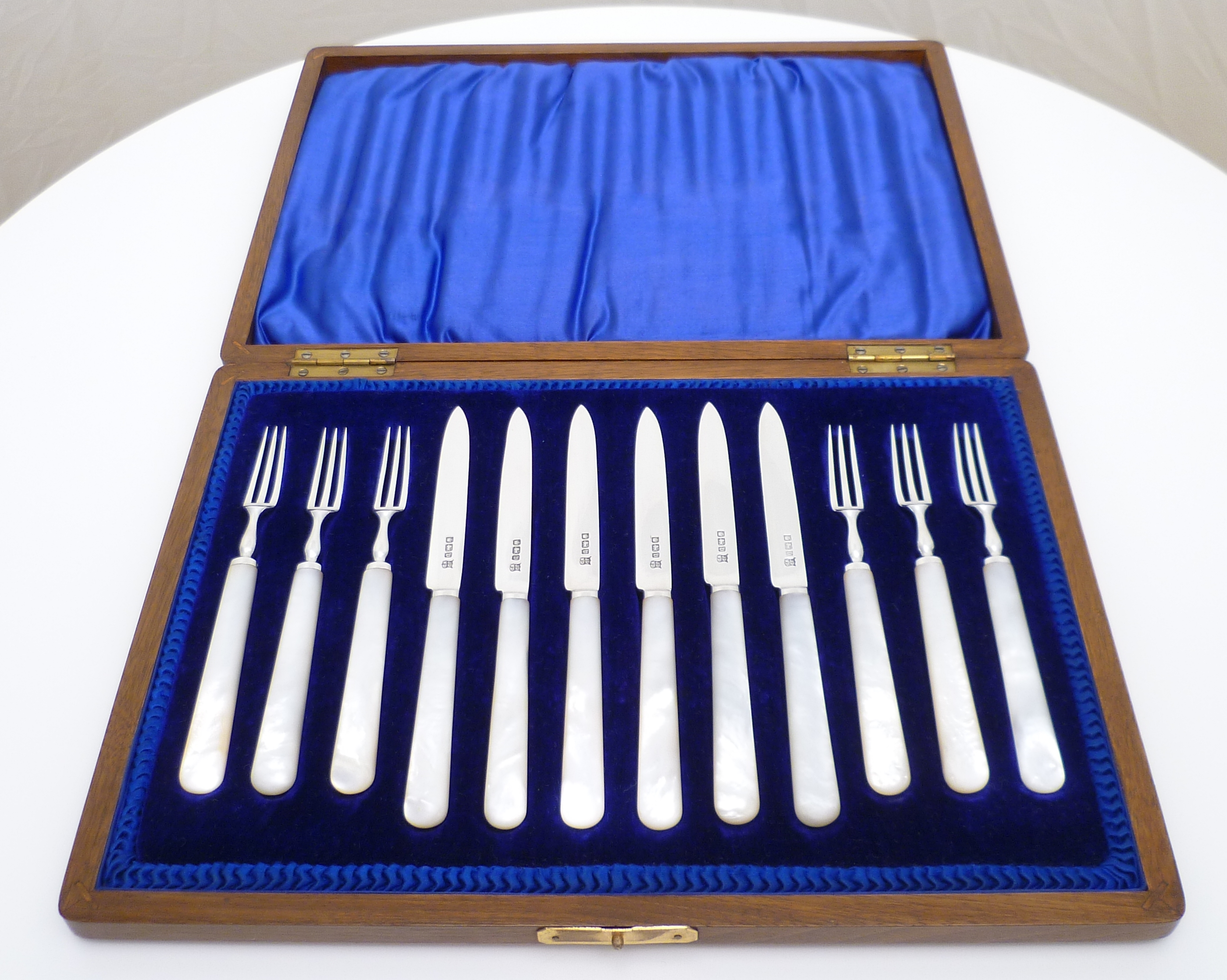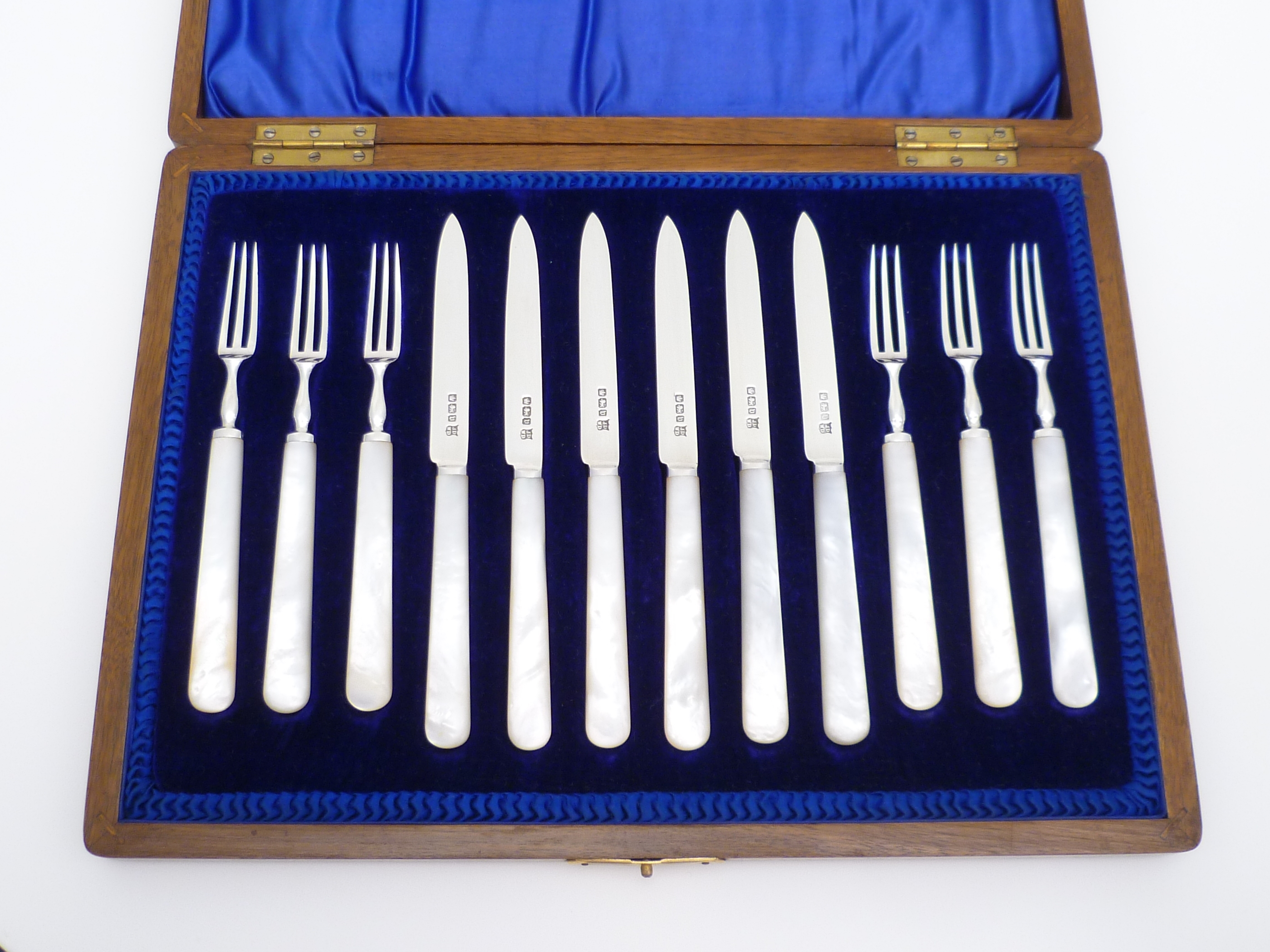 DESCRIPTION | Beautiful case, beautiful contents. Antique English solid sterling silver fruit set with mother of pearl handles. Highest quality throughout. Velvet and silk lined fully fitted solid wood case with contents that have never been used. |