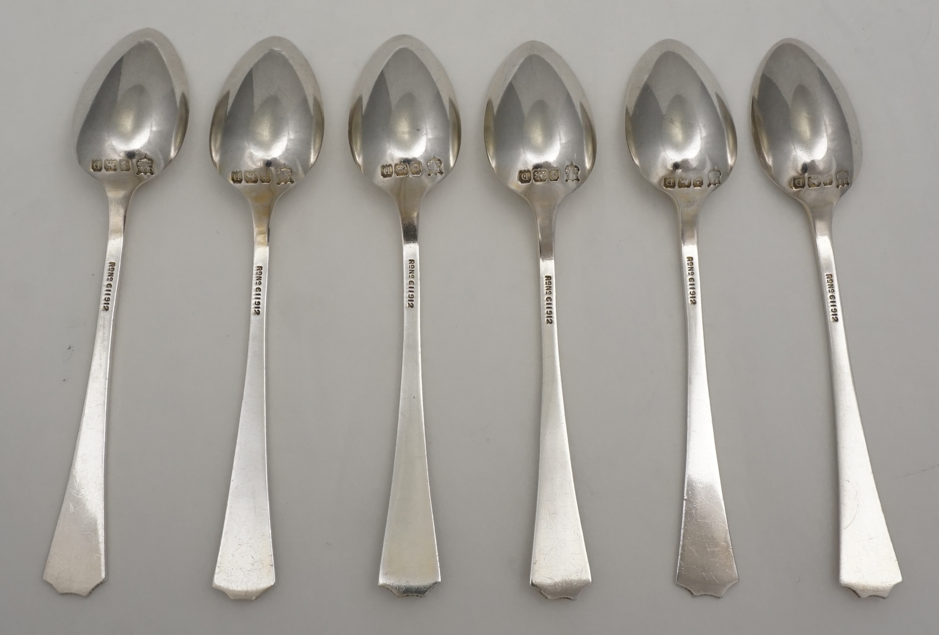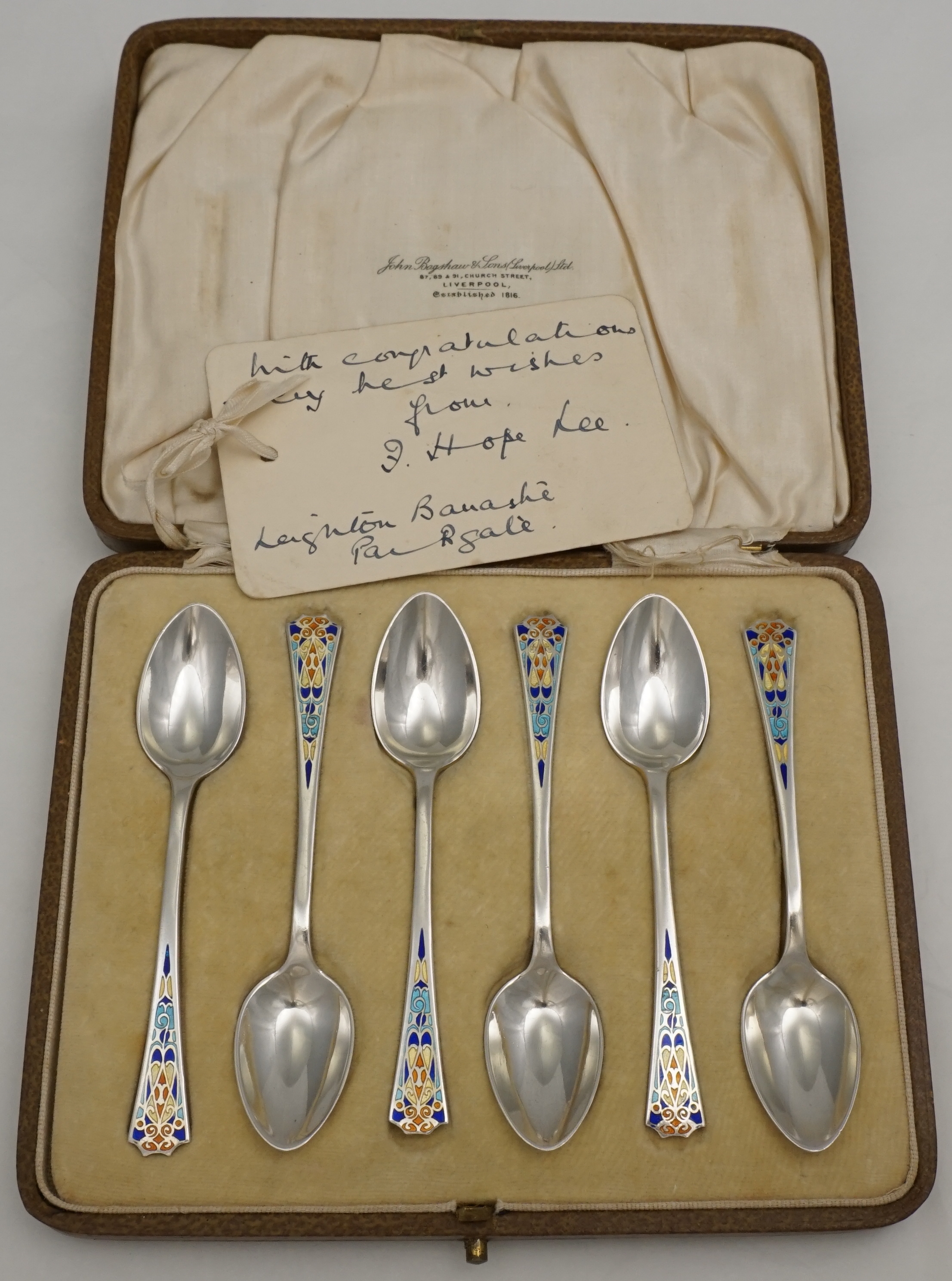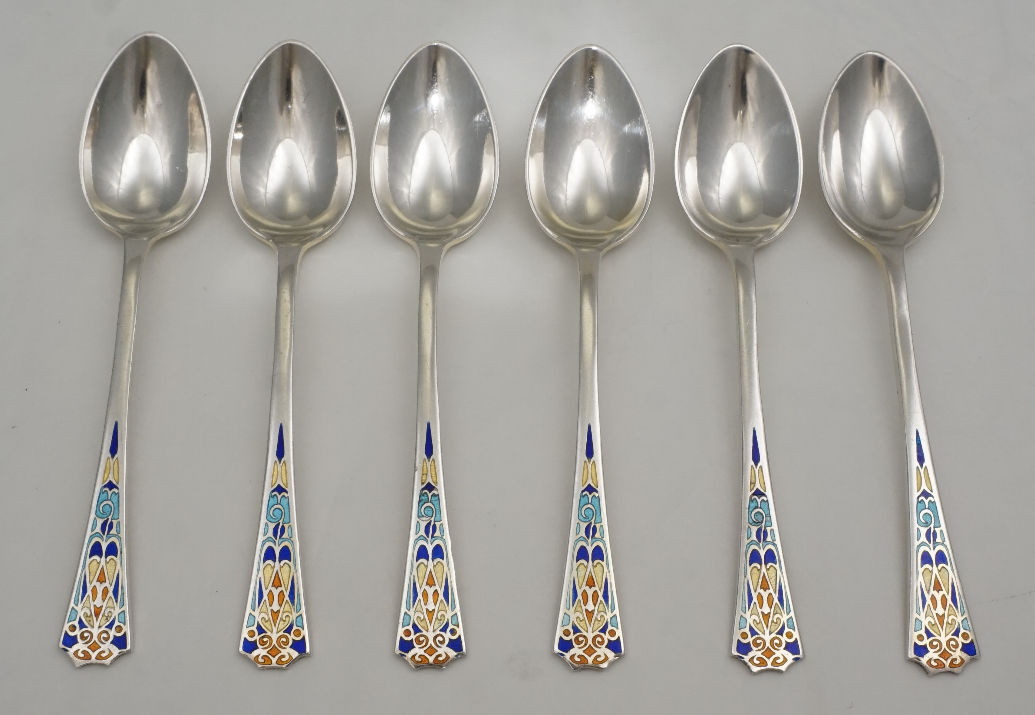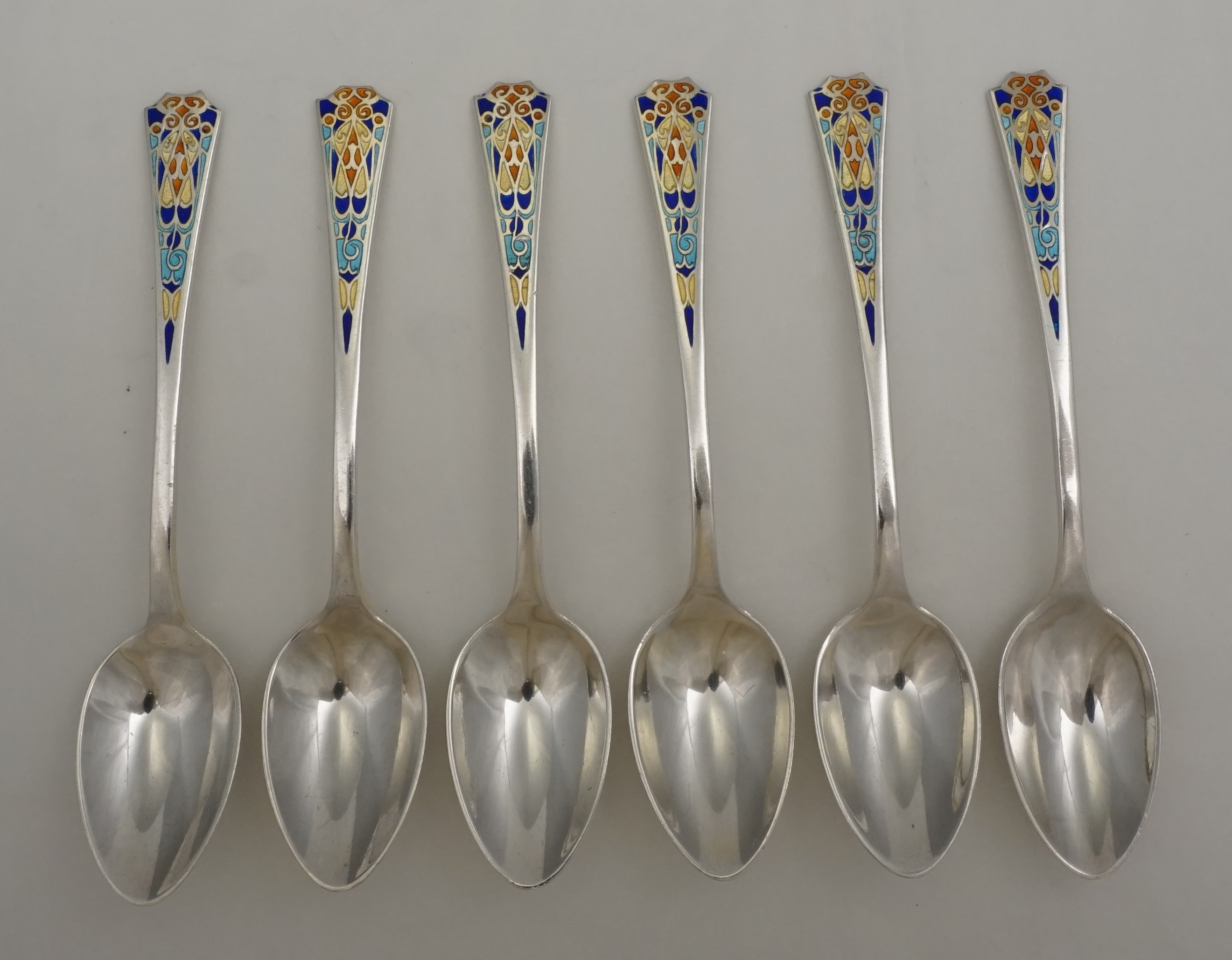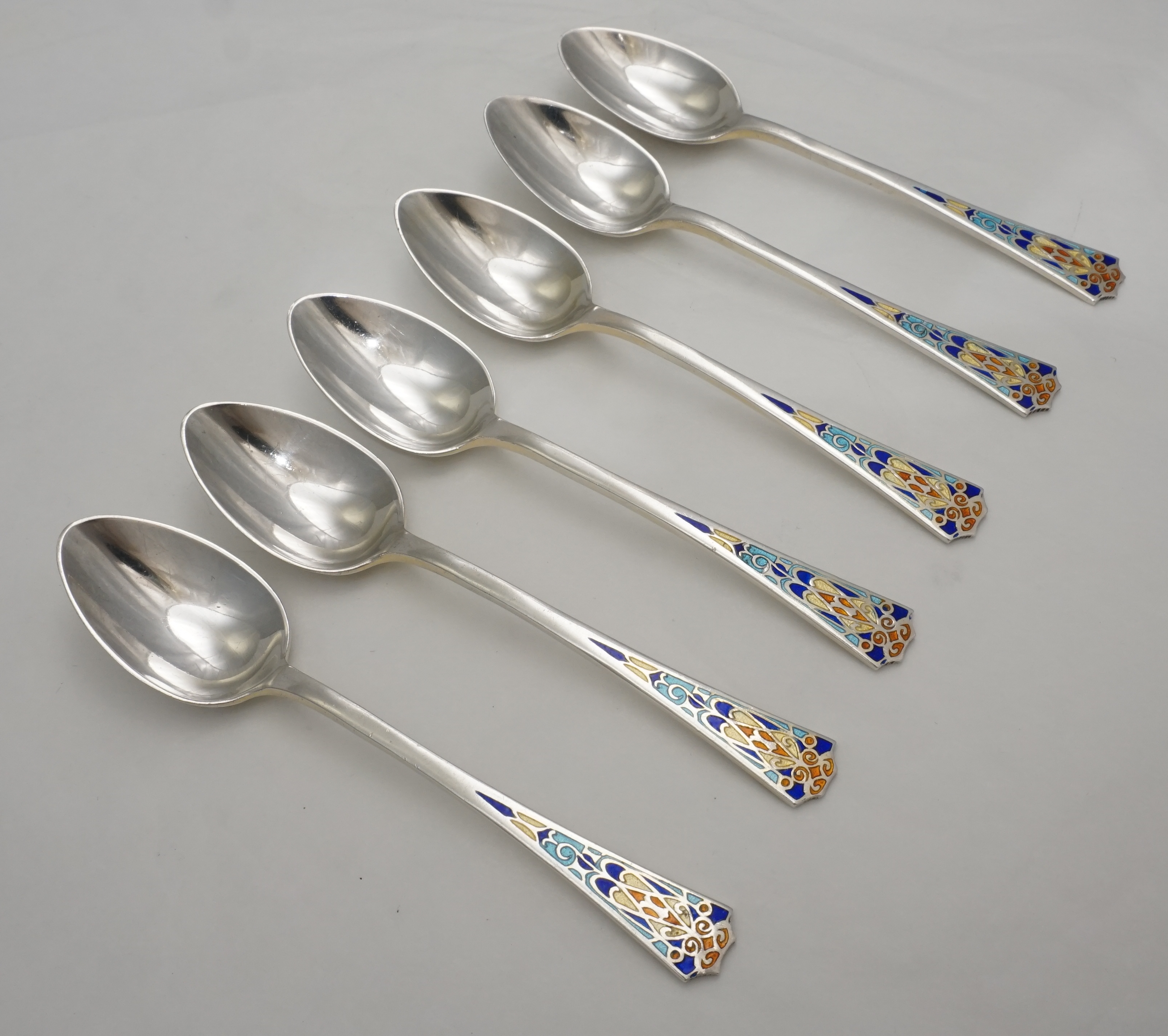 DESCRIPTION | Beautiful and important set of six 'belle époque' enamel decorated solid sterling silver coffee spoons complete with original fitted case and presentation card. Design registration number 611912 dates to 1914 when World War I extinguished La Belle Epoque. |