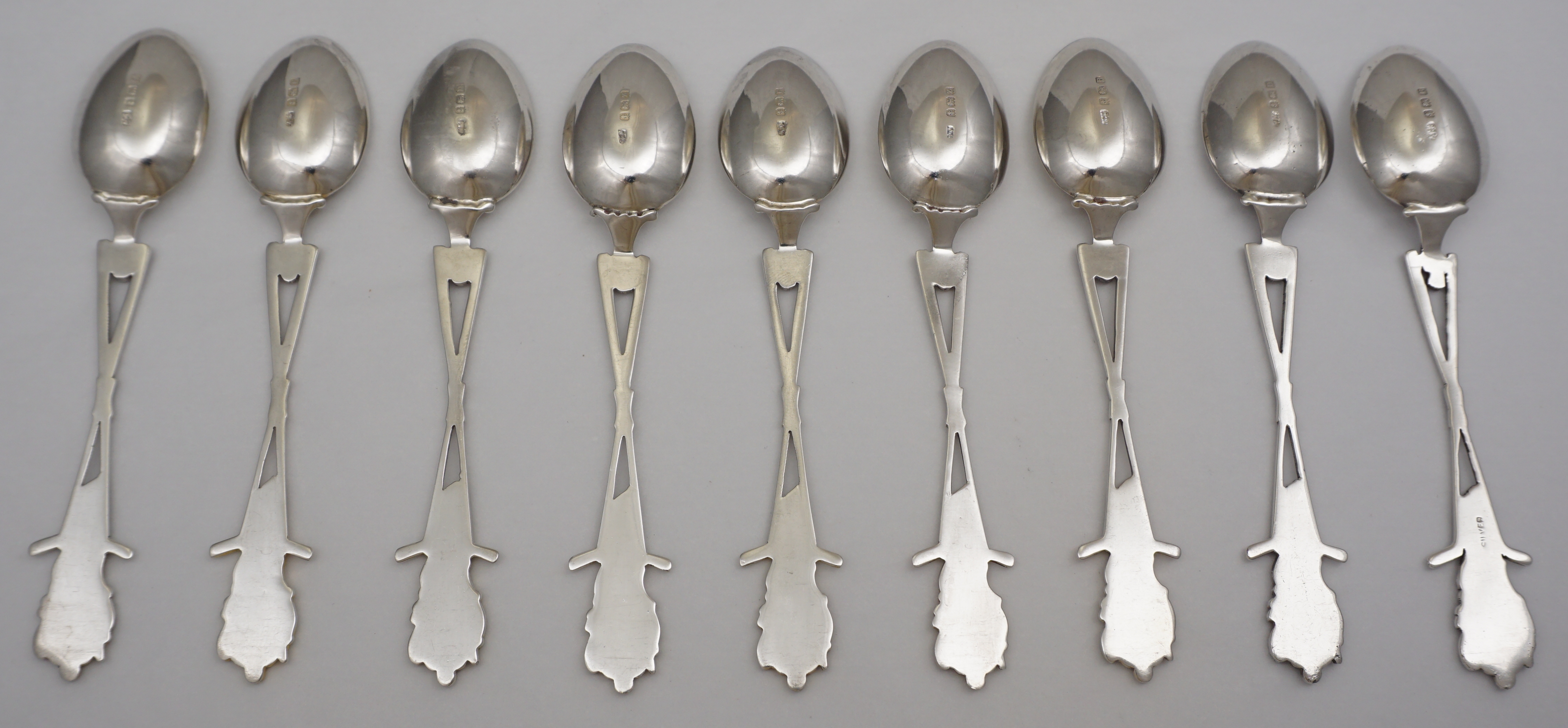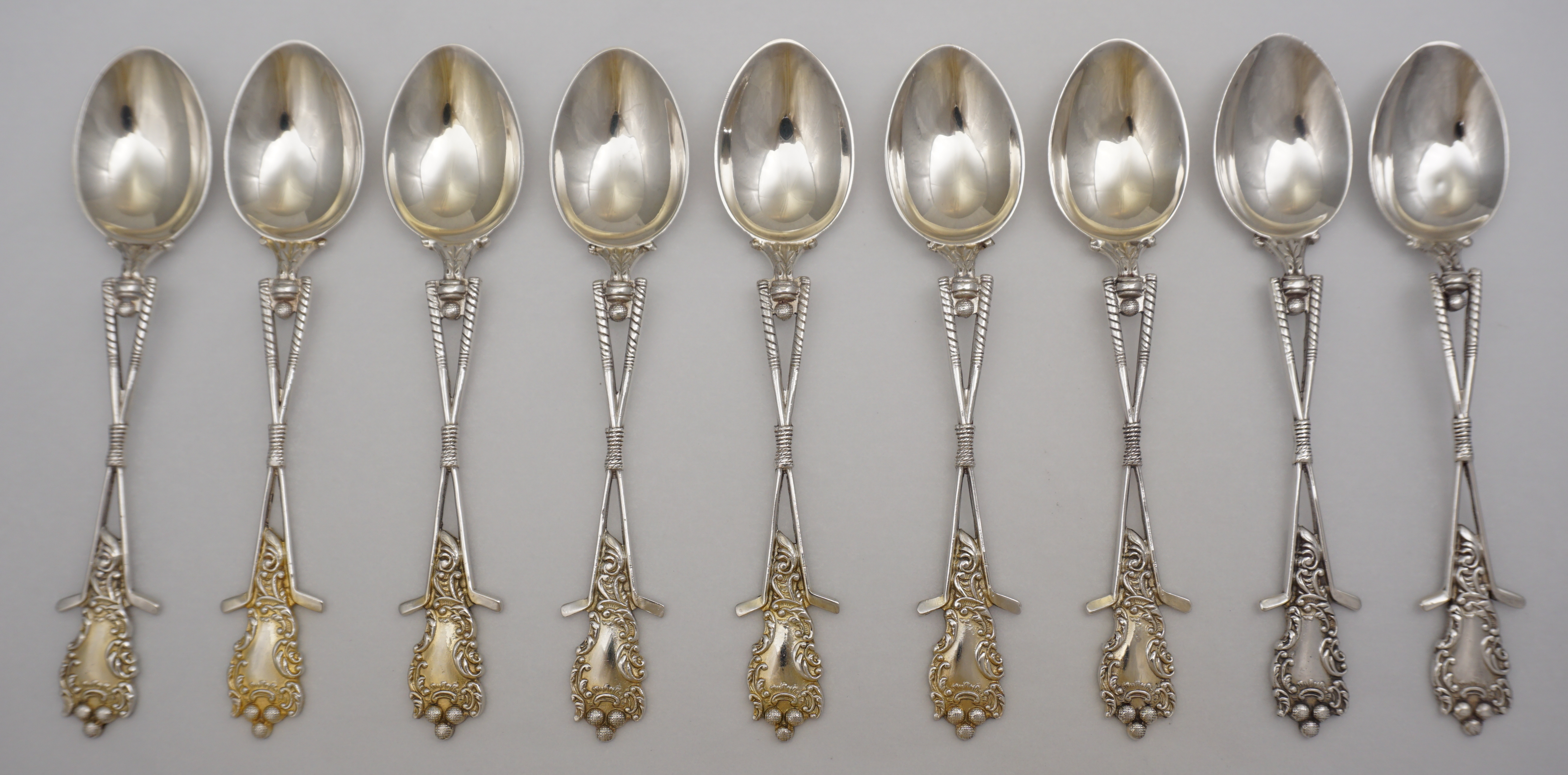 DESCRIPTION | Set of nine vintage English solid sterling silver golf inspired teaspoons. |