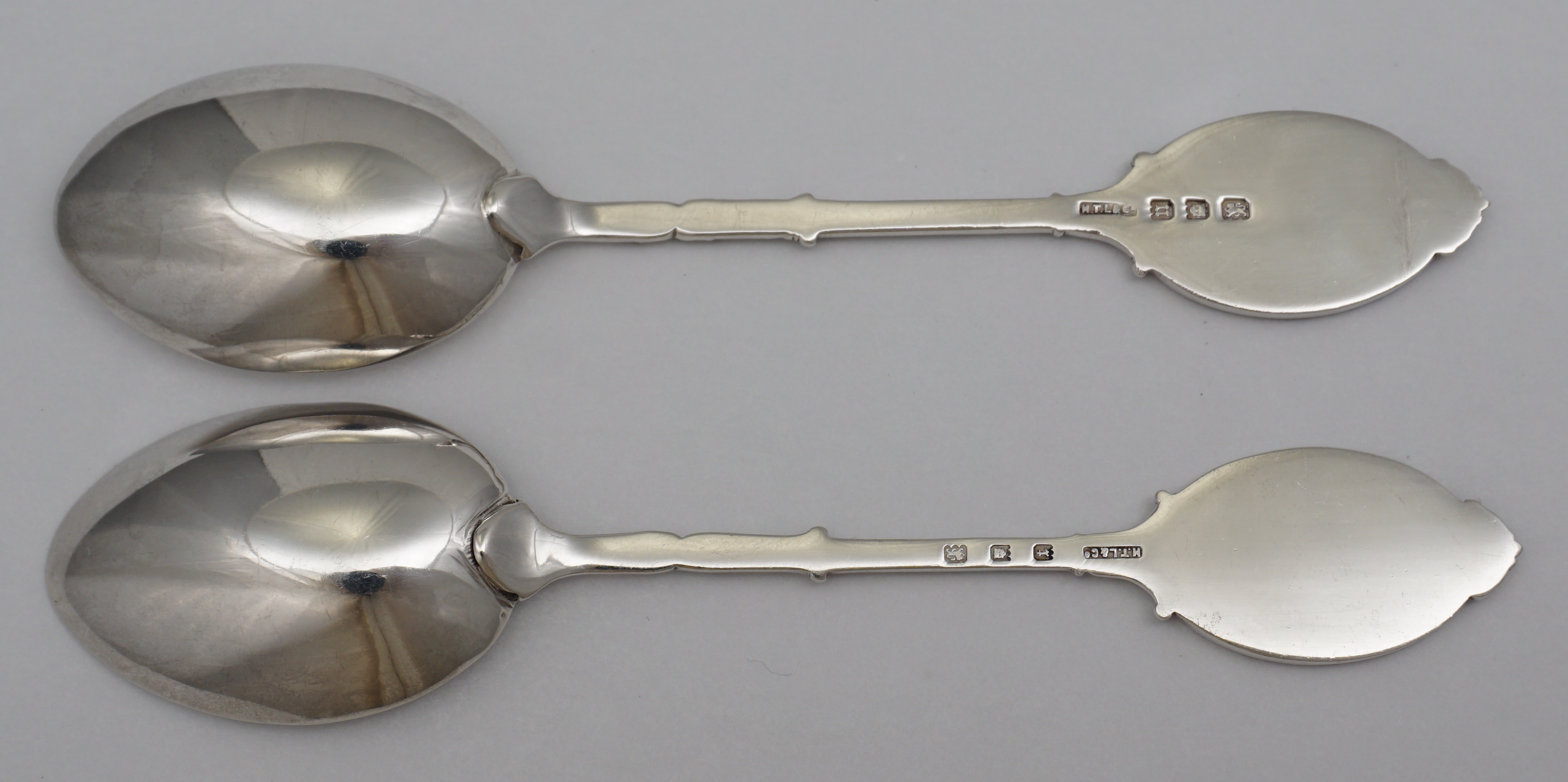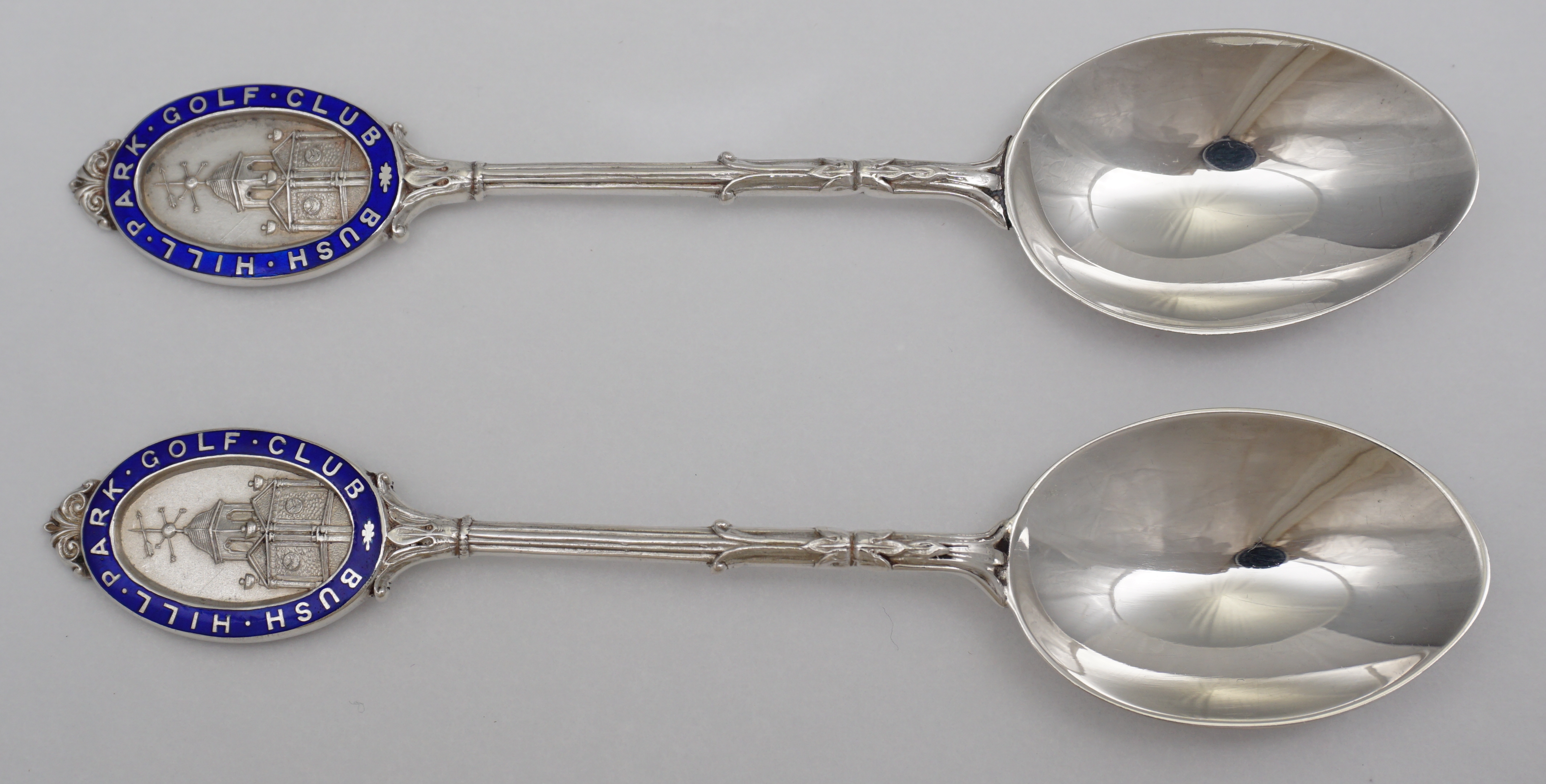 DESCRIPTION | Two vintage English solid sterling silver spoons with cast and enamel decoration celebrating 'Bush Hill Park Golf Club'. |