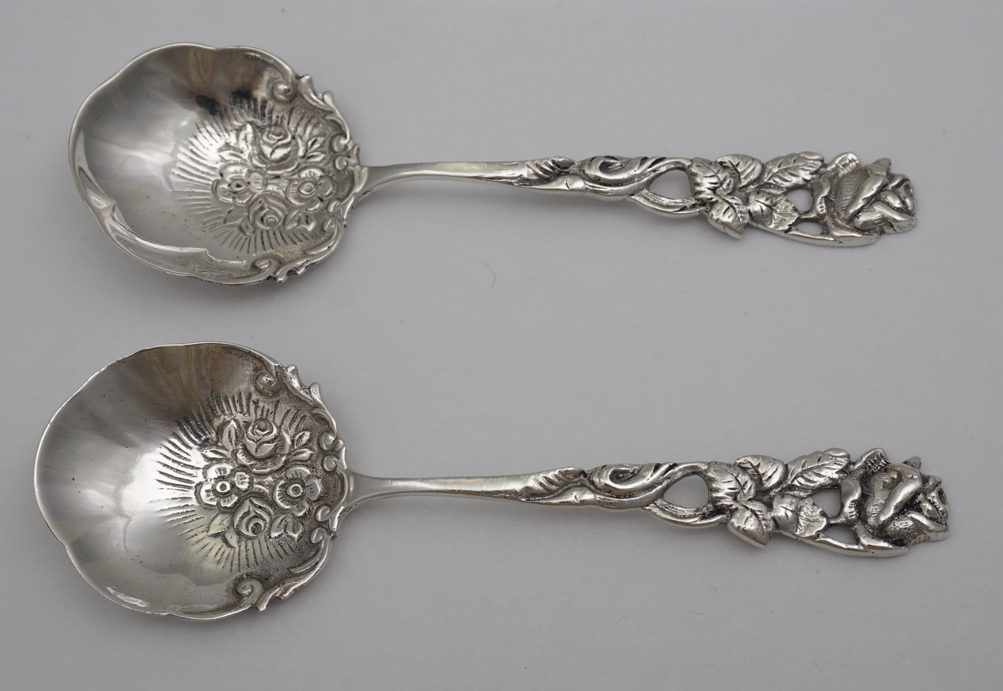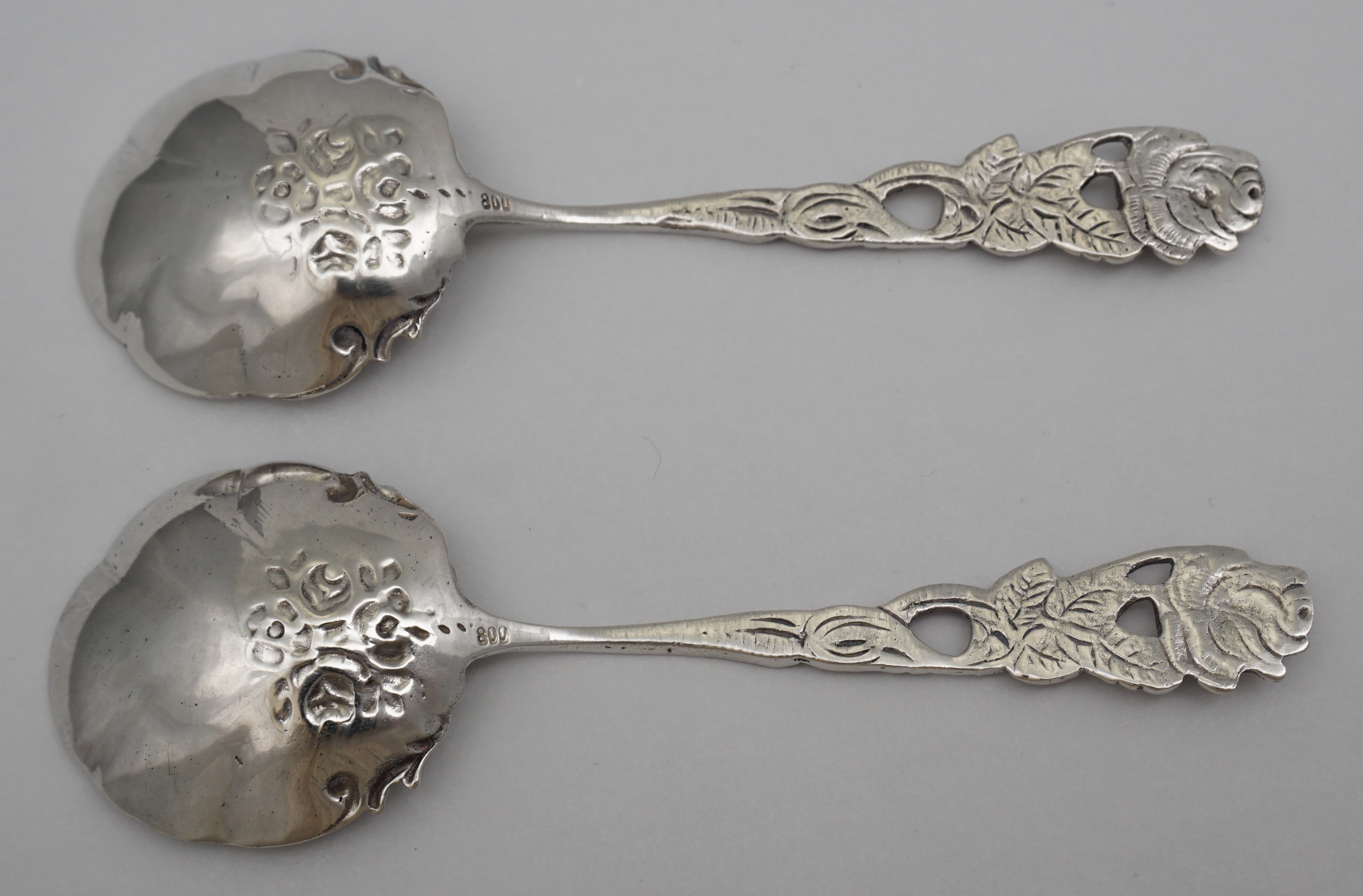 DESCRIPTION | Good quality and pretty little pair of vintage cast solid continental .800 grade silver jam spoons. Would be nice for an English cream tea, one for jam, one for clotted cream. |