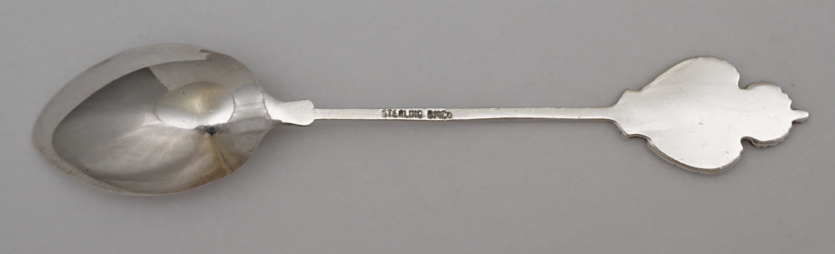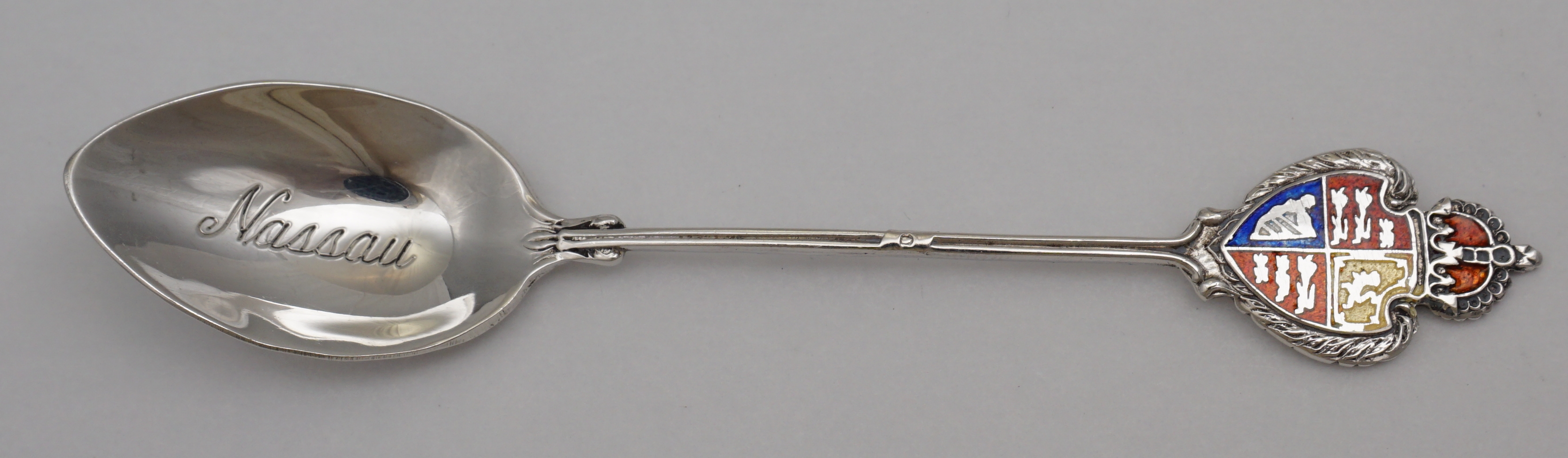 DESCRIPTION | Vintage solid sterling silver souvenir spoon from 'Nassau', Bahamas with enamel decoration. |