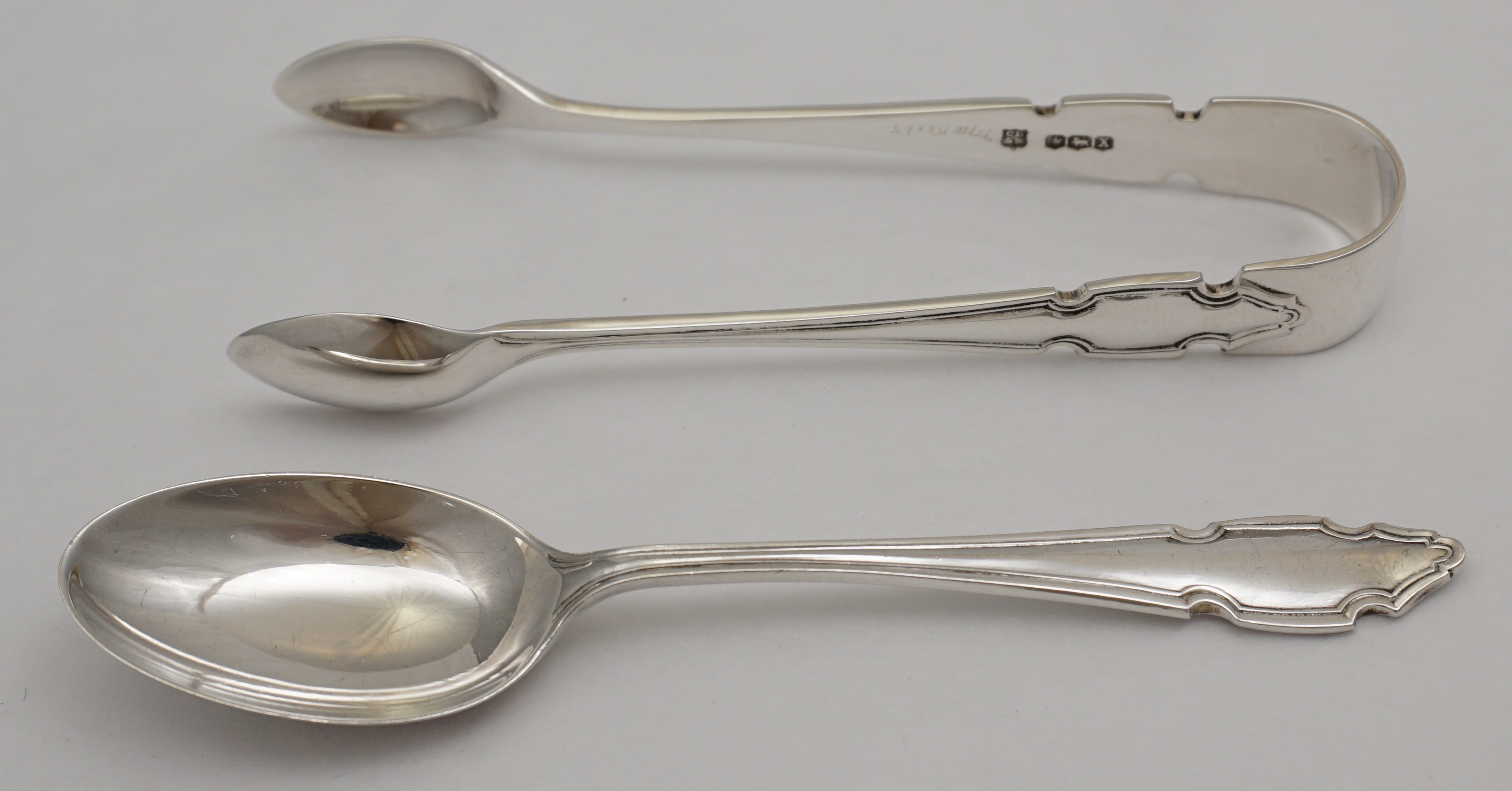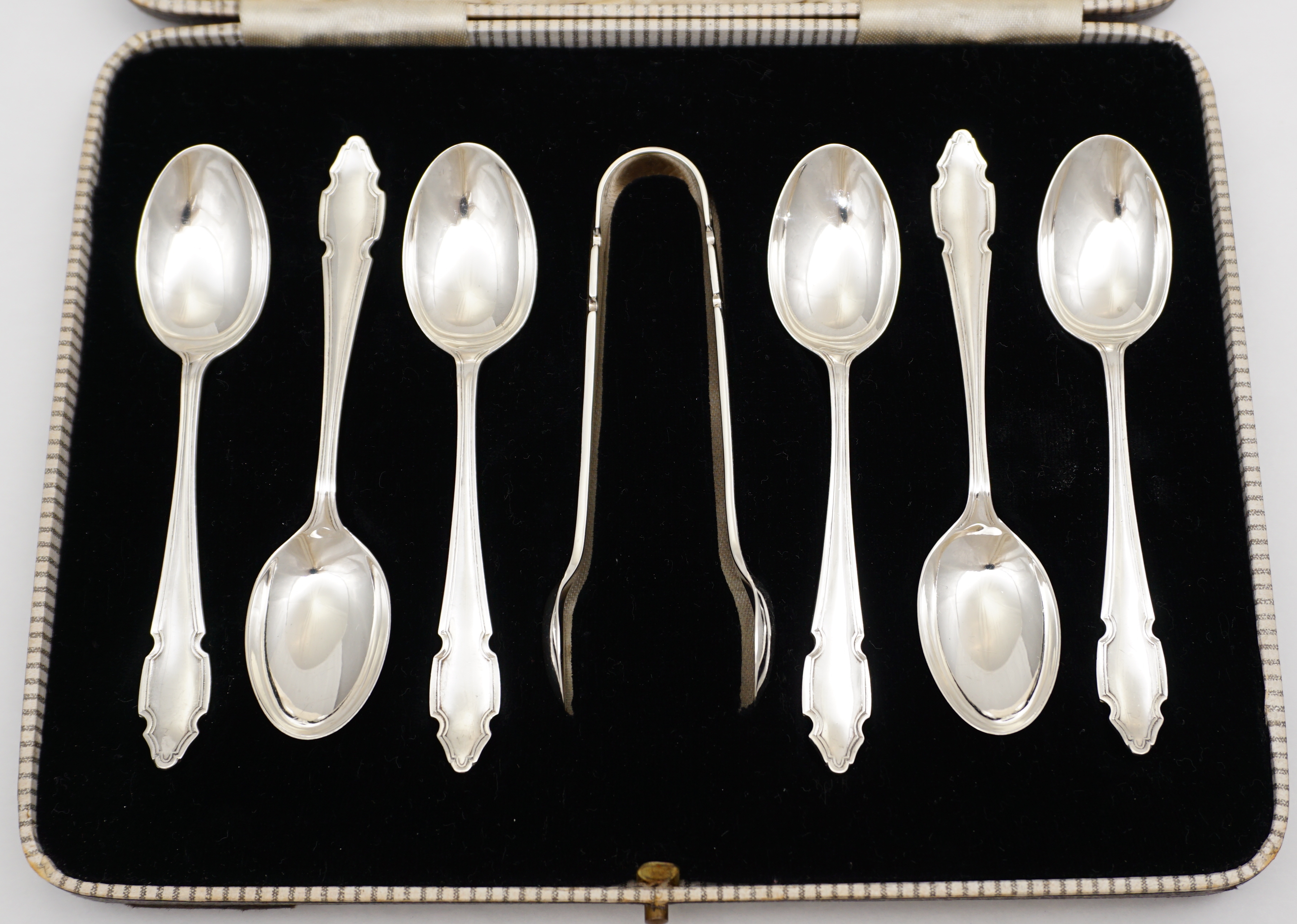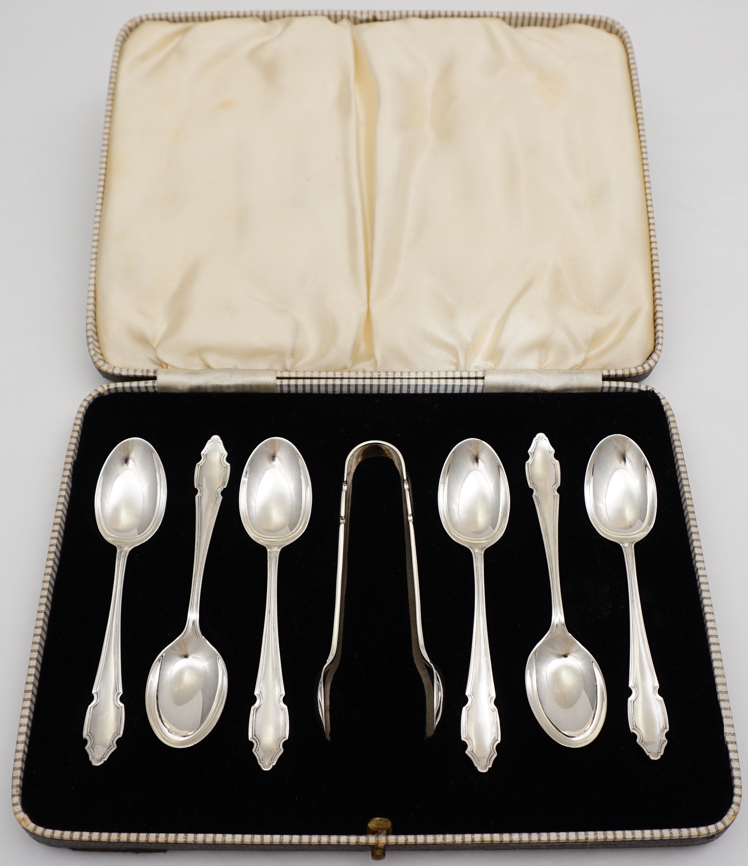 DESCRIPTION | Good and cased set of six vintage English solid sterling silver teaspoons with sugar tongs. |