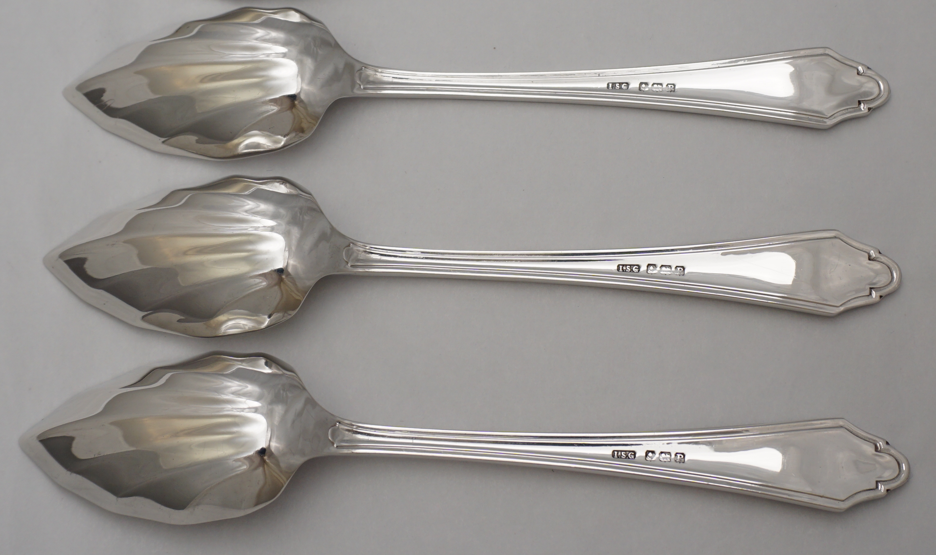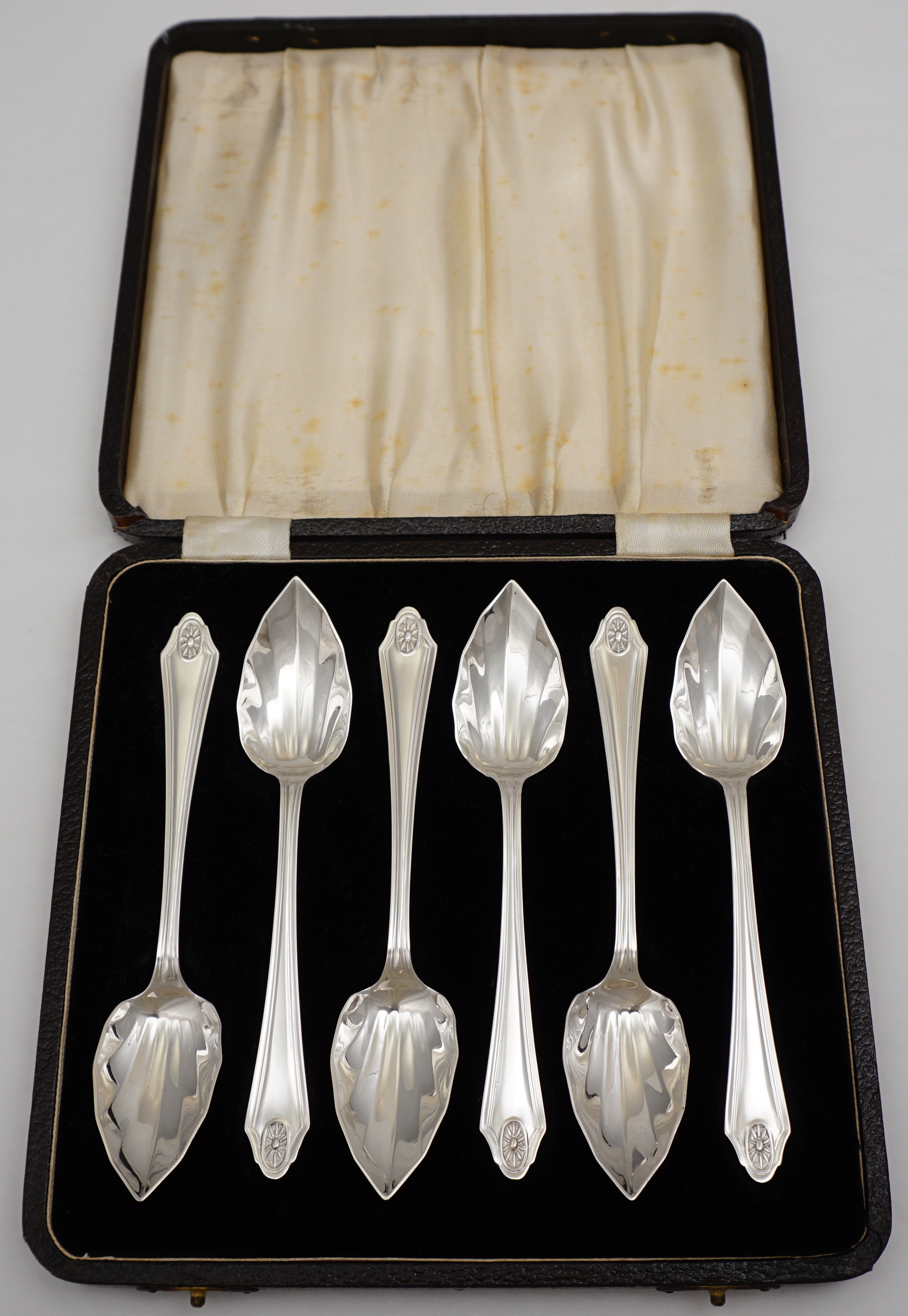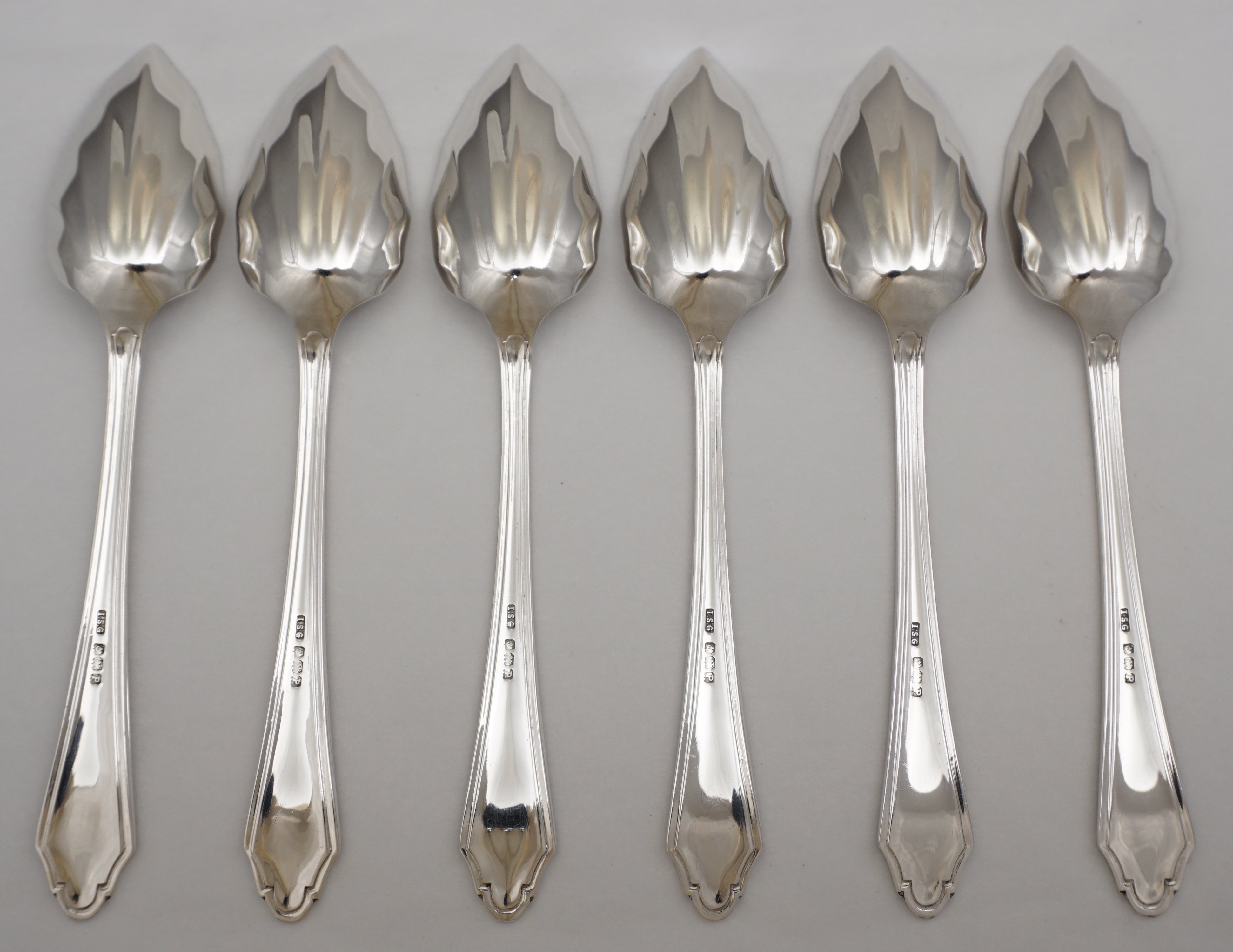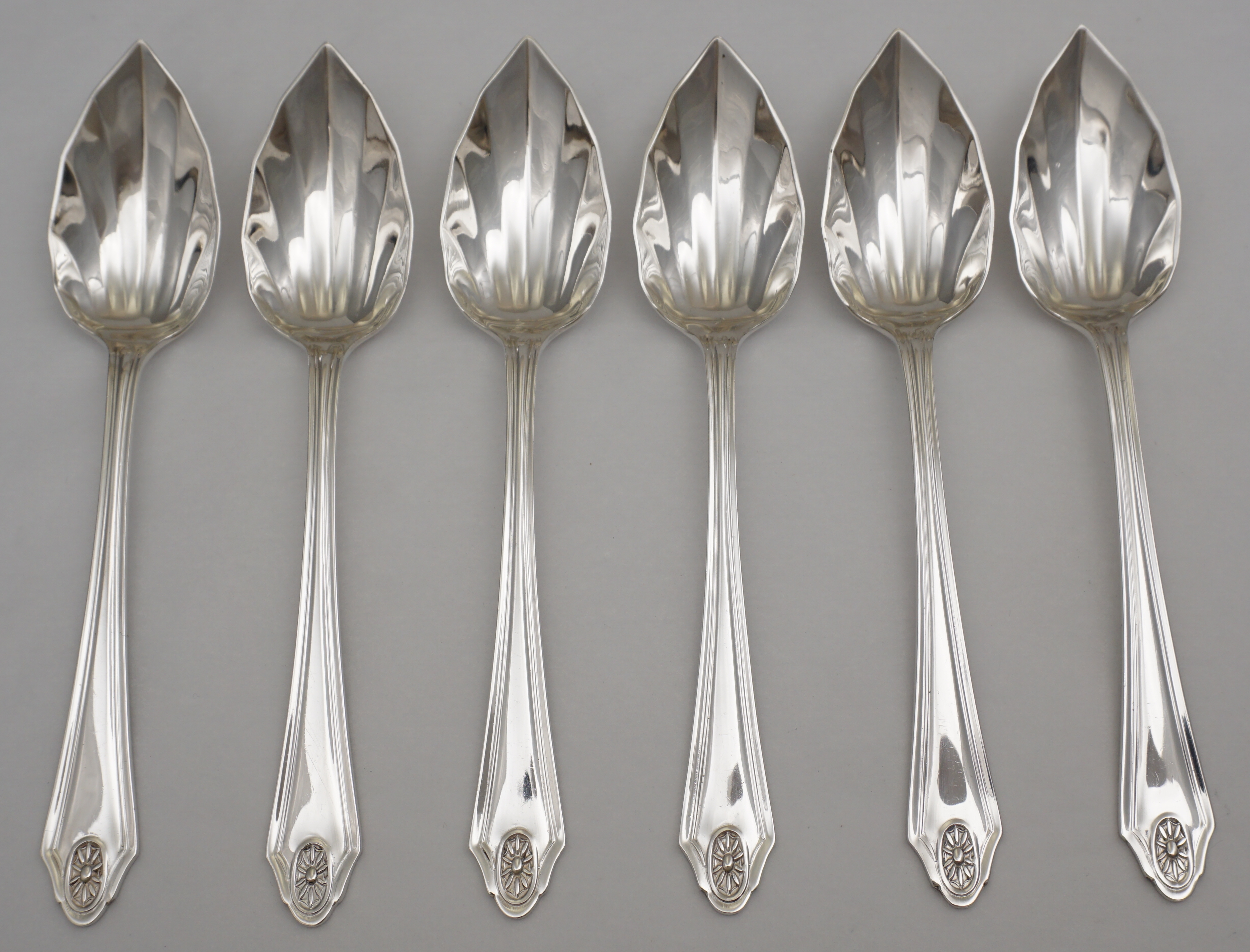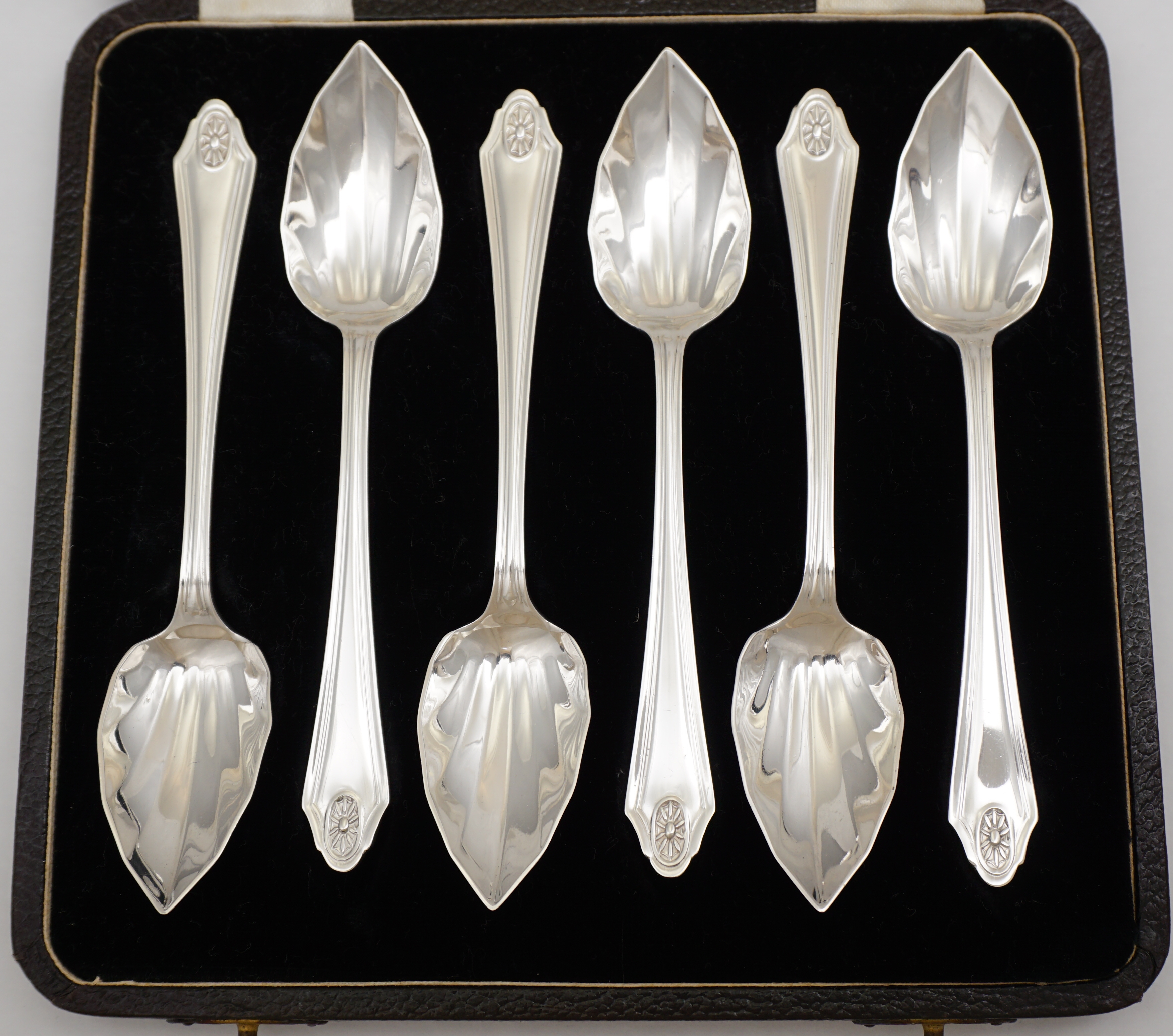 DESCRIPTION | Cased set of six vintage English Art Deco solid sterling silver spoons with pointed and fluted bowls. Although originally marketed as grapefruit spoons, I have found this type of spoon also to be well suited to ice cream and sorbet. |