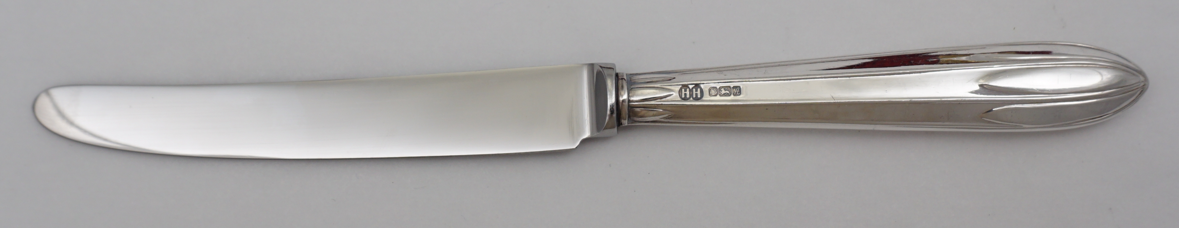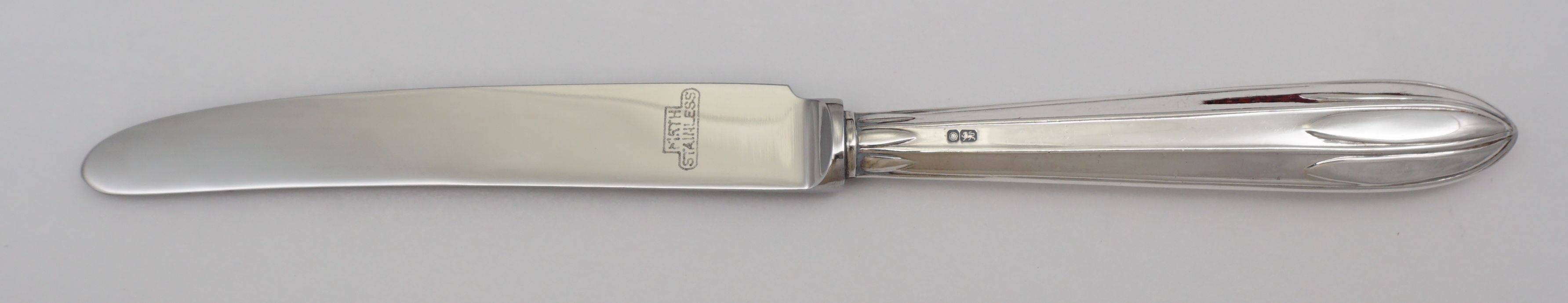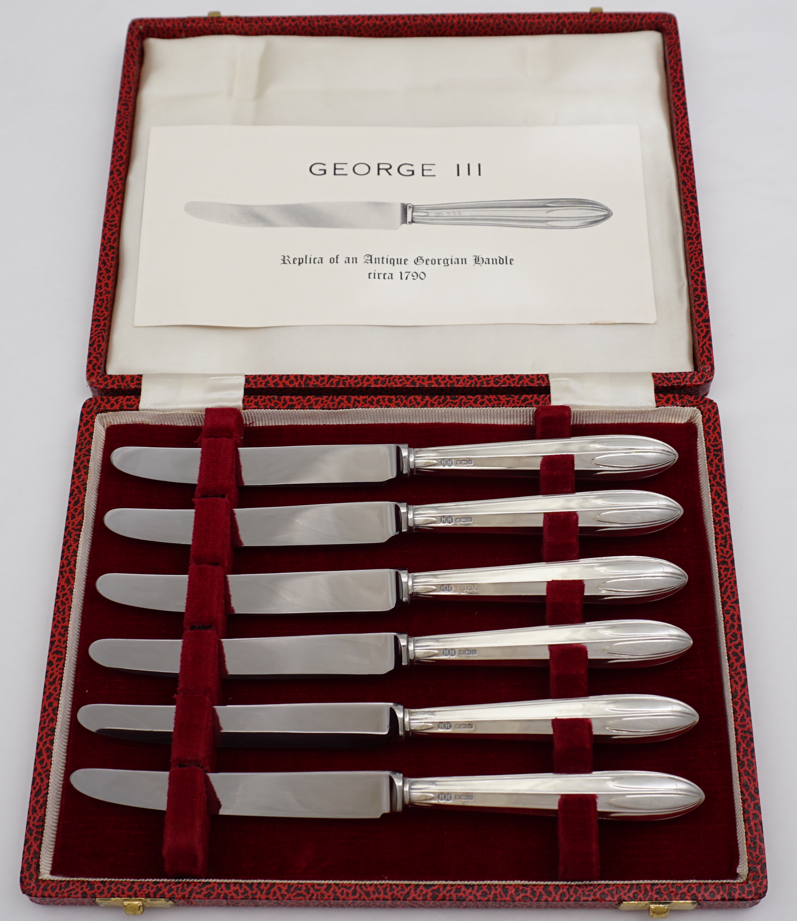 DESCRIPTION | Cased set of six vintage English loaded sterling silver handled tea knives with stainless steel blades. |
