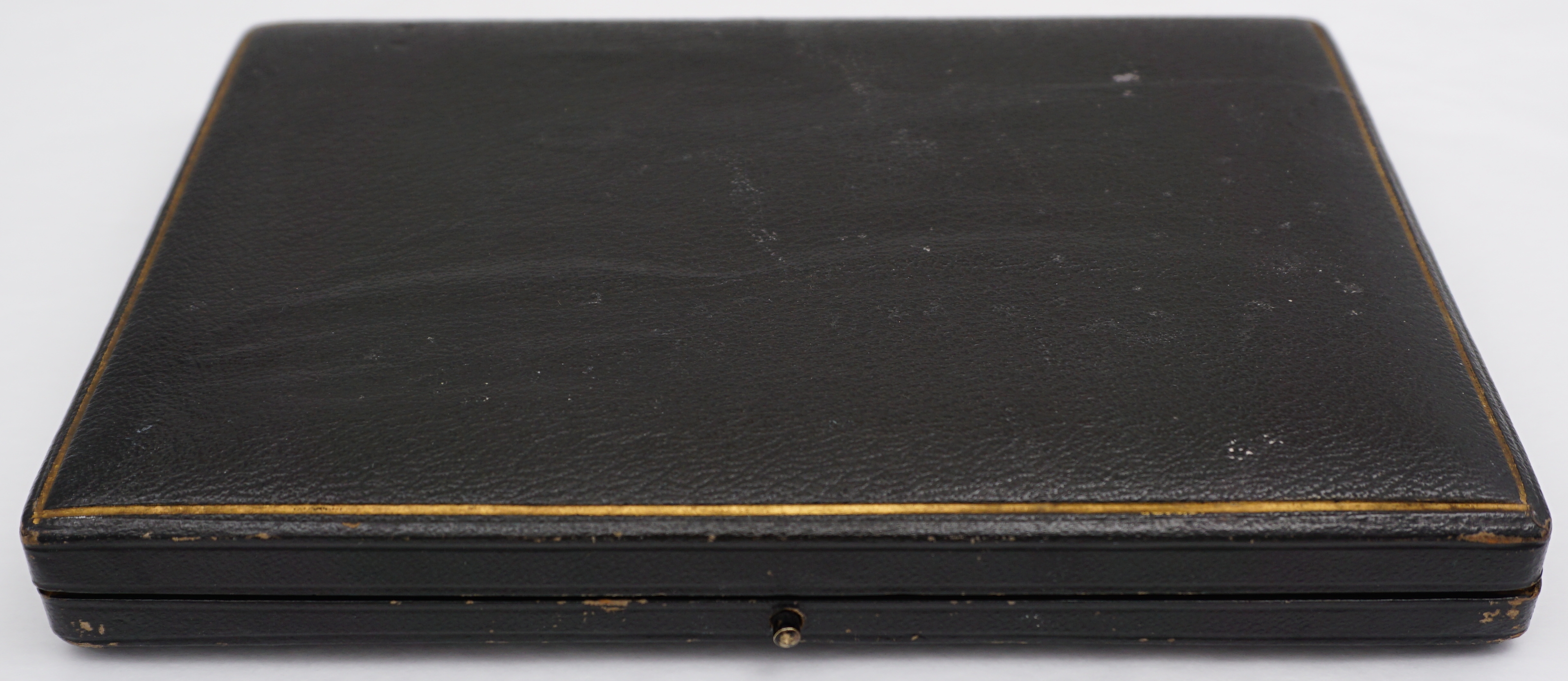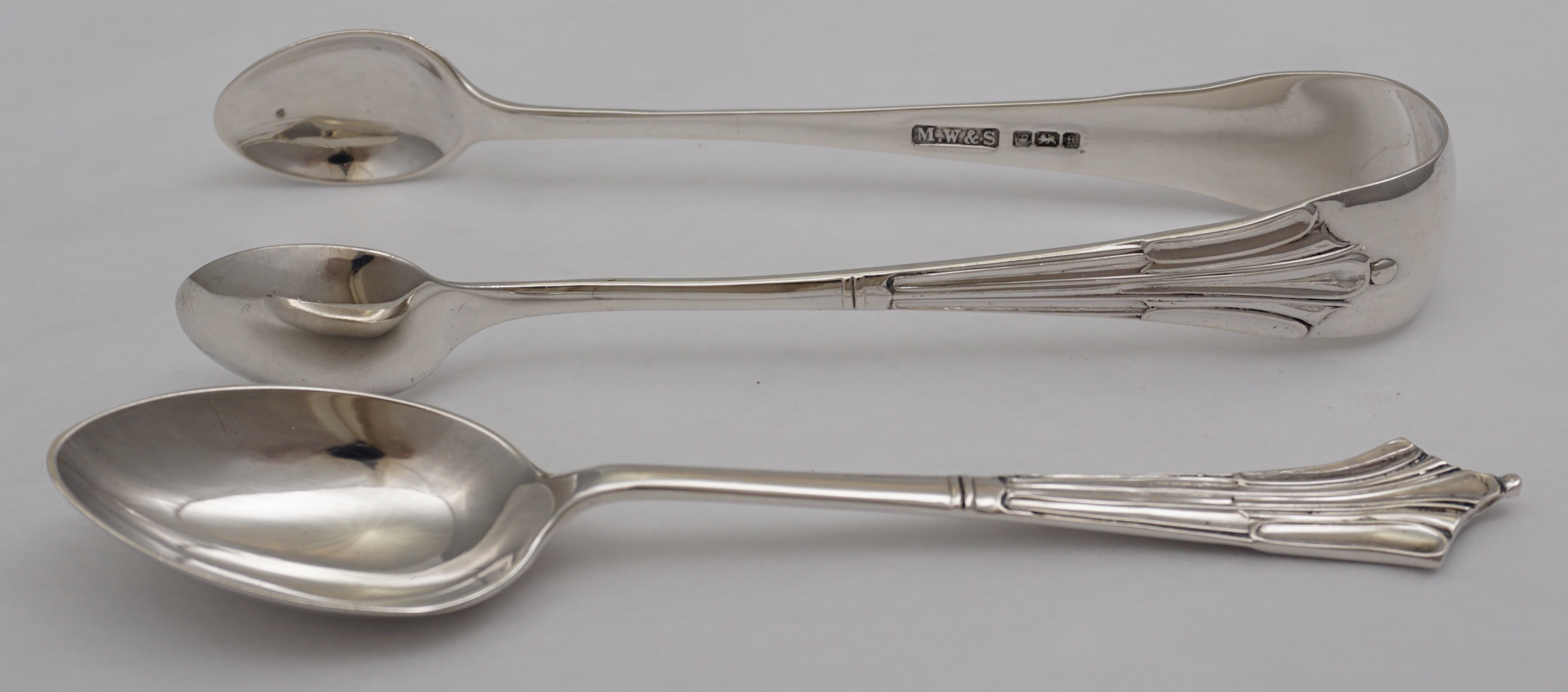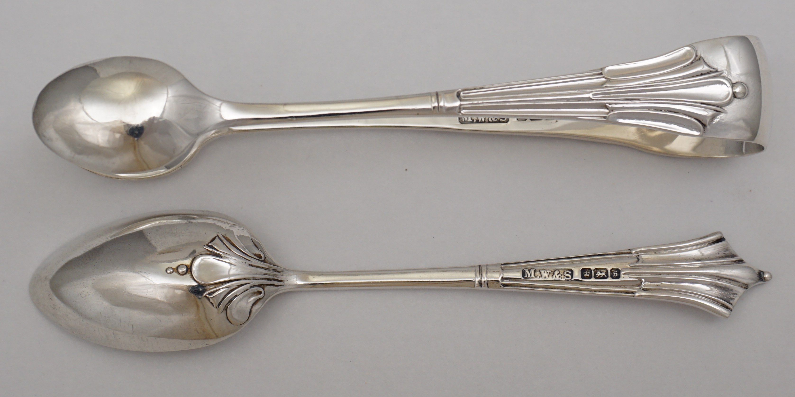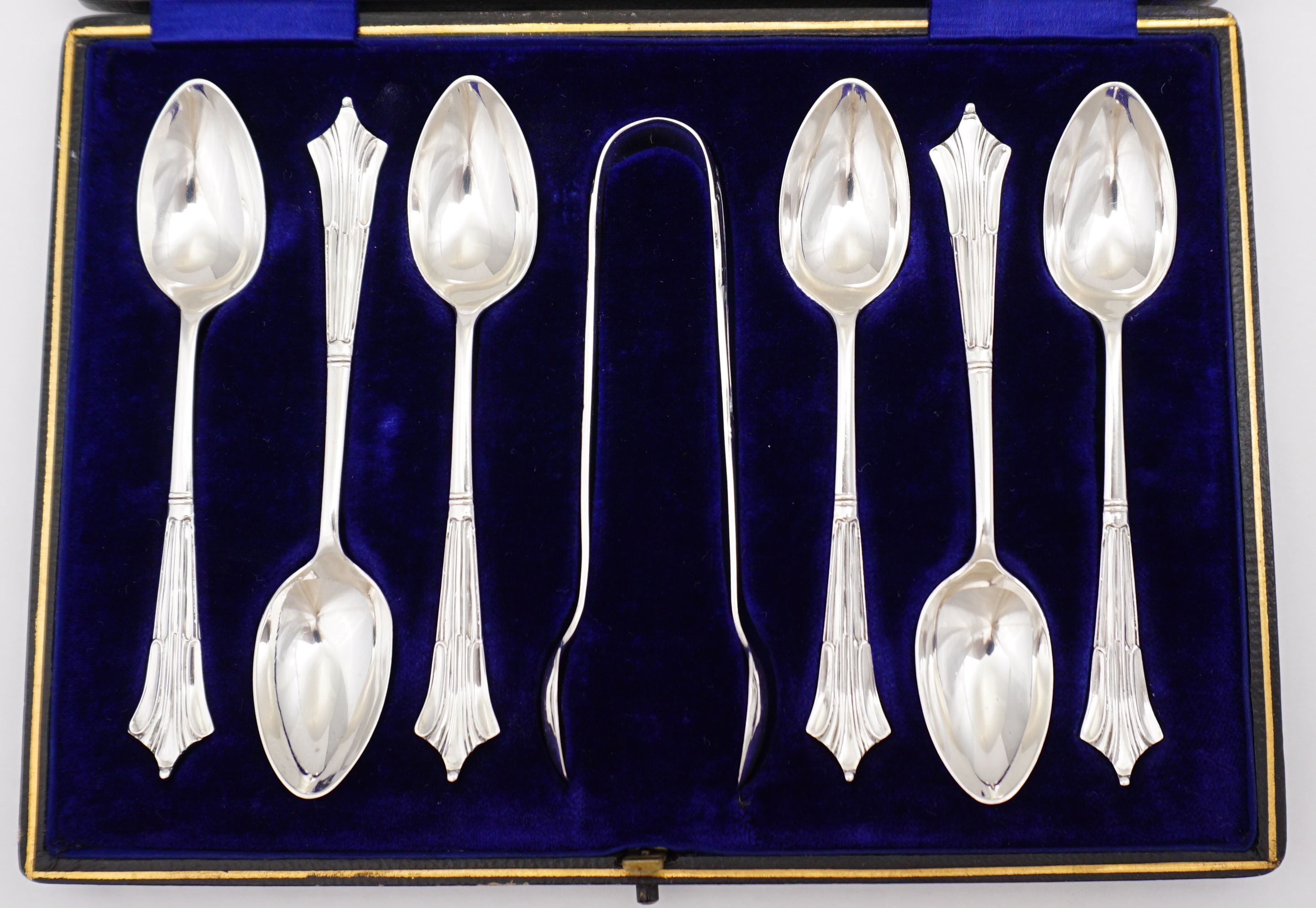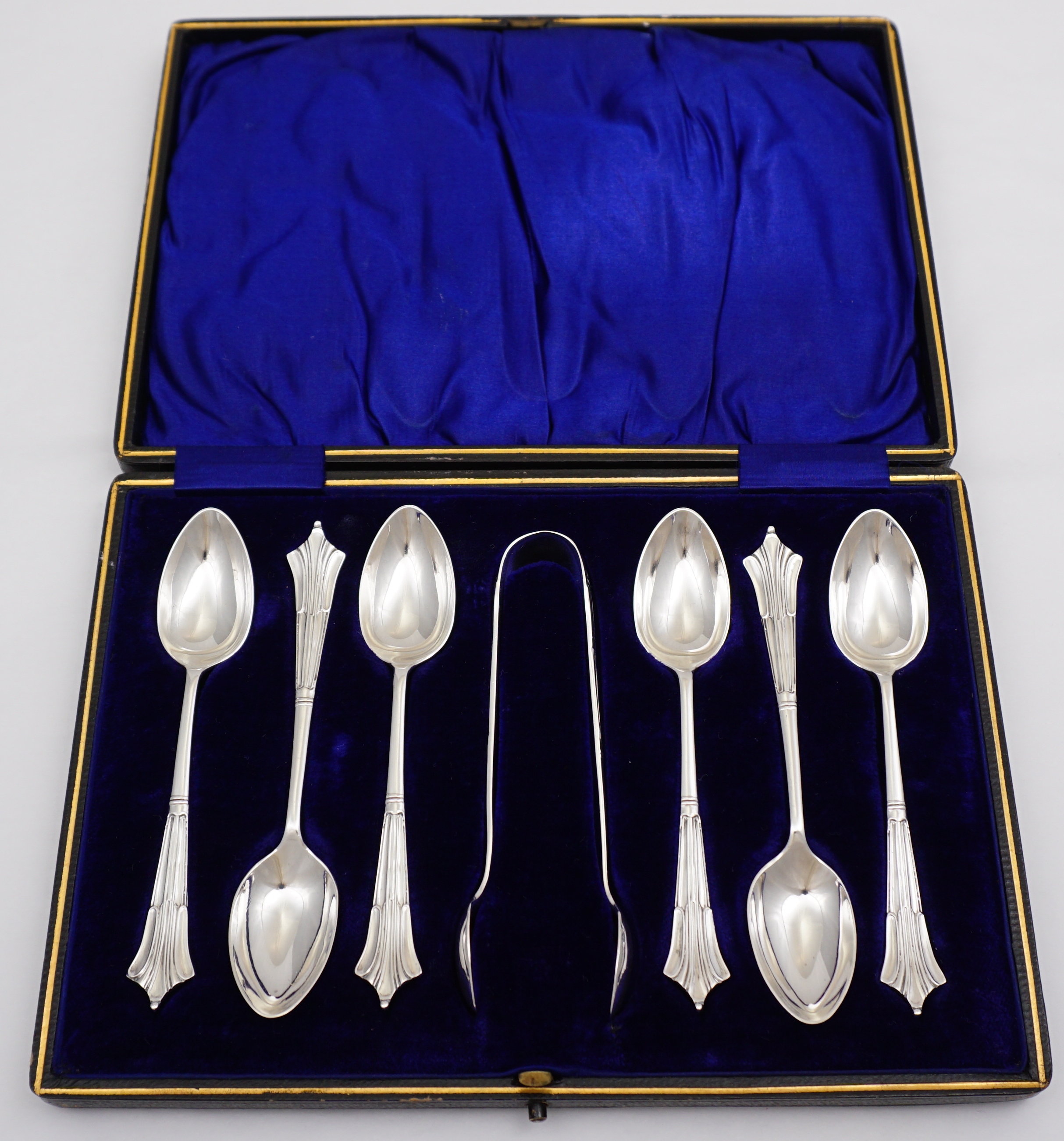 DESCRIPTION | Very good cased set of six vintage English solid sterling silver Albany pattern spoons and tongs. |