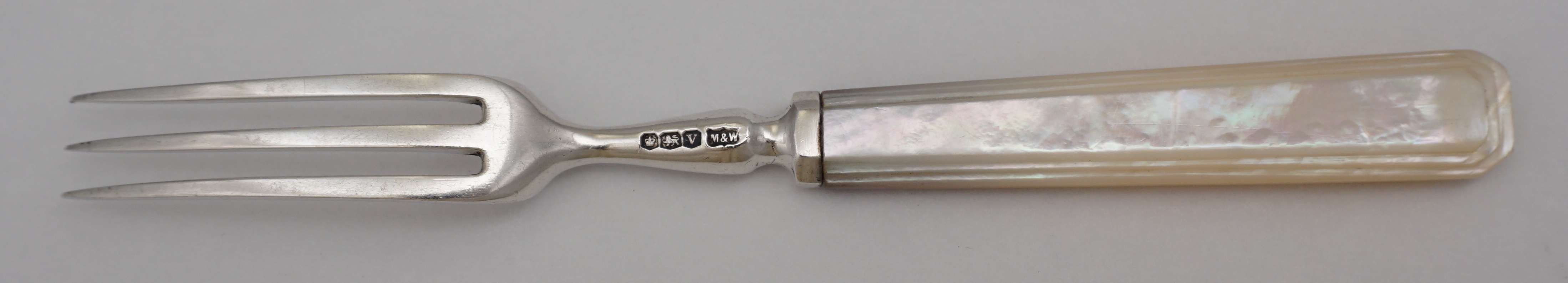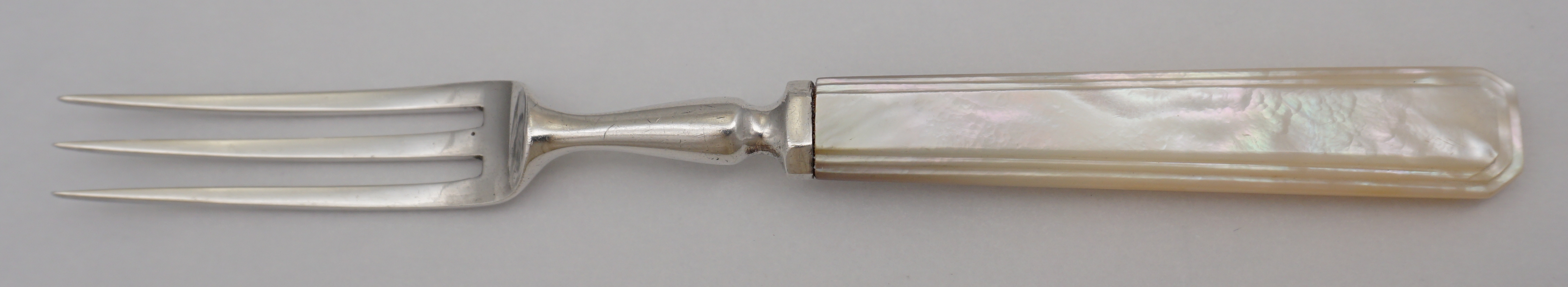 DESCRIPTION | Vintage English Art Deco solid sterling silver serving fork with long tines and a mother-of-pearl handle. Would be good for serving tomatoes, cucumber slices etc. |