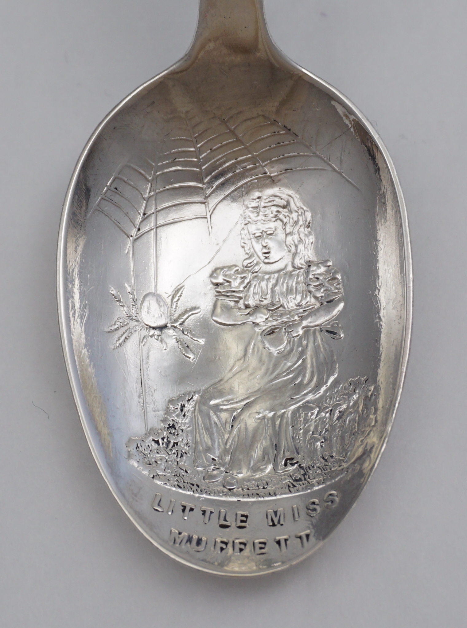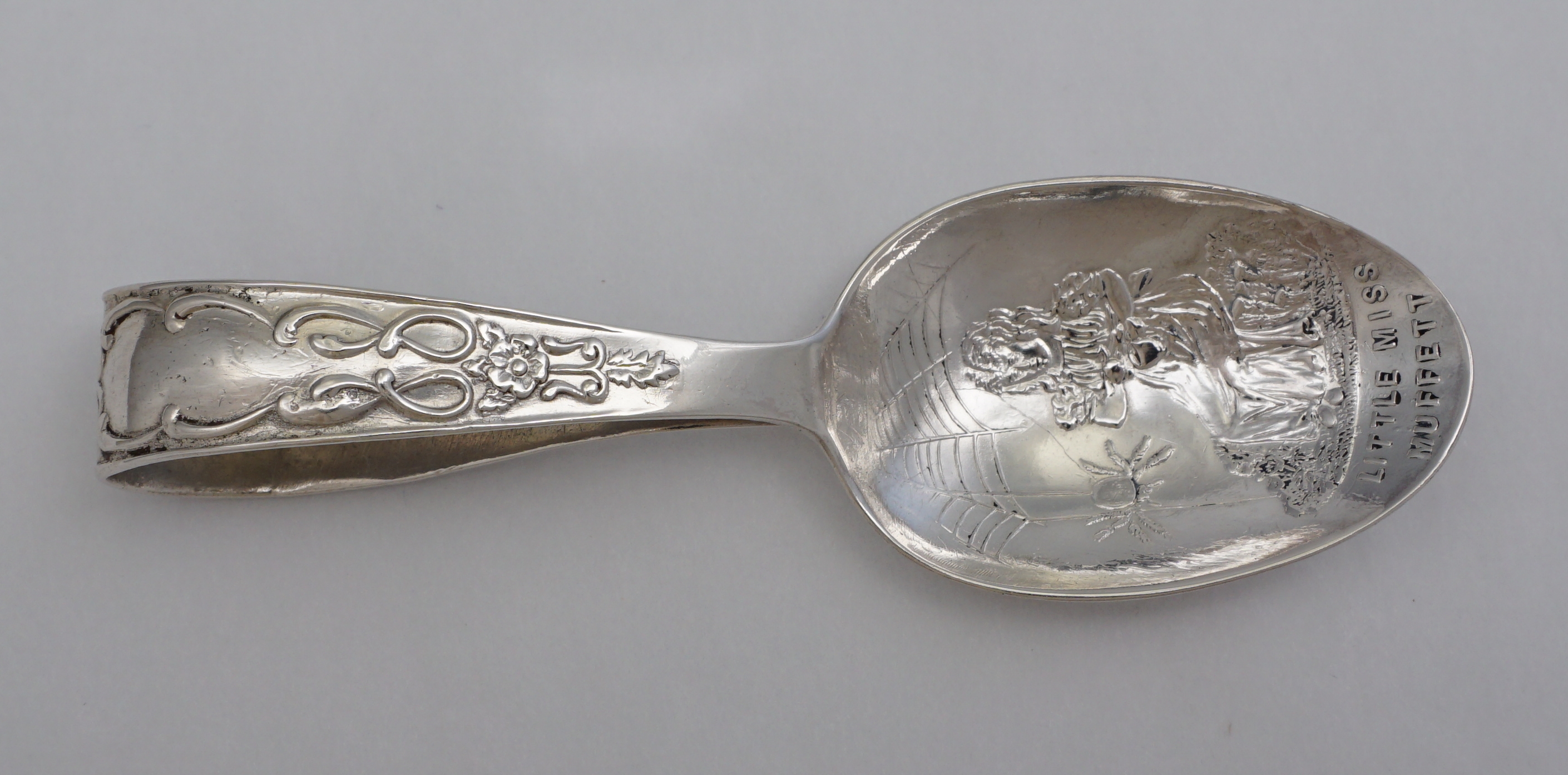 DESCRIPTION | Antique English Edwardian solid sterling silver child's spoon 'Little Miss Muffett'. |