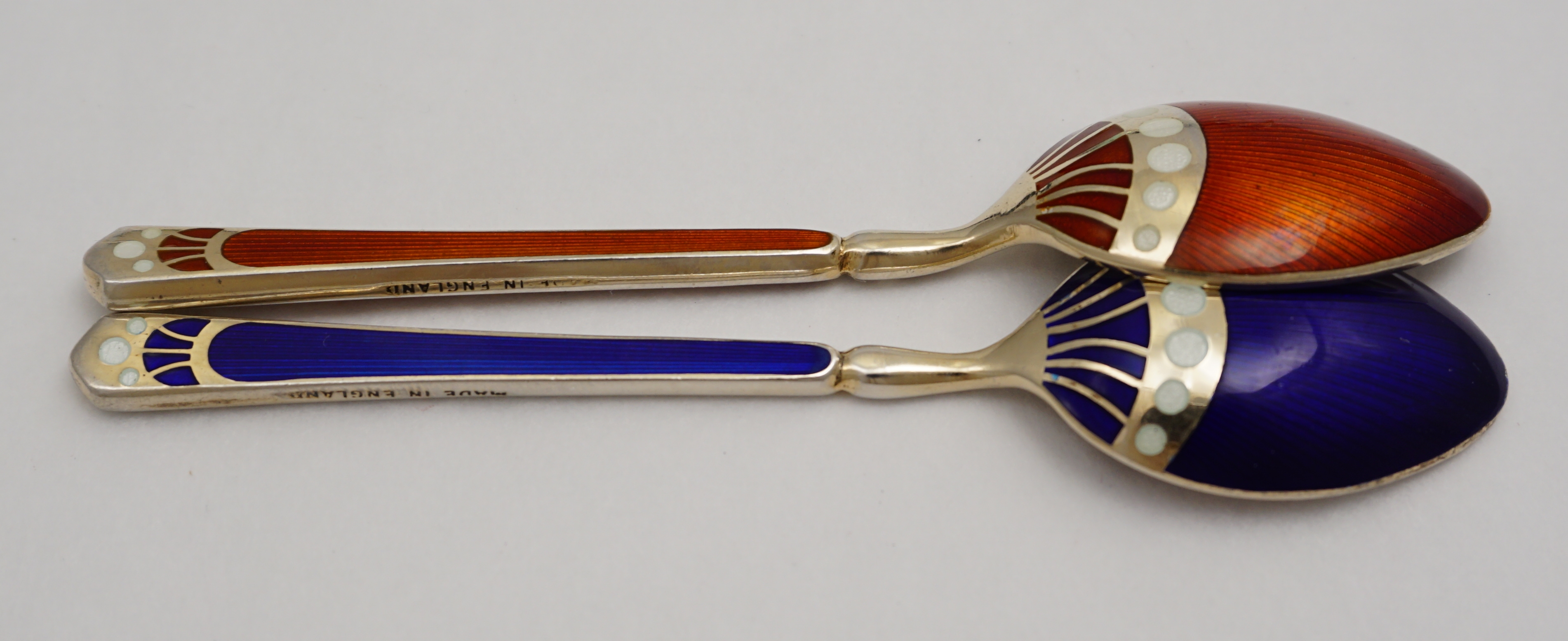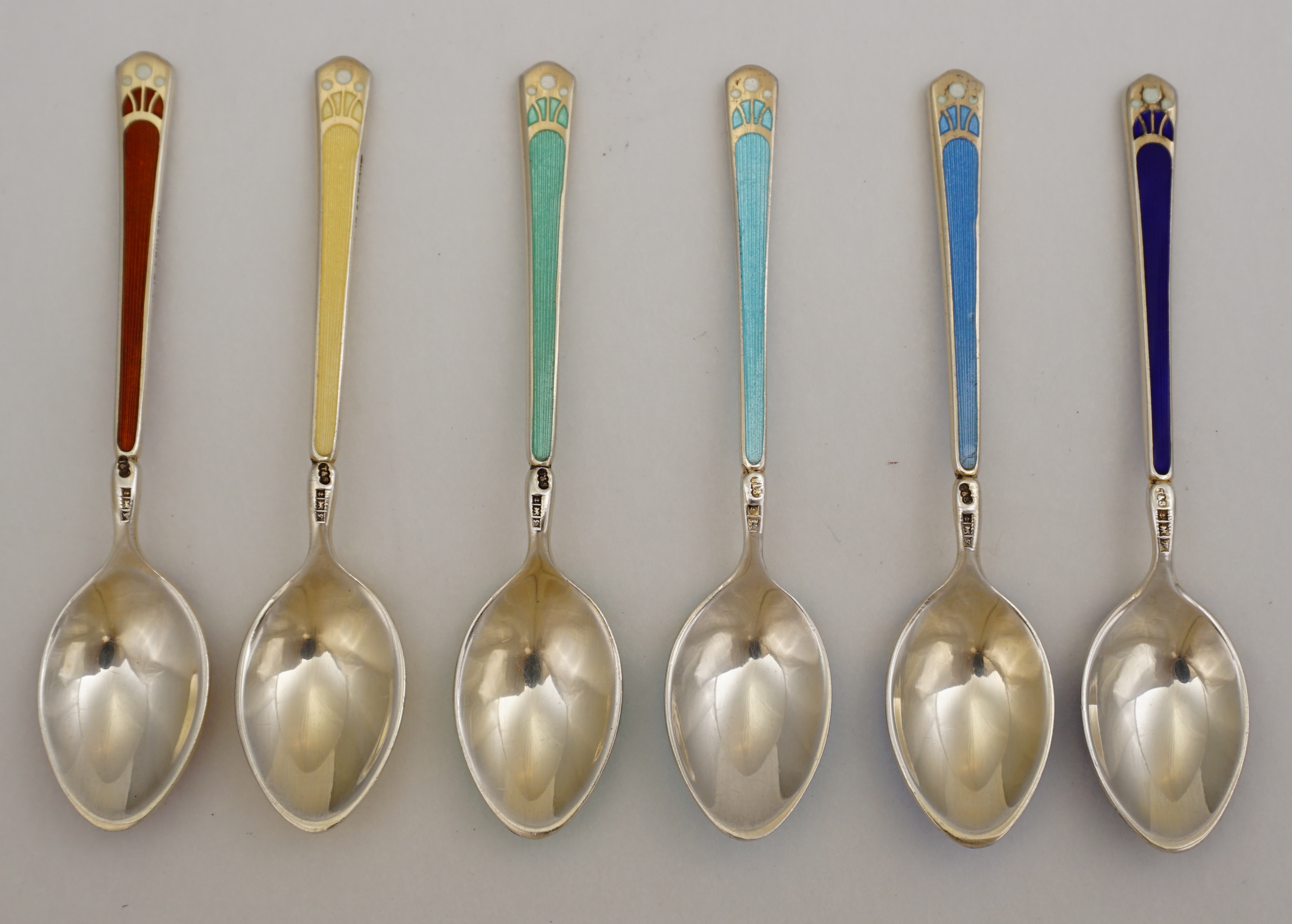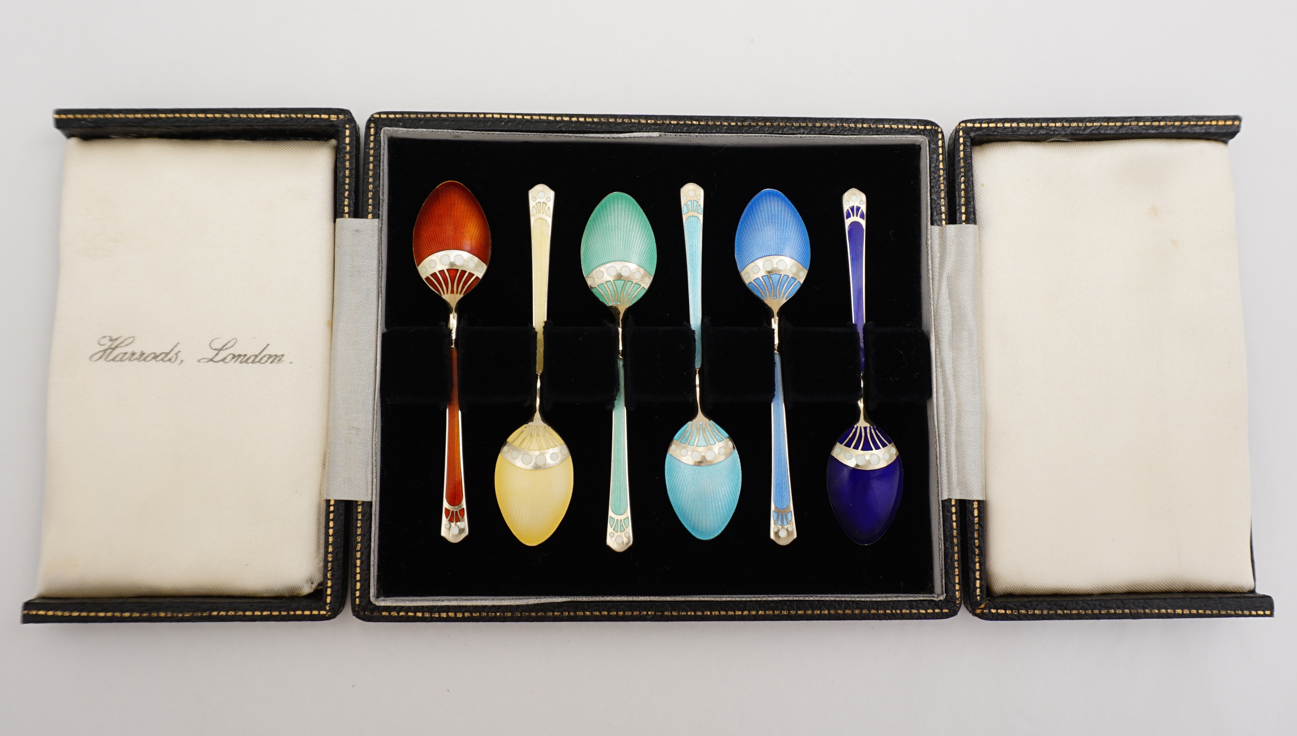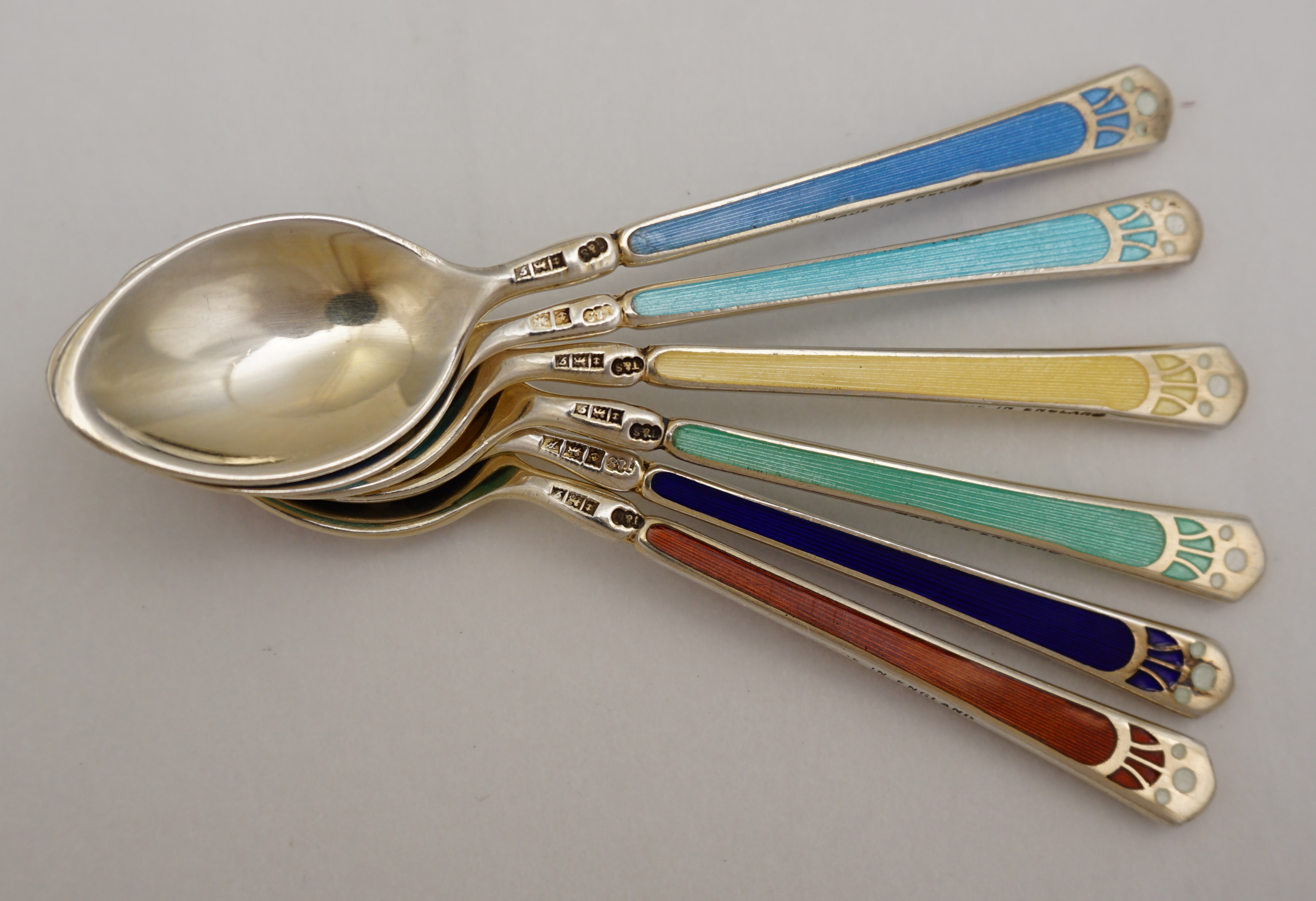 DESCRIPTION | Joyous set of six vintage English solid sterling silver gilt coffee spoons with rainbow enamel decoration and contained within the original display case. |