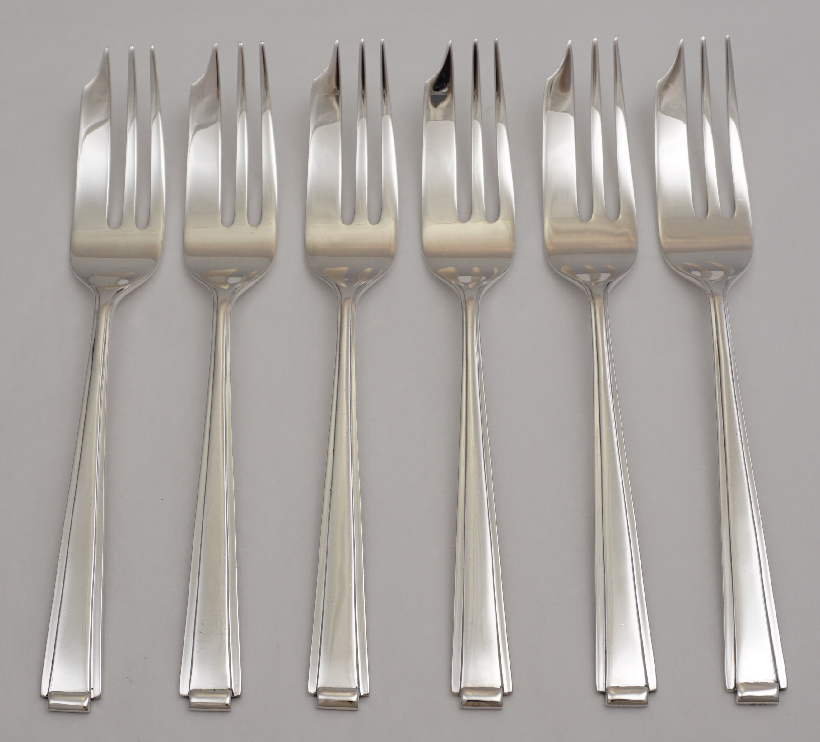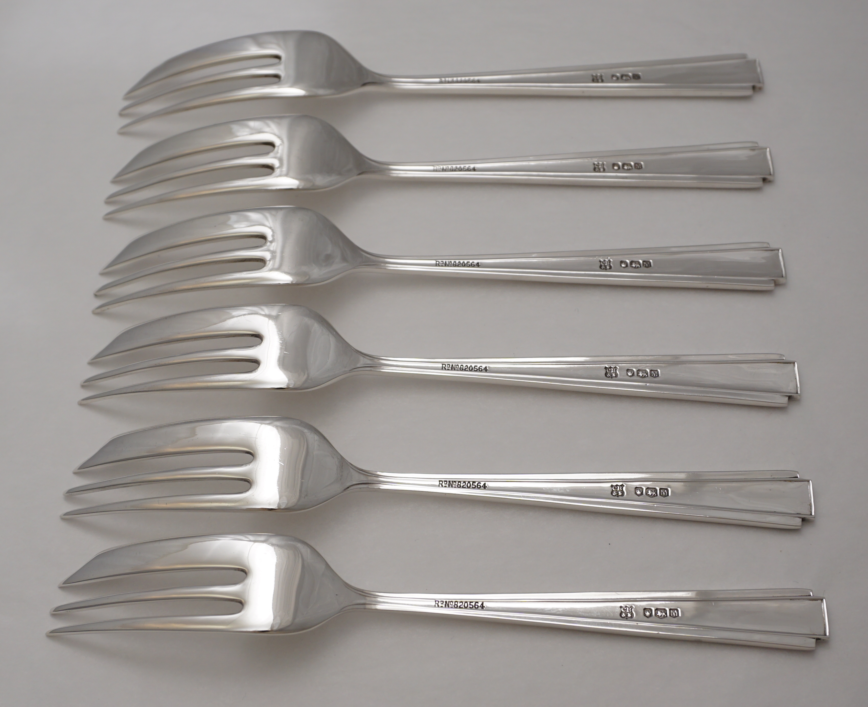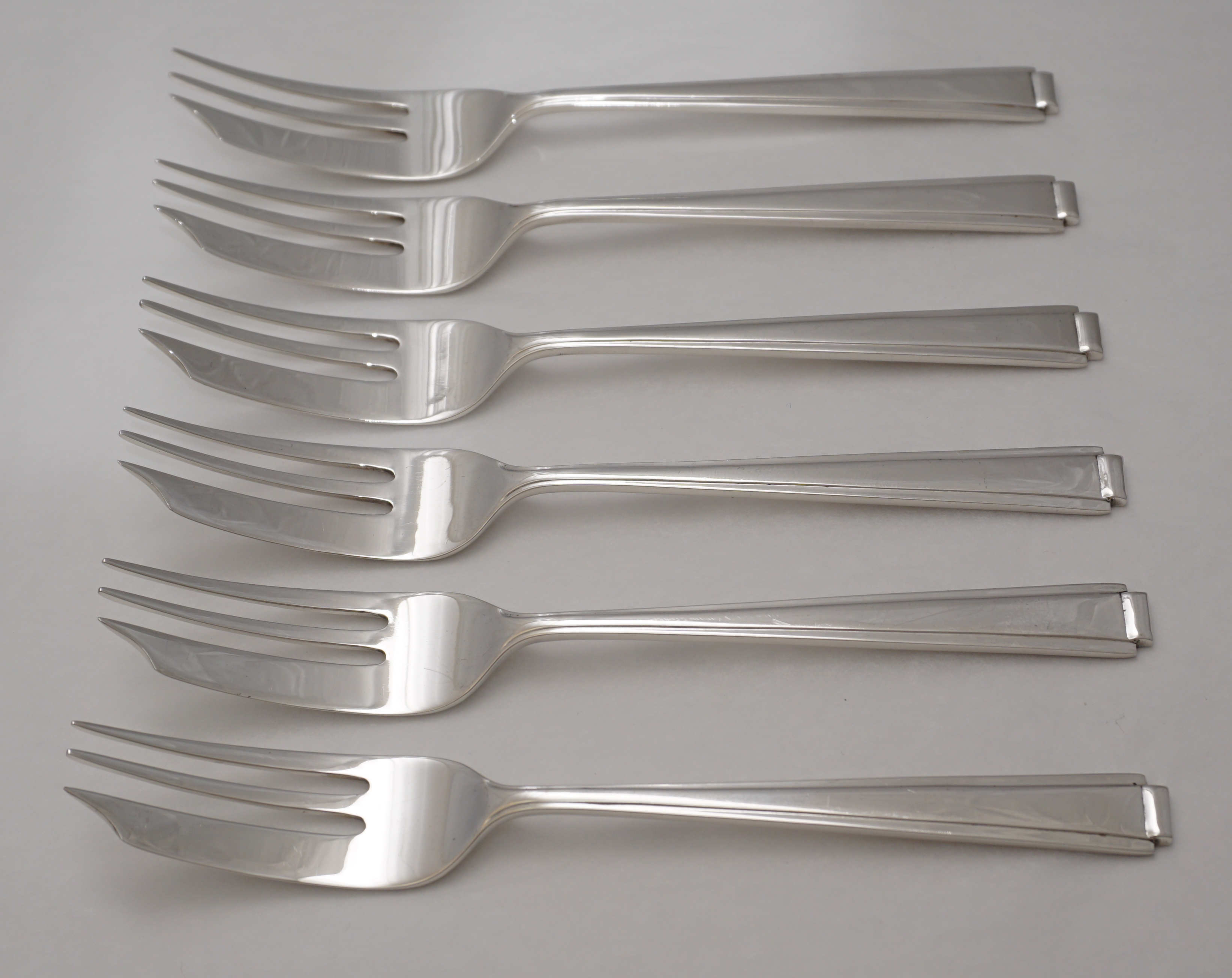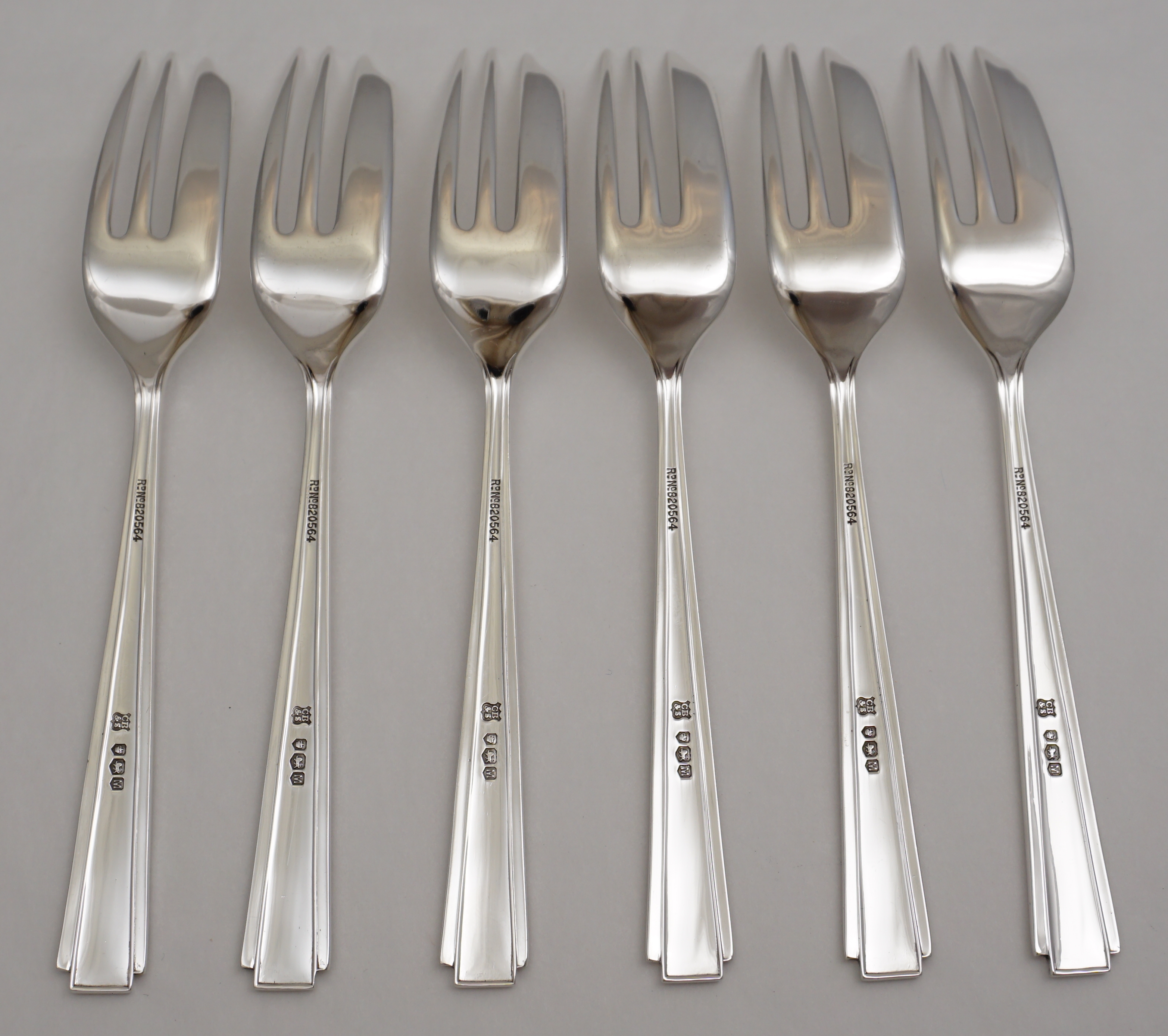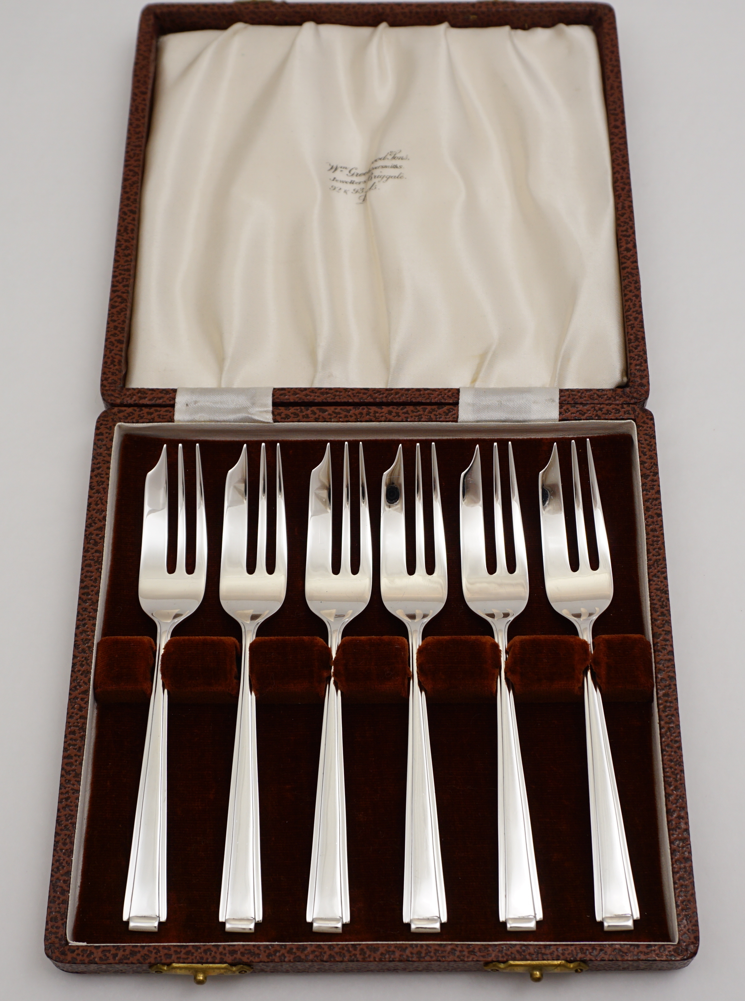 DESCRIPTION | Very good and cased set of six vintage Art Deco English solid sterling silver cake forks. |