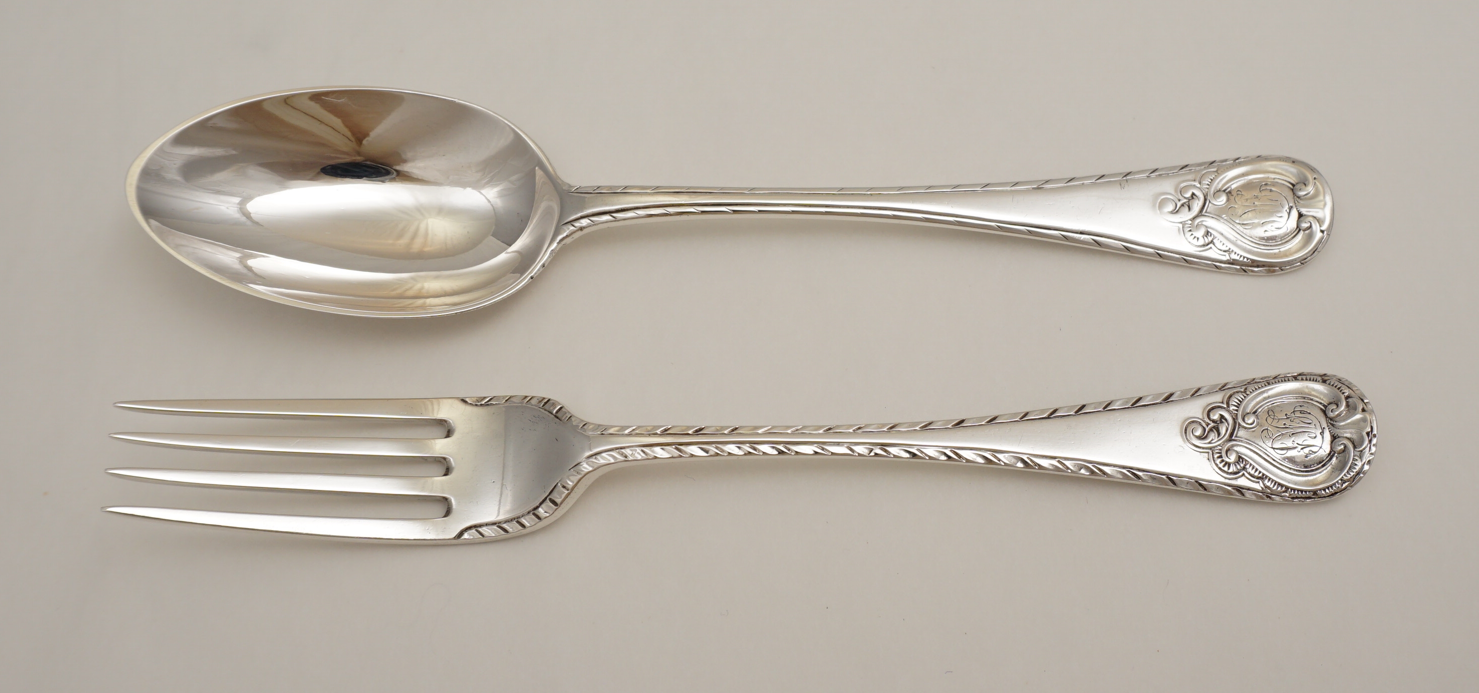 DESCRIPTION | Antique English Victorian solid sterling silver Hanoverian Feather Edge Rococo Scroll Cartouche Top two piece child's/christening set with frontal monogram and nice blank area verso that would take a new engraving well. |