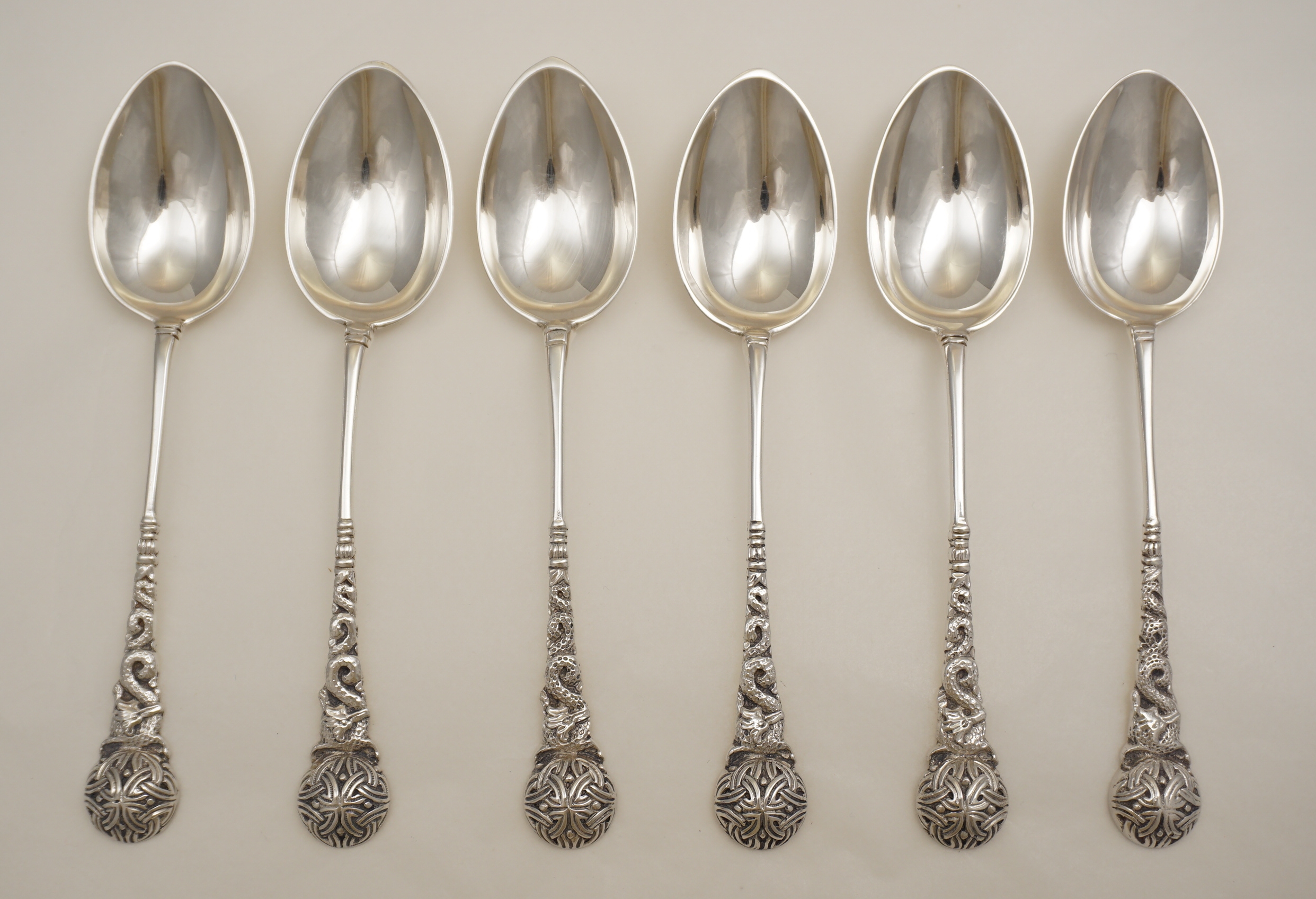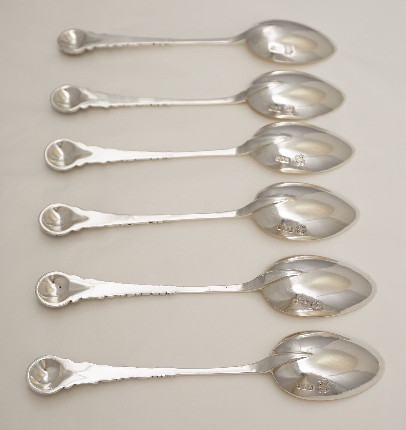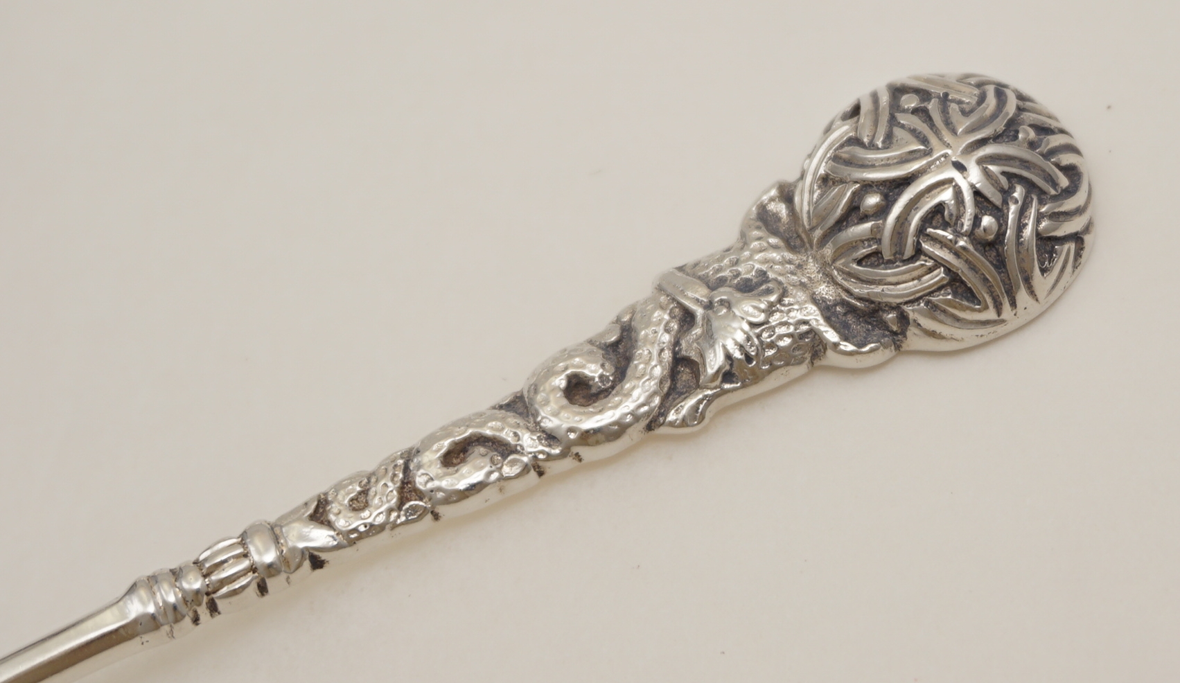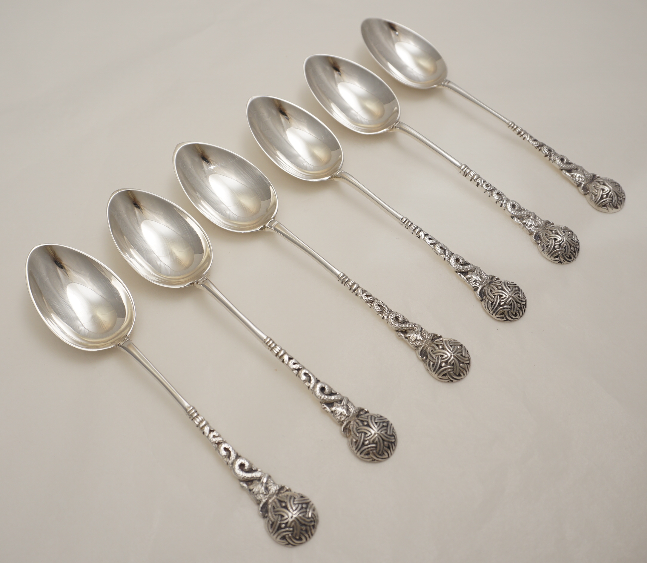 DESCRIPTION | Unusual and high quality set of six antique Scottish solid sterling silver teaspoons with Celtic knot decoration and rat tails to the bowl backs. |