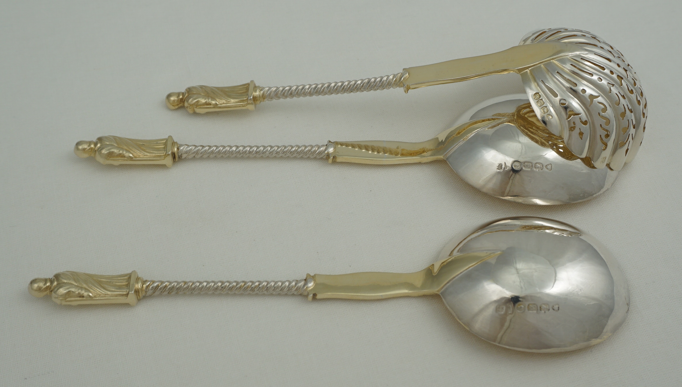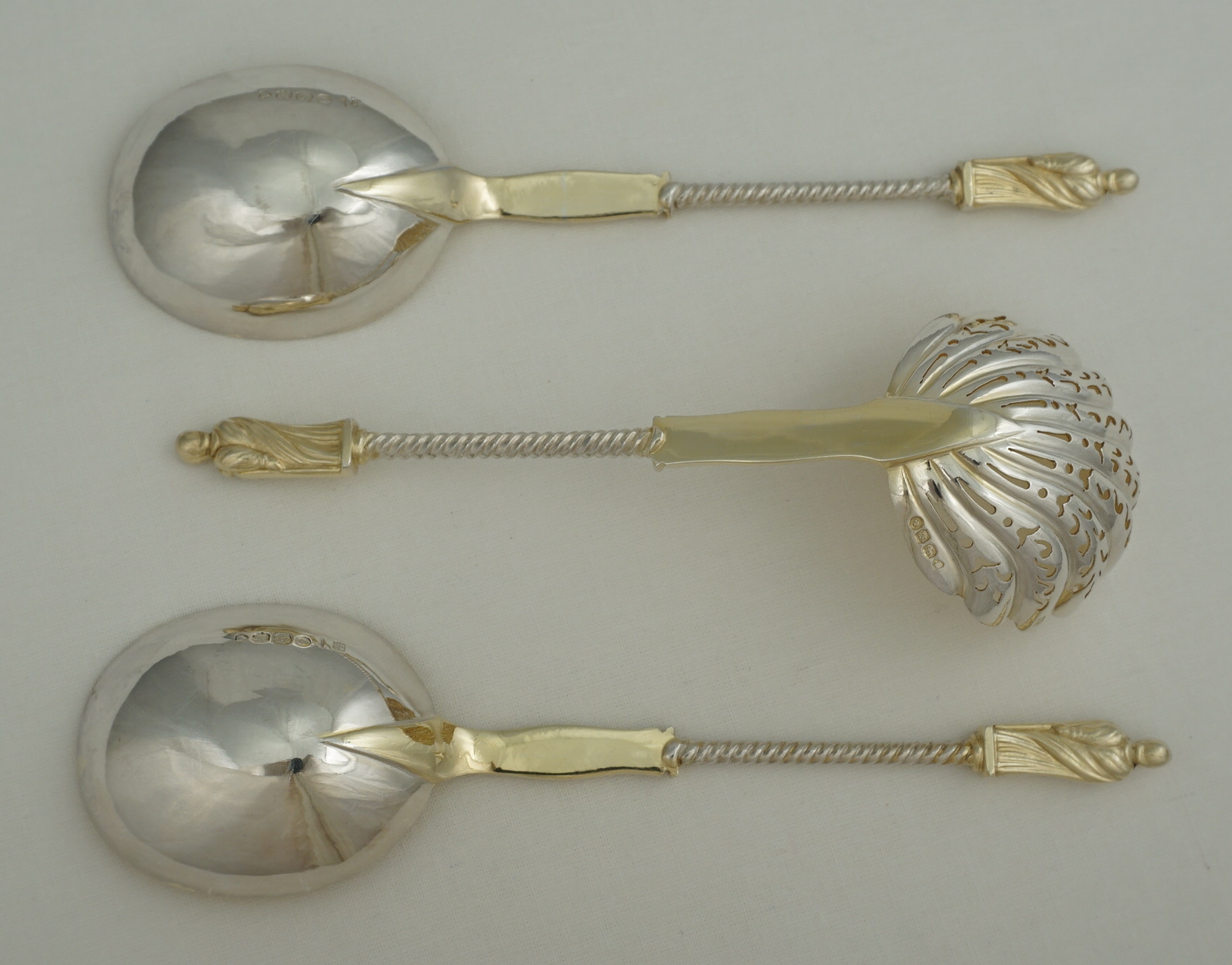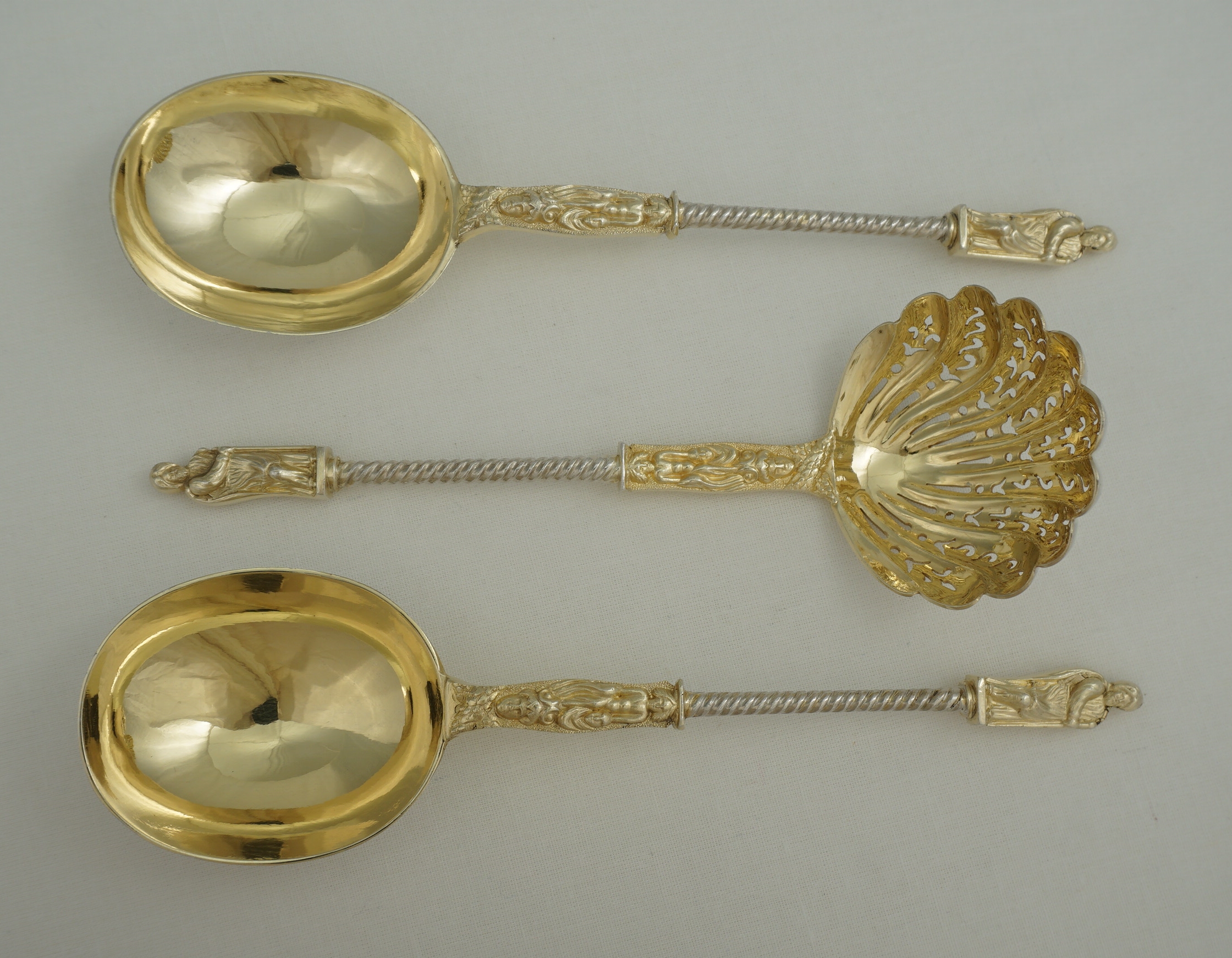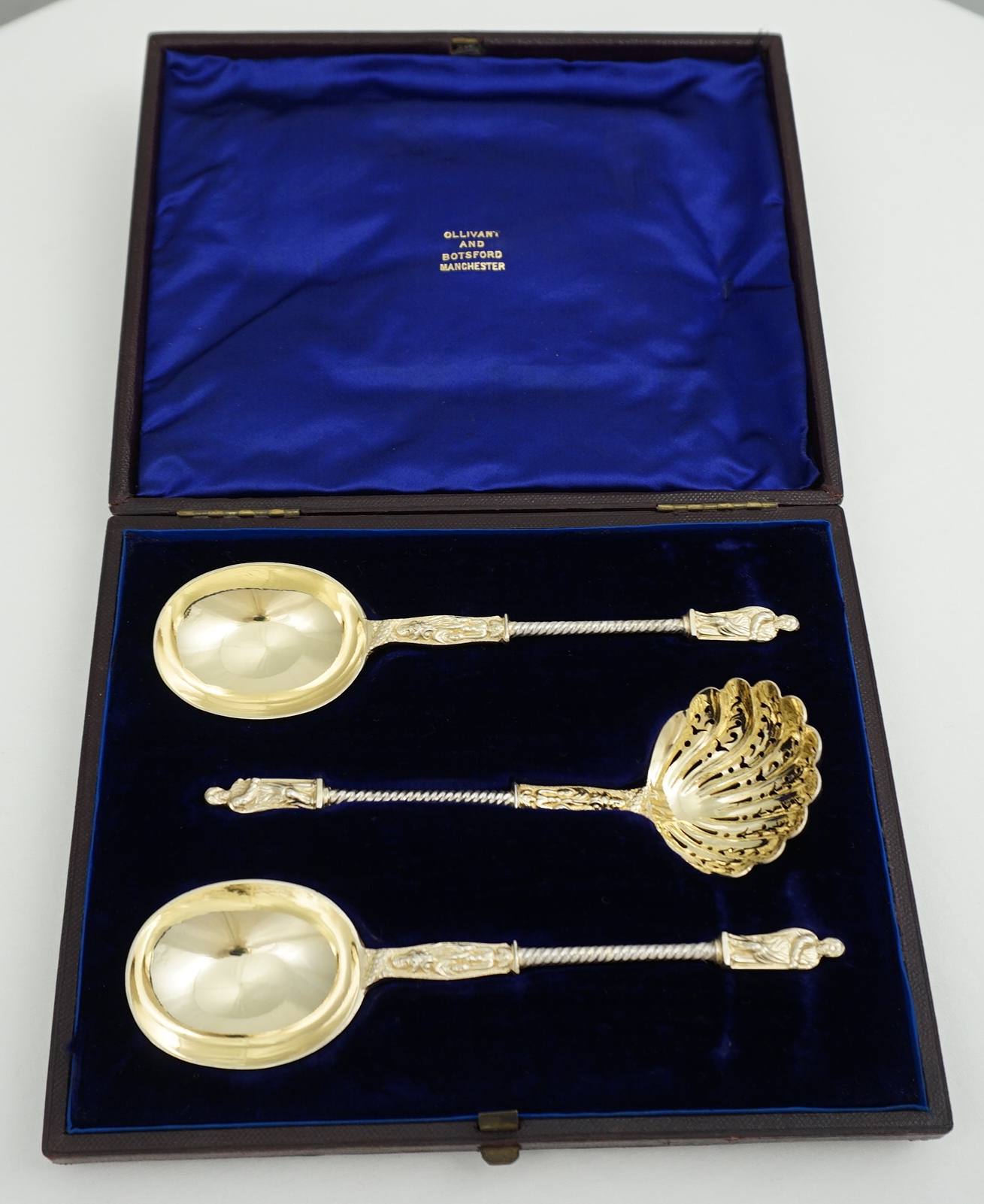DESCRIPTION | Beautifully cased set of antique English Victorian solid sterling silver gilt fruit servers comprising of a pair of serving spoons and a sifter ladle. Retailed in Manchester by Ollivant and Botsford. |