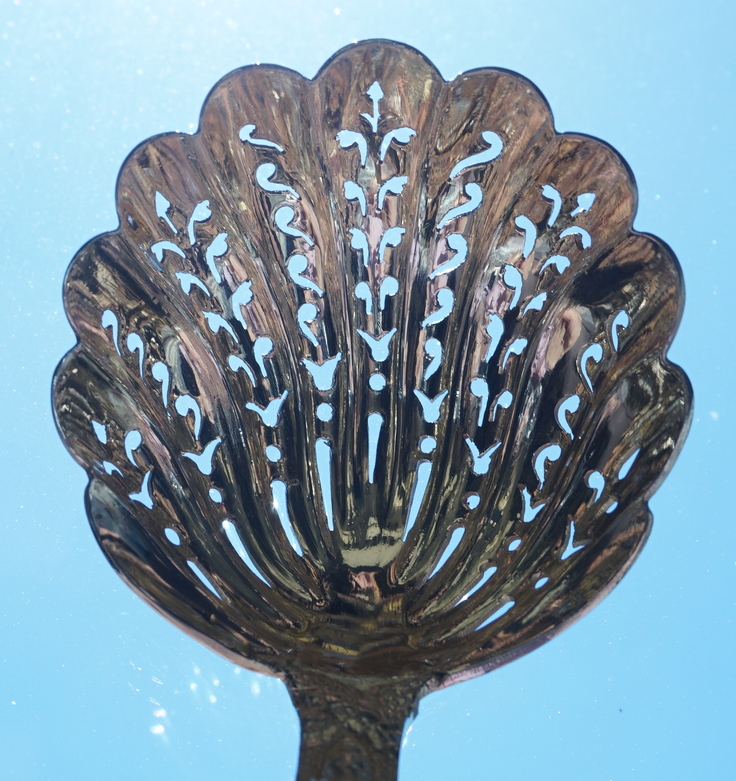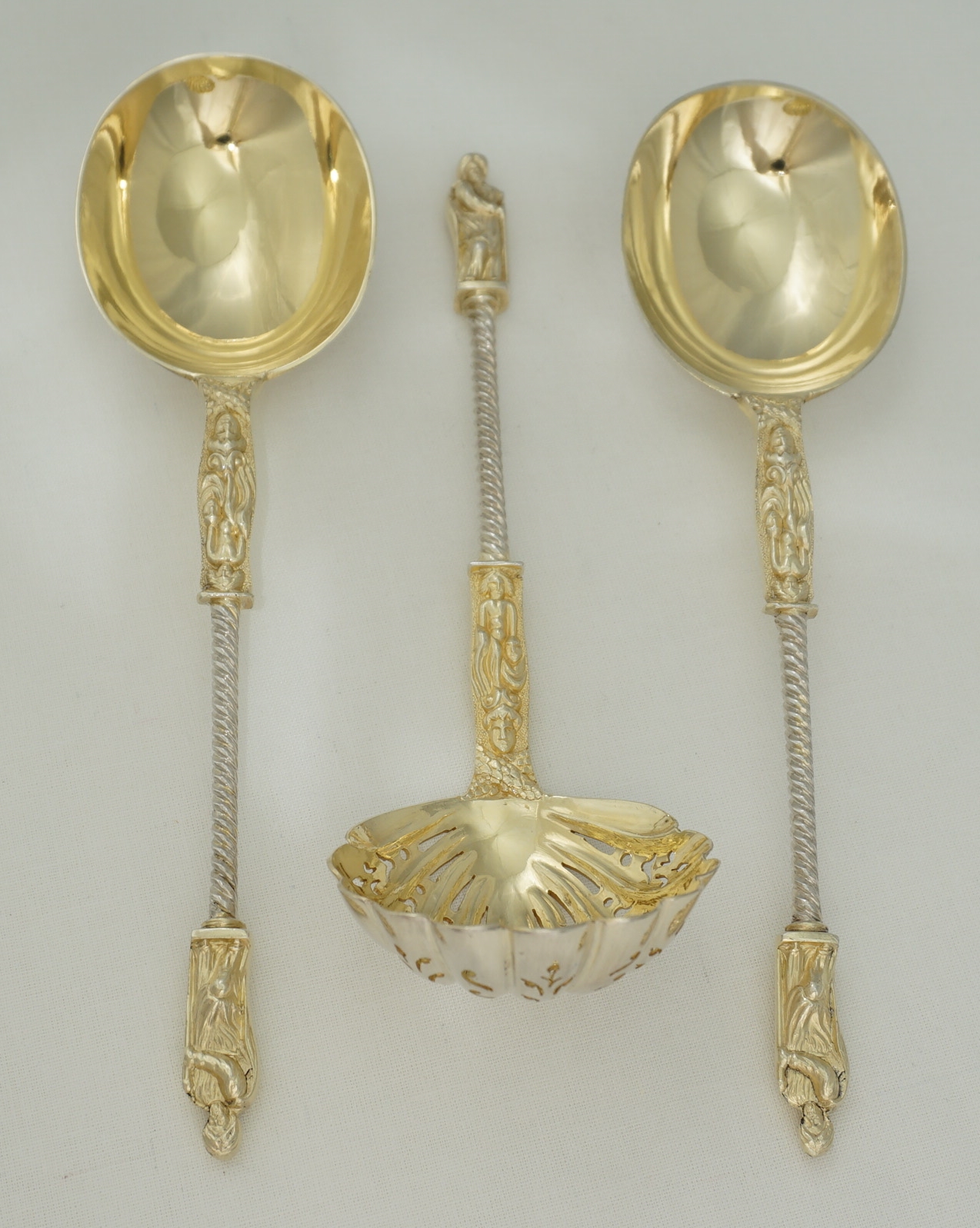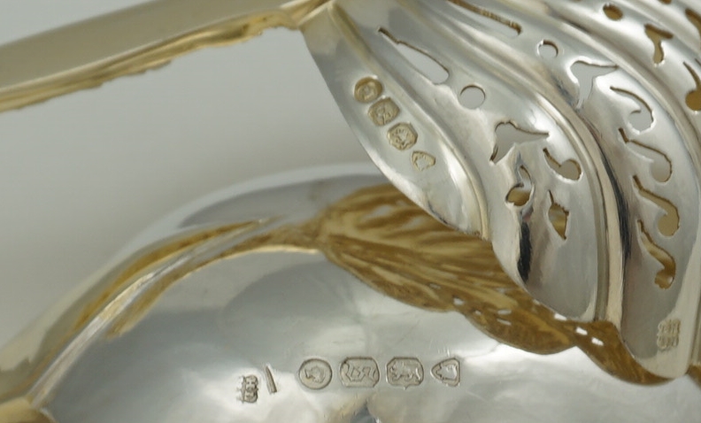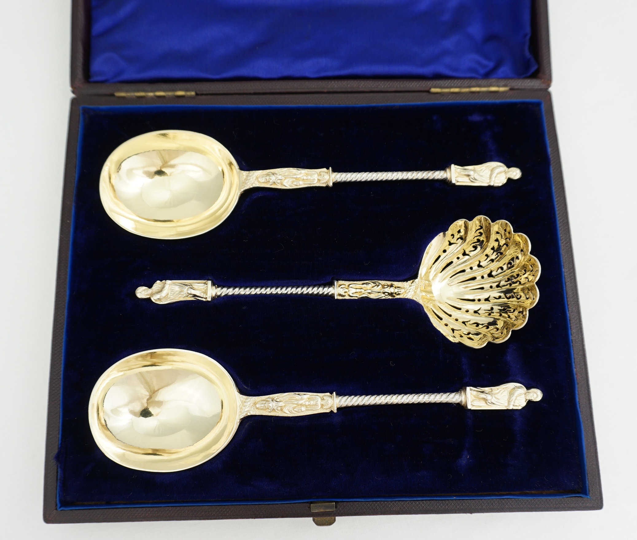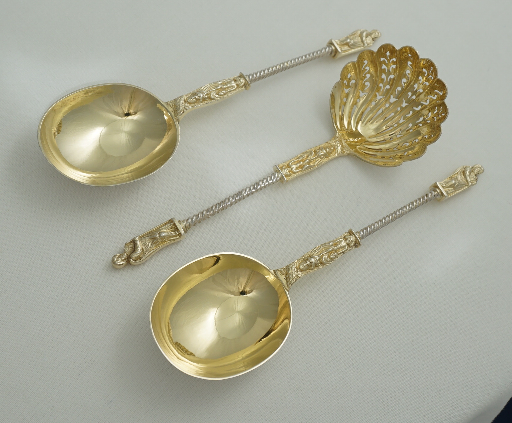 DESCRIPTION | Beautifully cased set of antique English Victorian solid sterling silver gilt fruit servers comprising of a pair of serving spoons and a sifter ladle. Retailed in Manchester by Ollivant and Botsford. |