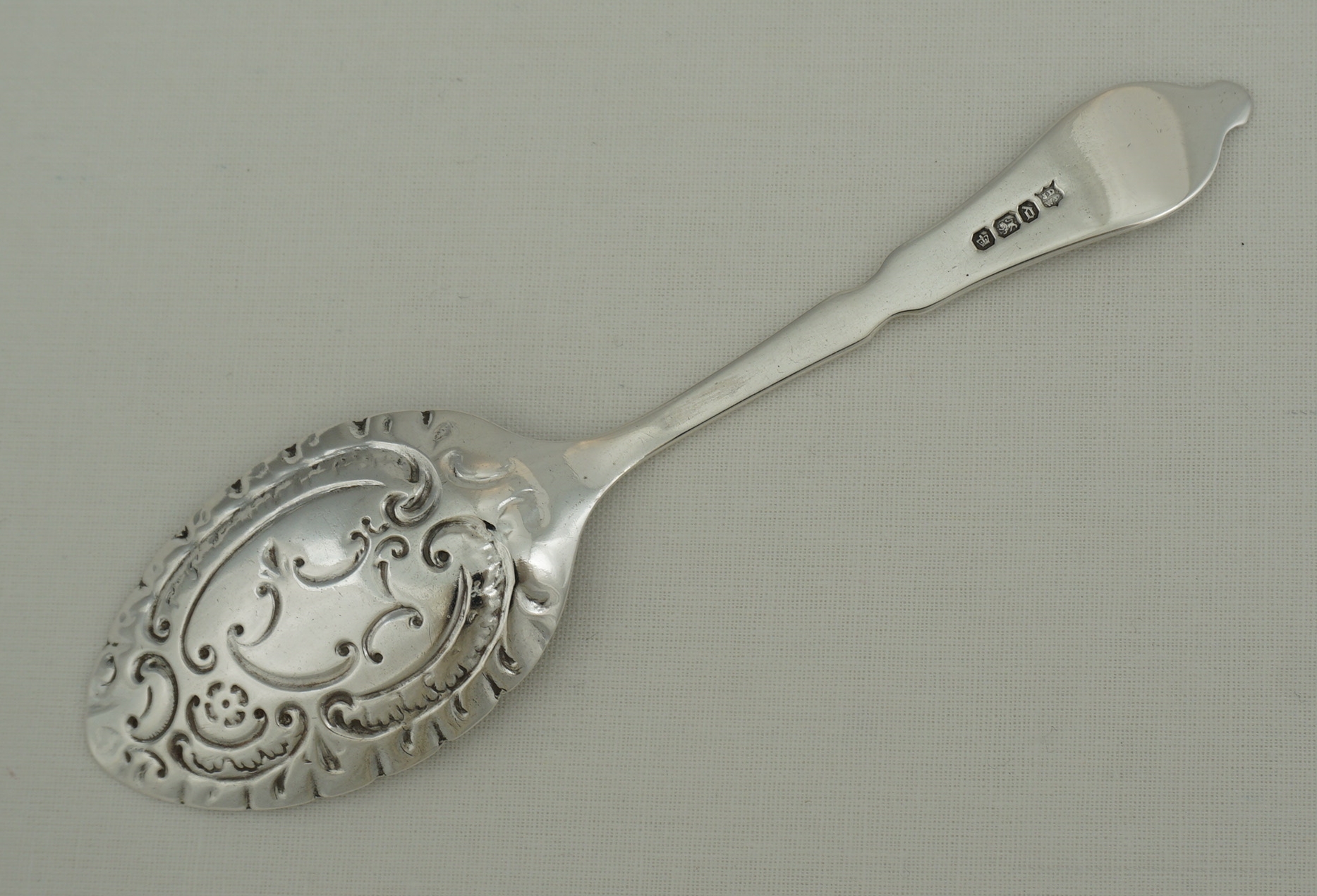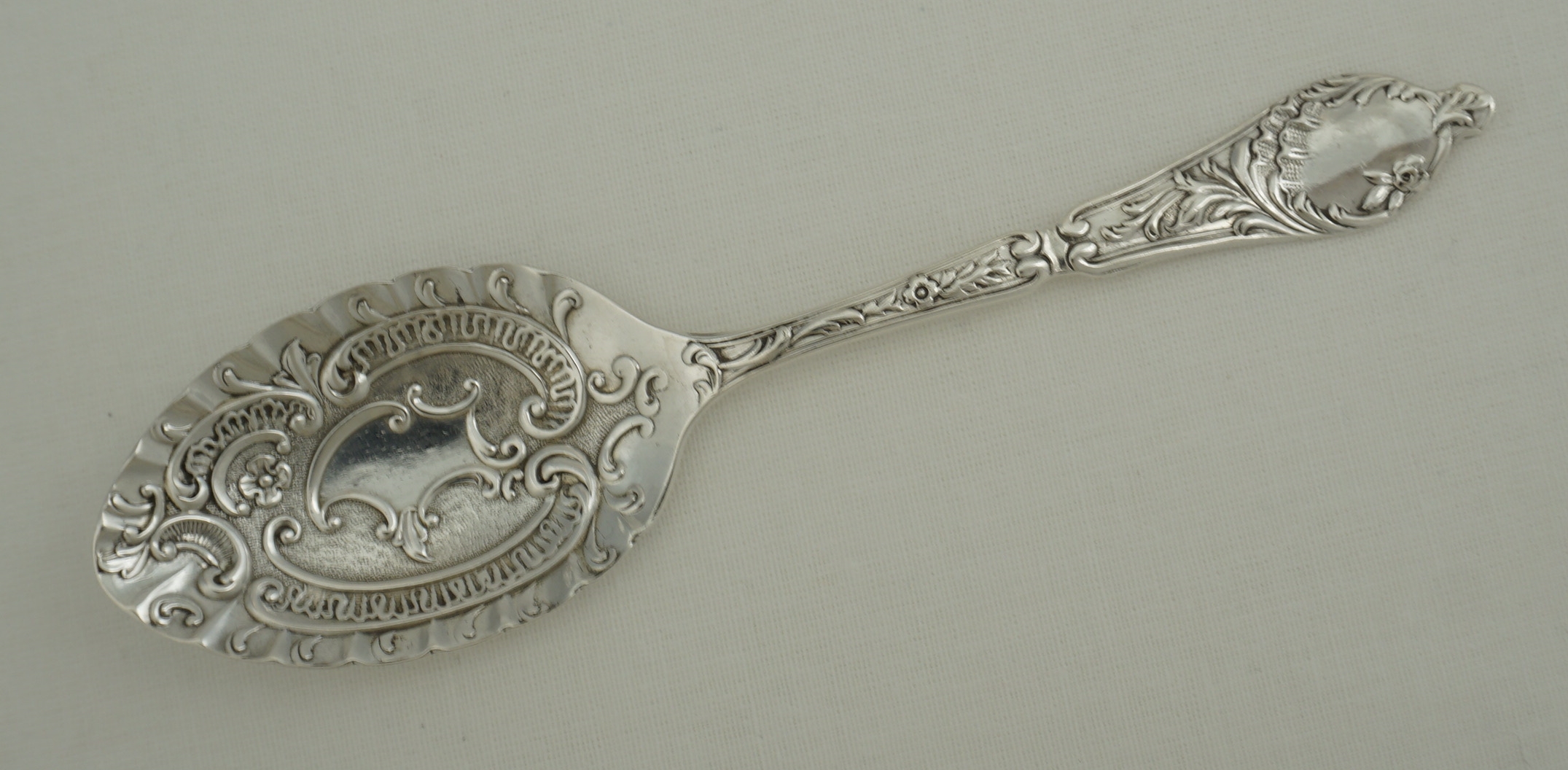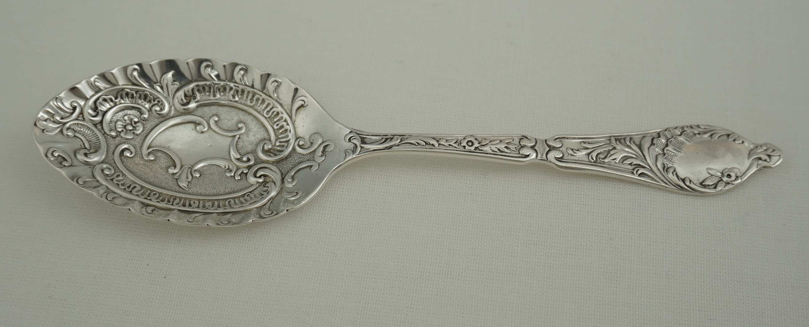 DESCRIPTION | Antique English Victorian solid sterling silver rococo preserve spoon. |
