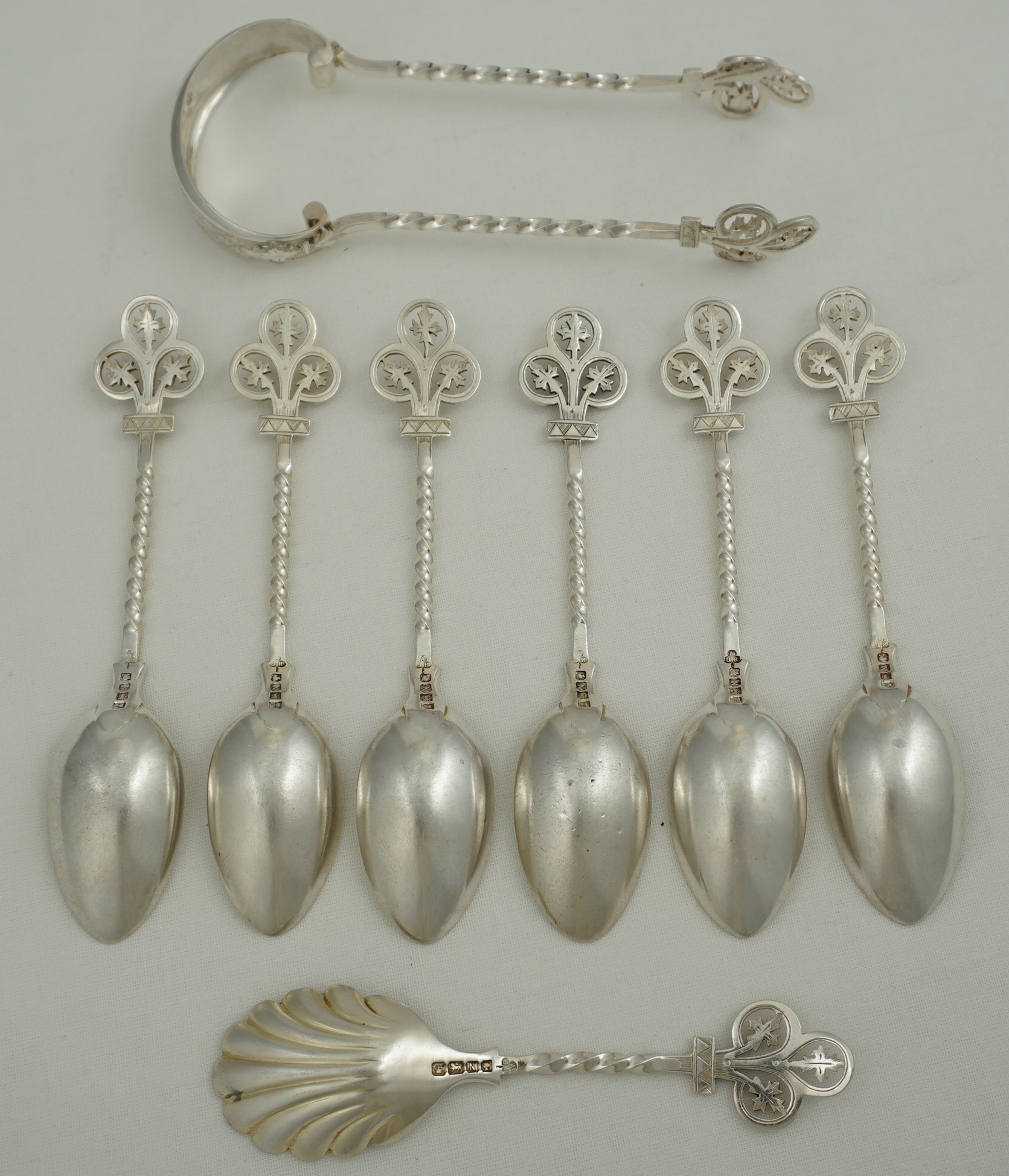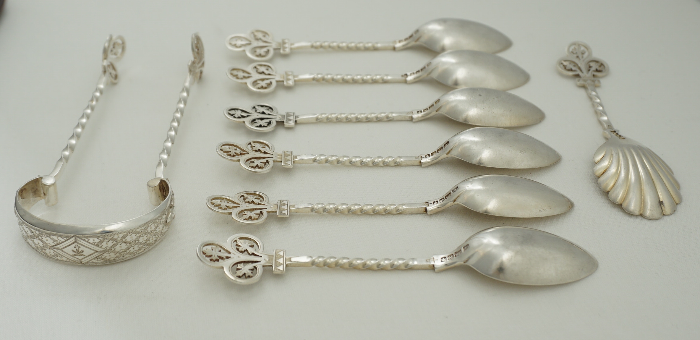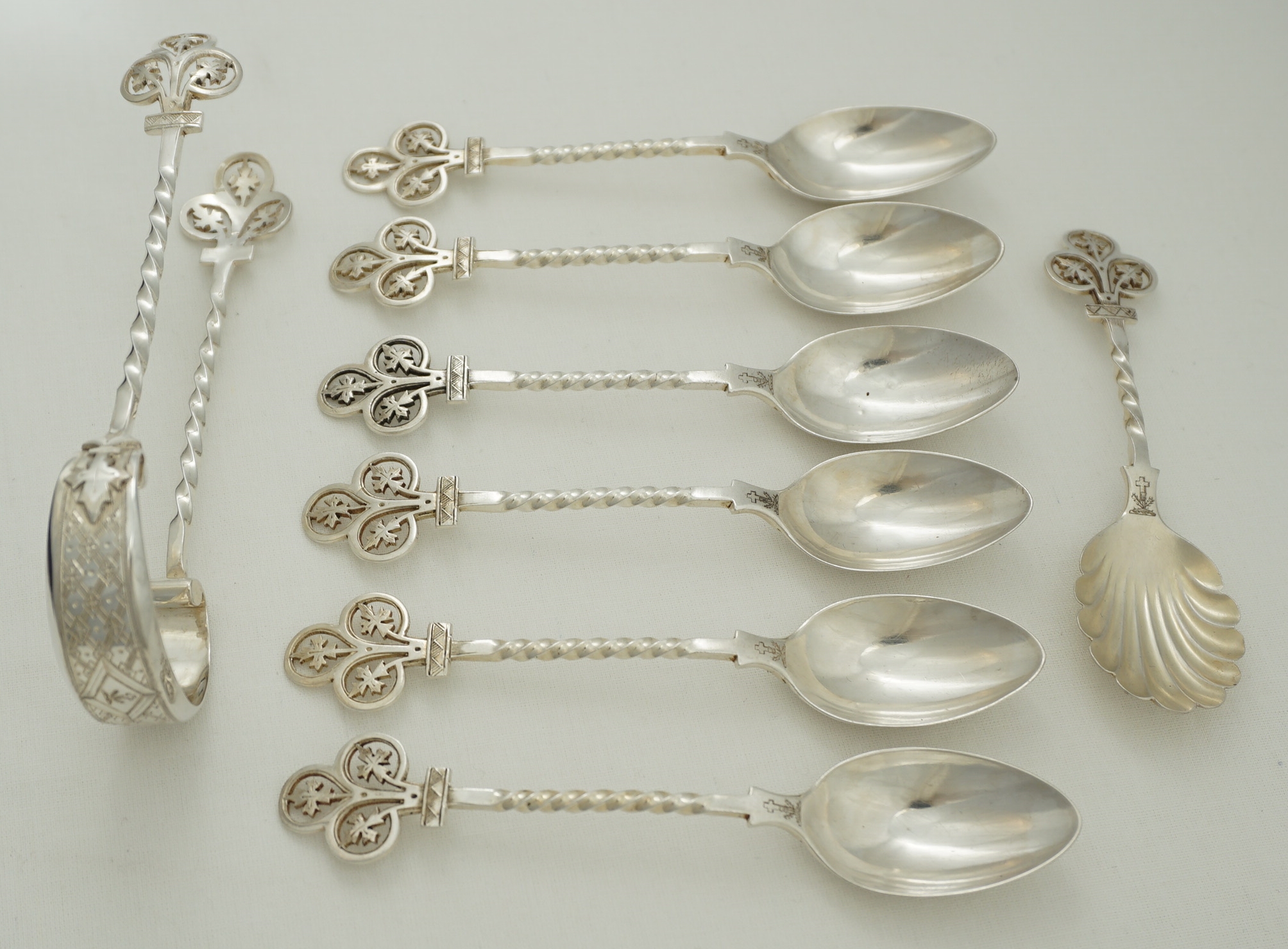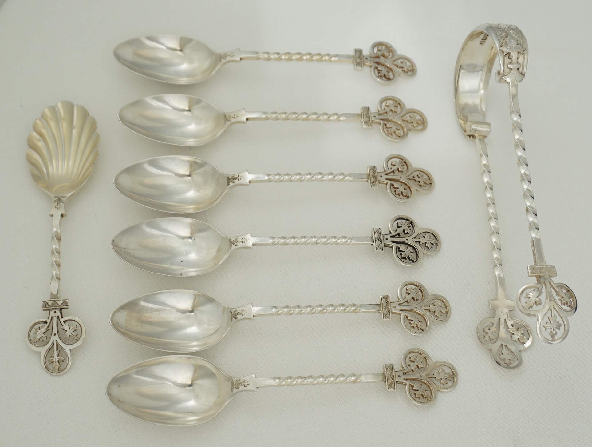 DESCRIPTION | Cased antique English Victorian aesthetic movement solid sterling silver tea equipage comprising of six teaspoons, one sugar shovel and one pair of sugar tongs. Each piece discreetly engraved with an unusual and small crest. |