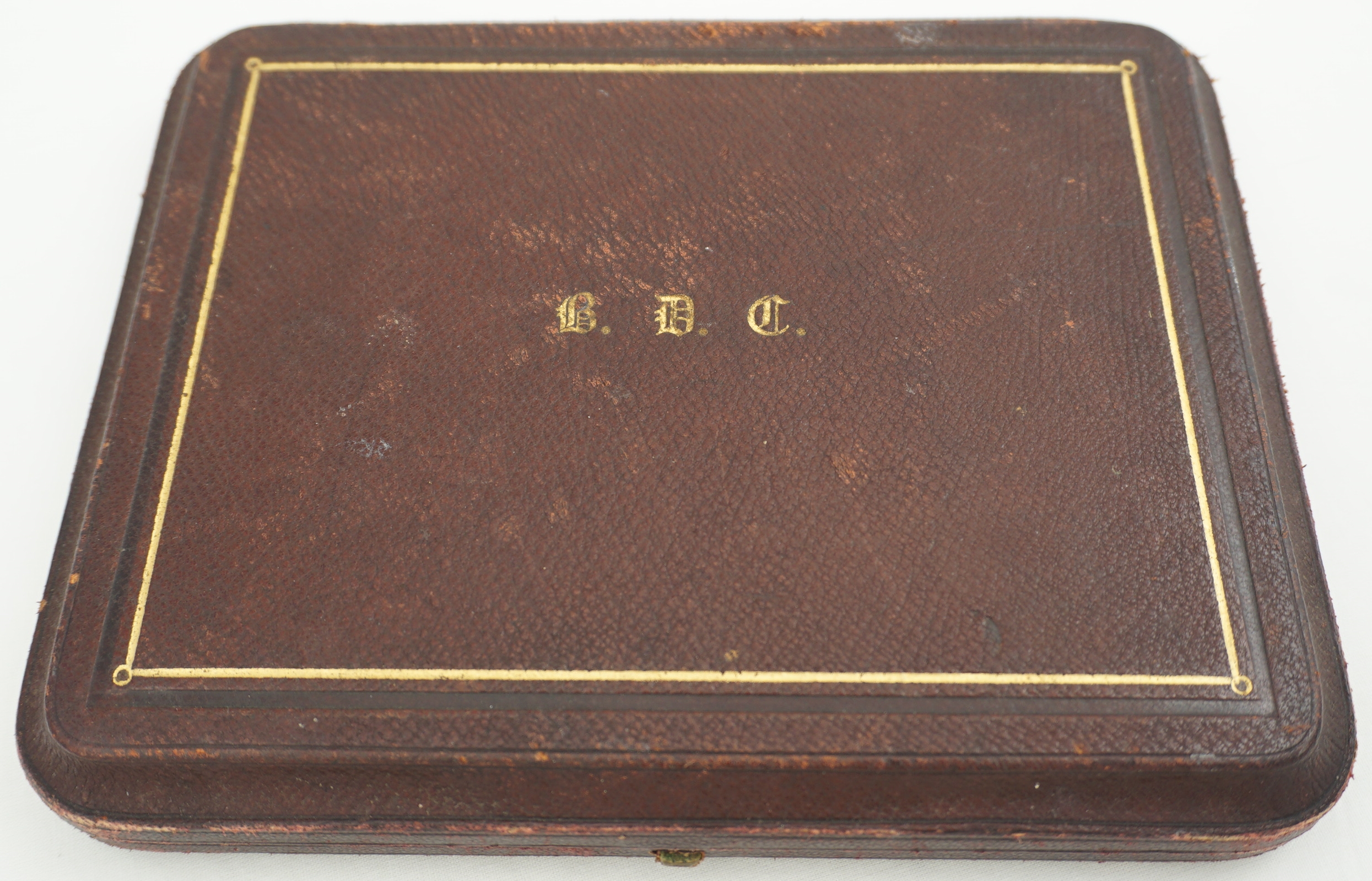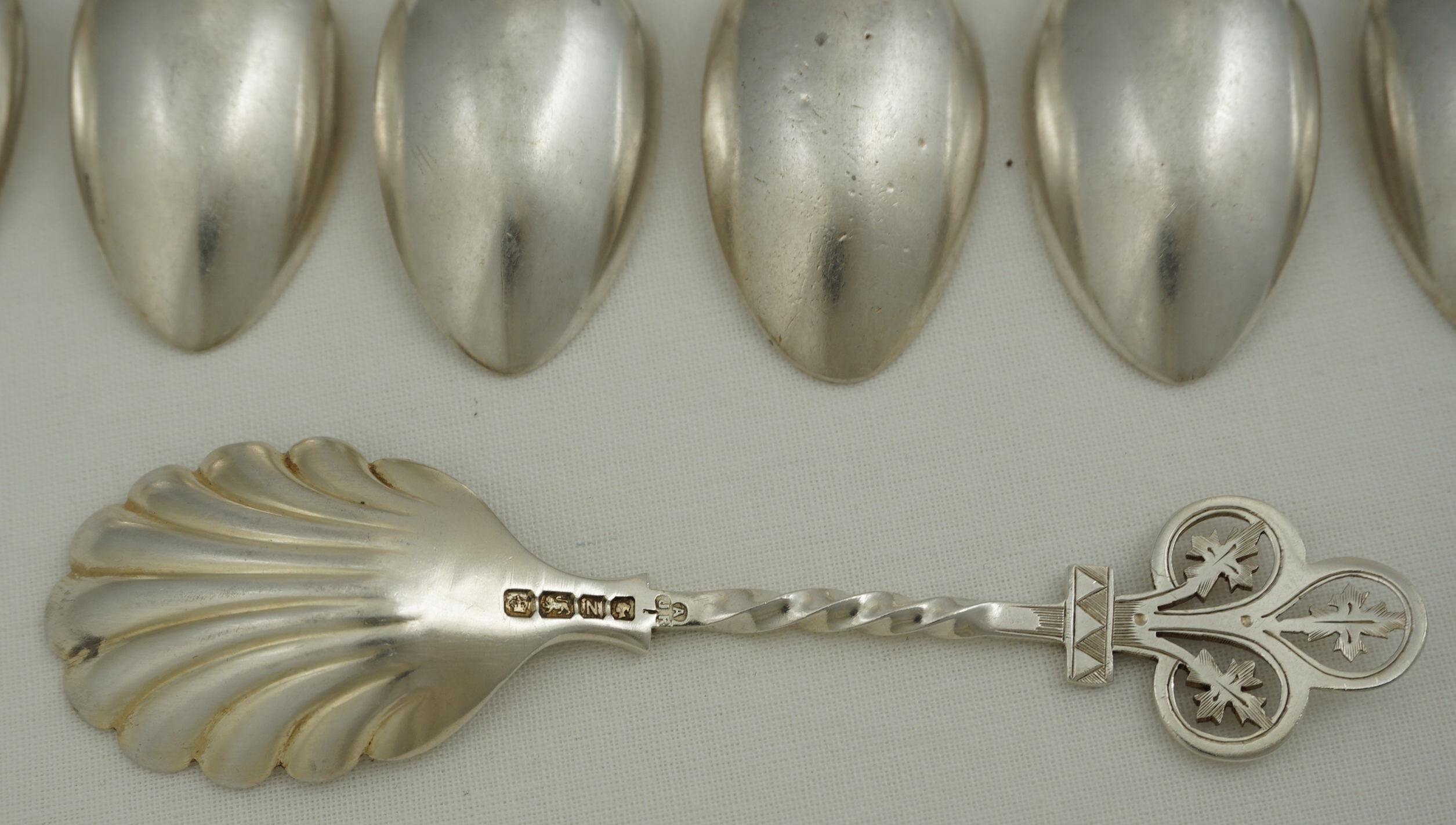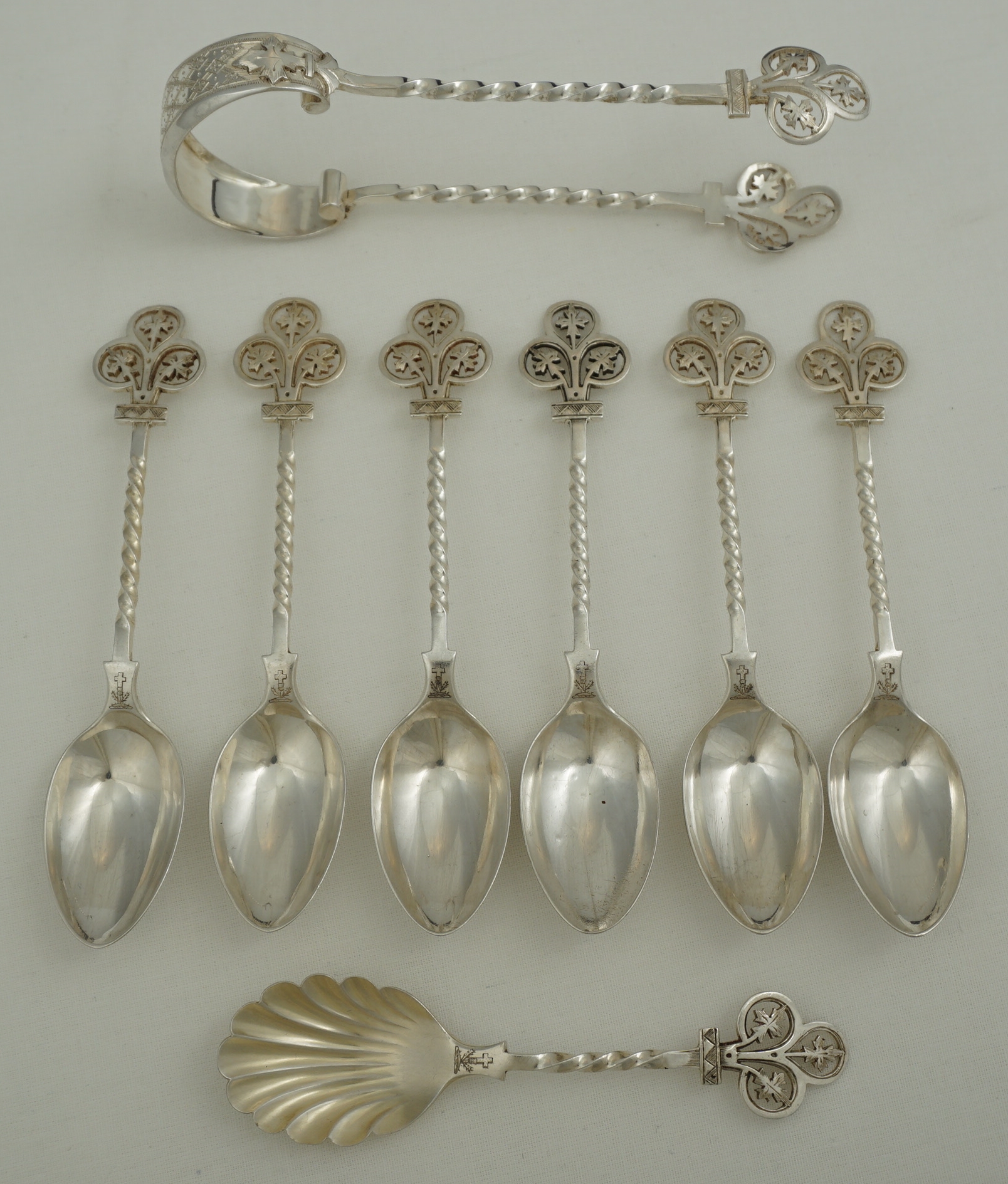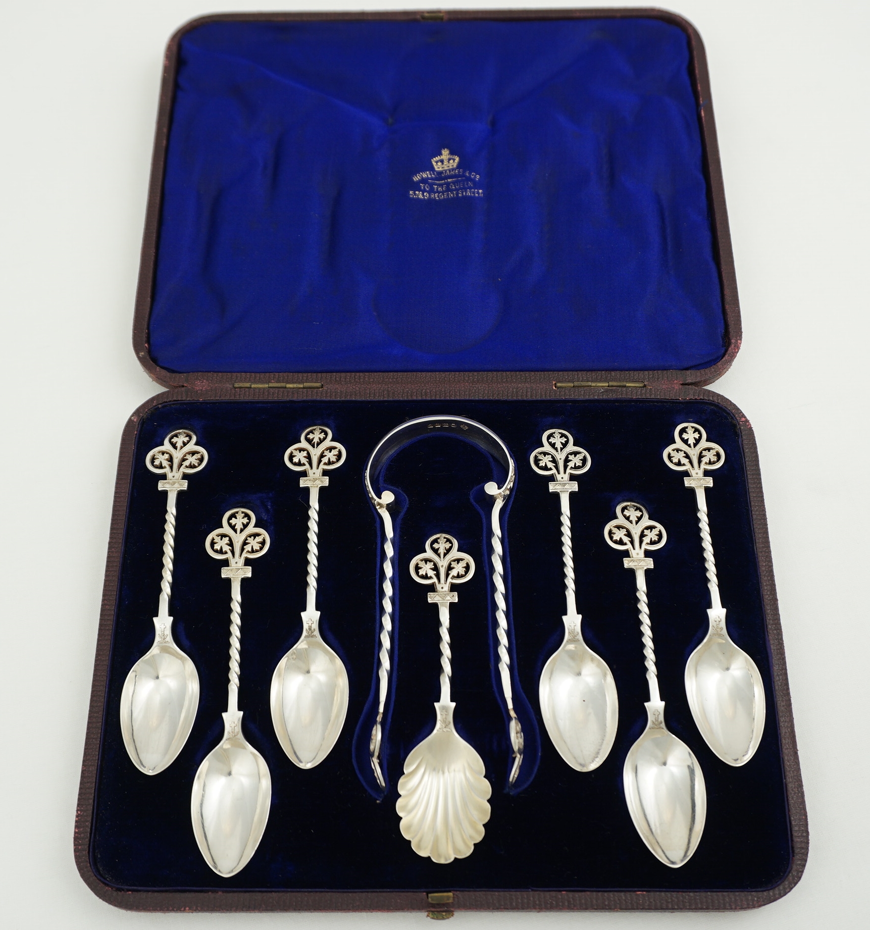 DESCRIPTION | Cased antique English Victorian aesthetic movement solid sterling silver tea equipage comprising of six teaspoons, one sugar shovel and one pair of sugar tongs. Each piece discreetly engraved with an unusual and small crest. |