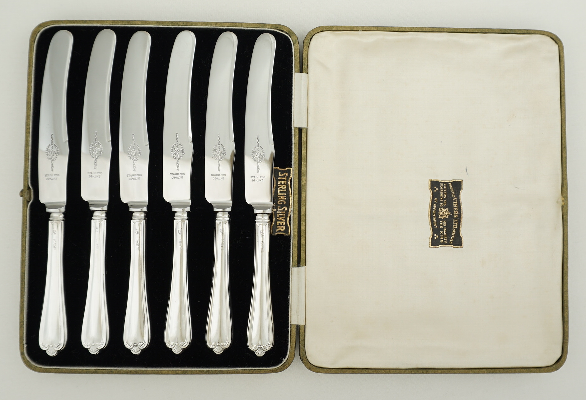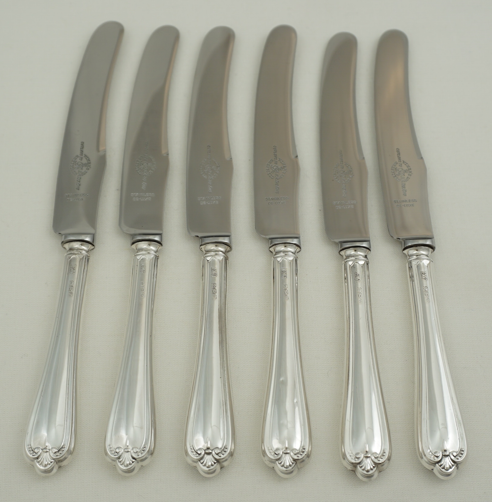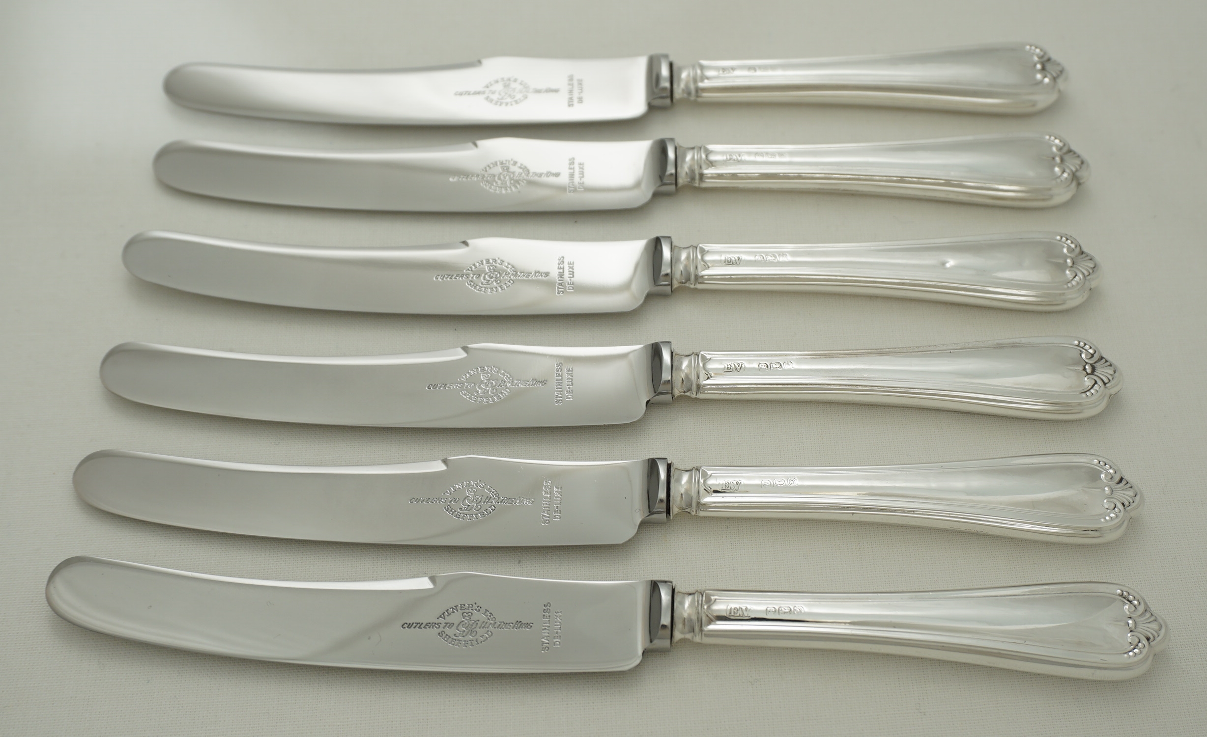 DESCRIPTION | Very good set of six vintage Art Deco English cake knives with traditional pitch loaded sterling silver handles and stainless steel blades. |