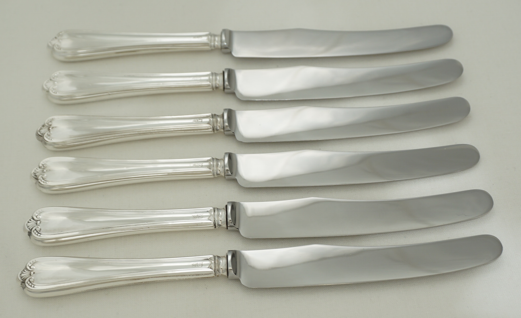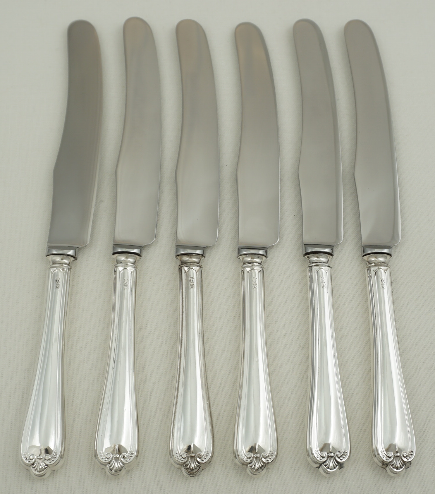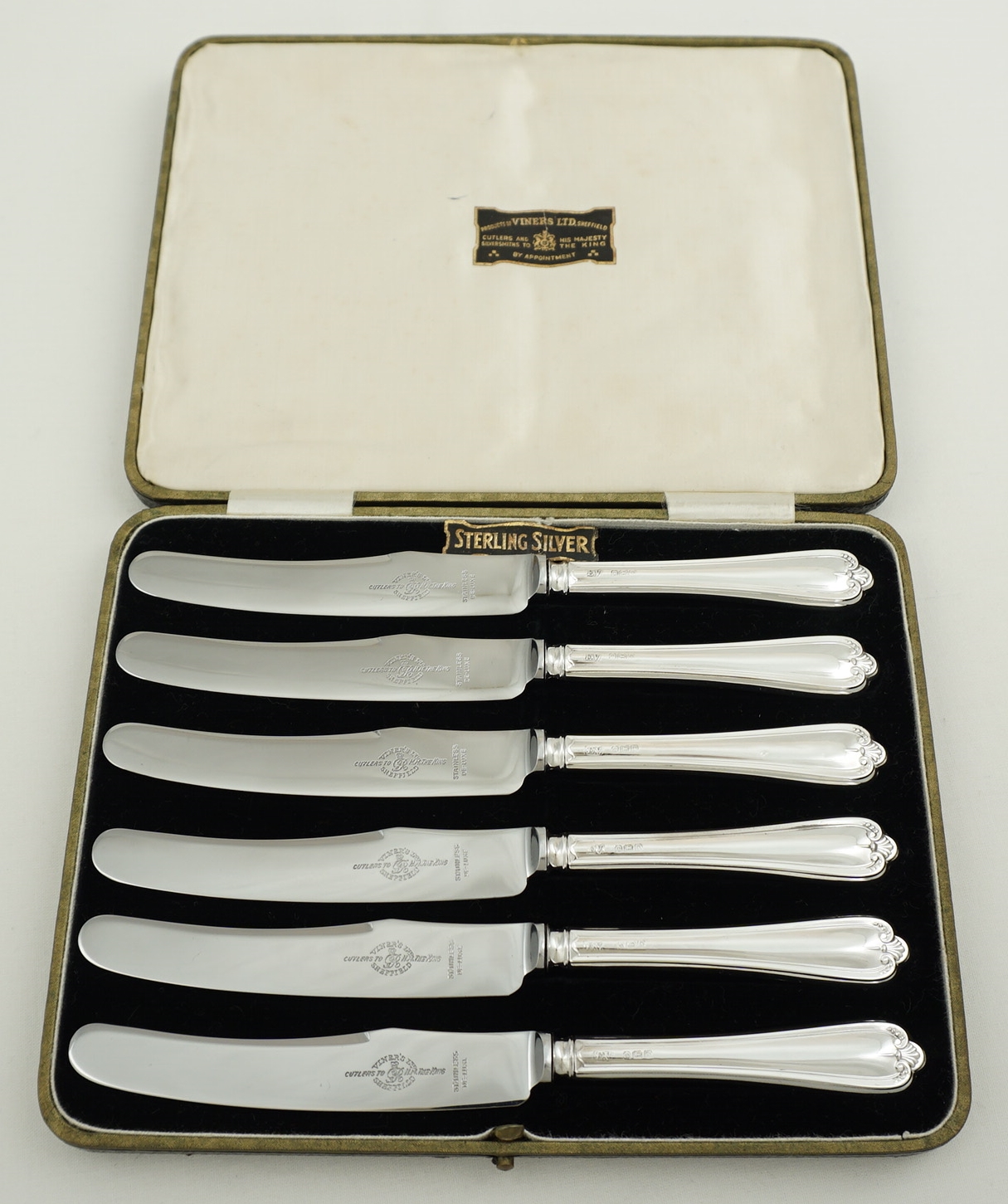 DESCRIPTION | Very good set of six vintage Art Deco English cake knives with traditional pitch loaded sterling silver handles and stainless steel blades. |