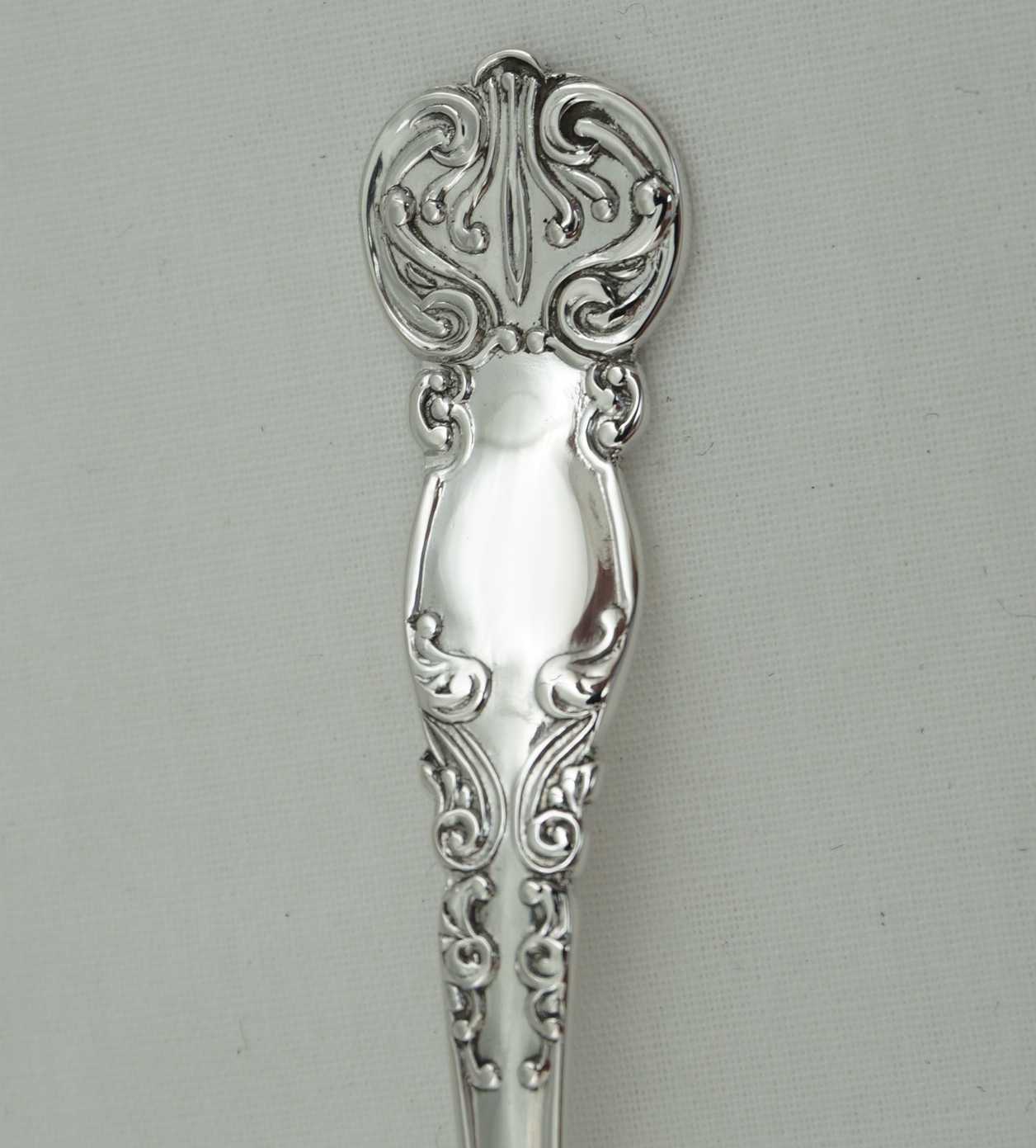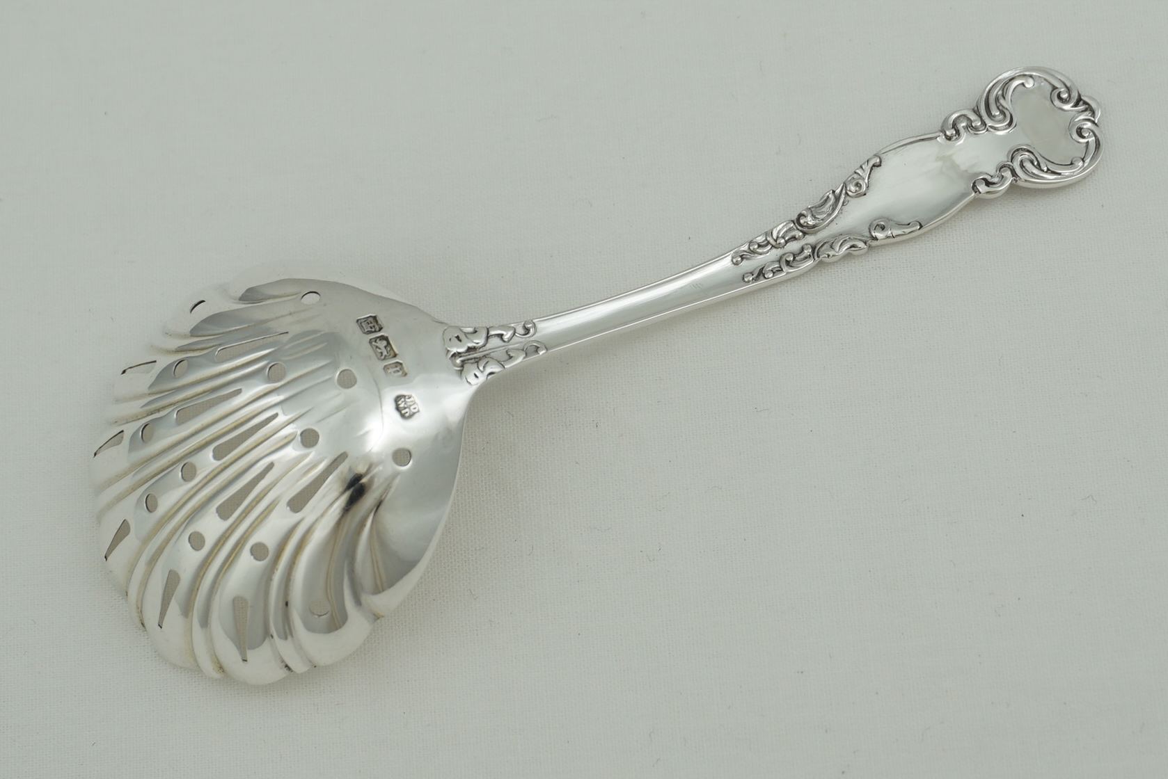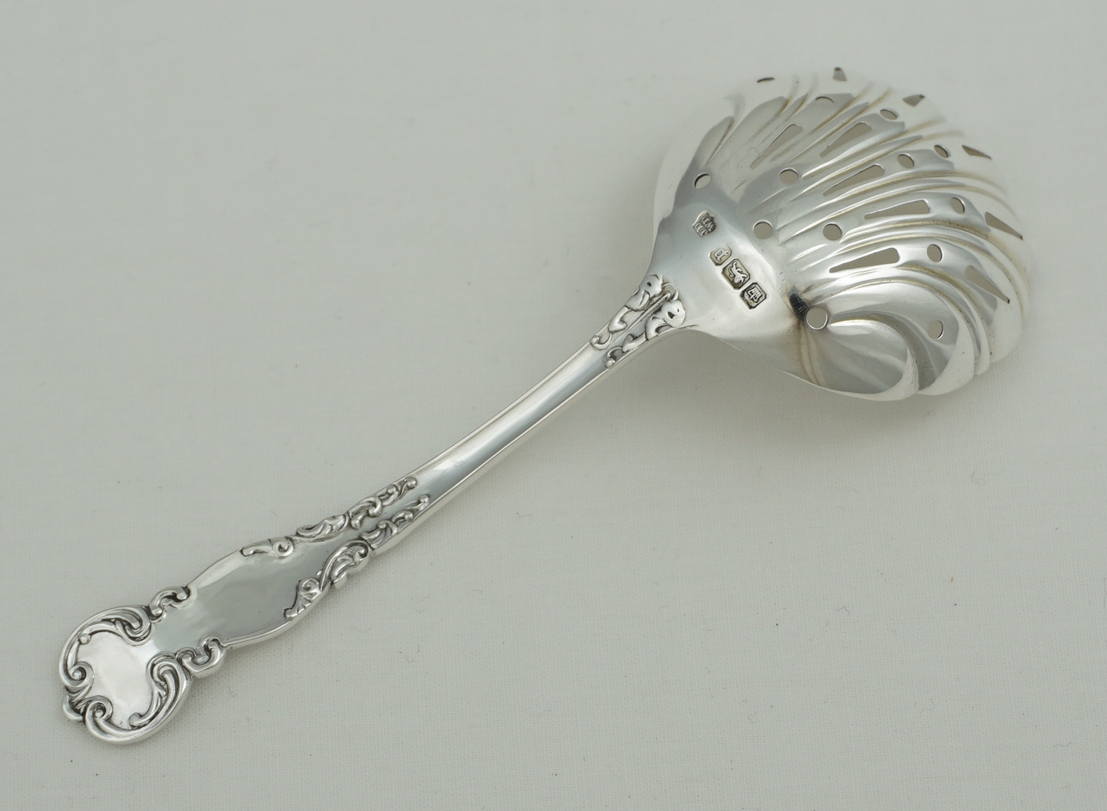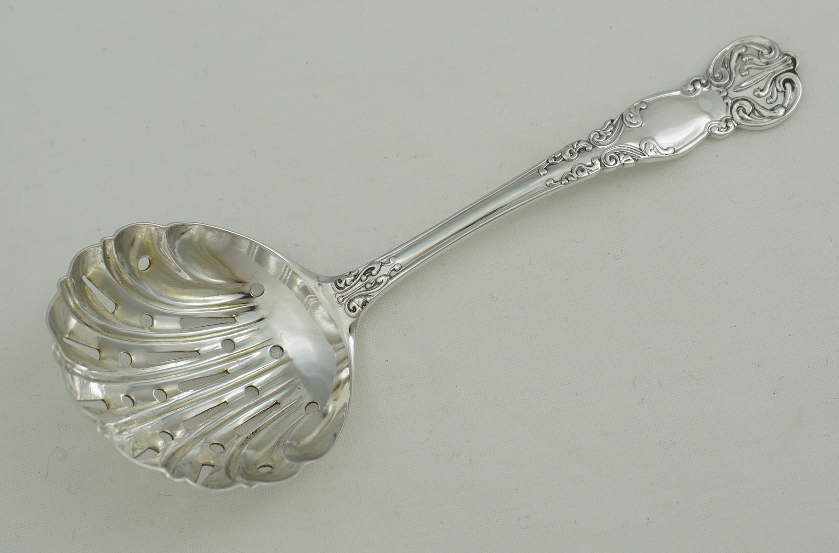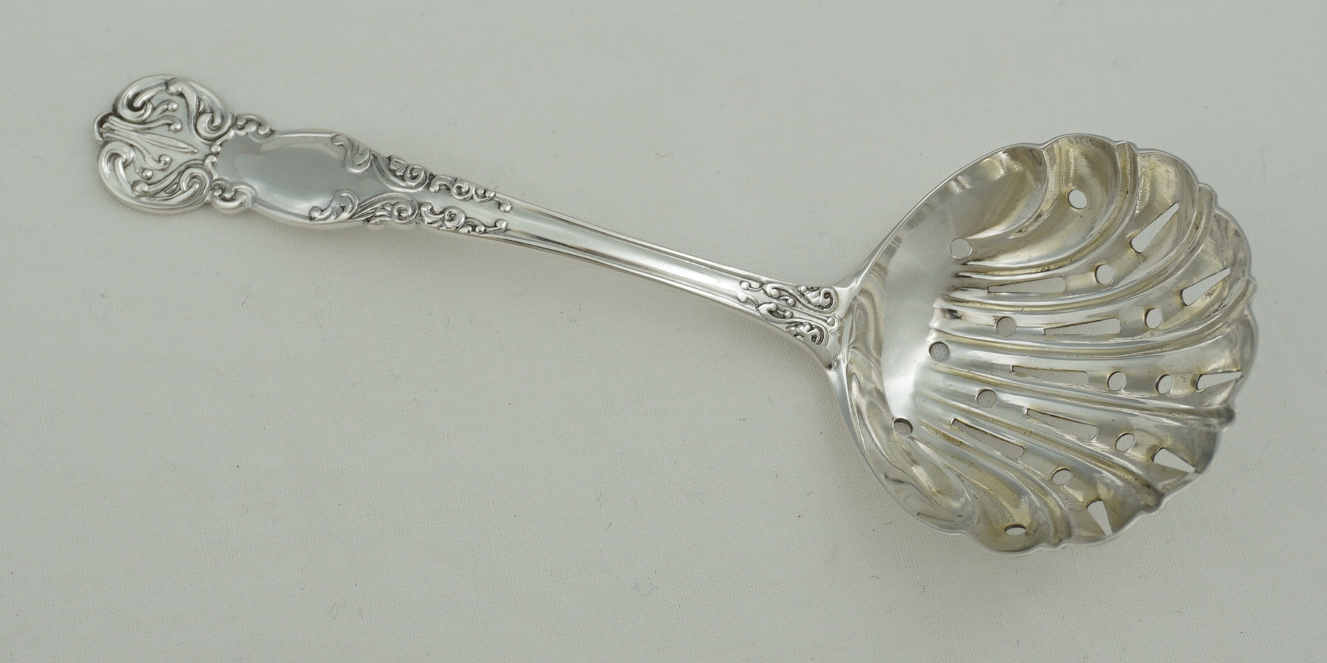 DESCRIPTION | Art Nouveau antique English solid sterling silver sifter ladle with a faintly gilded bowl. |
