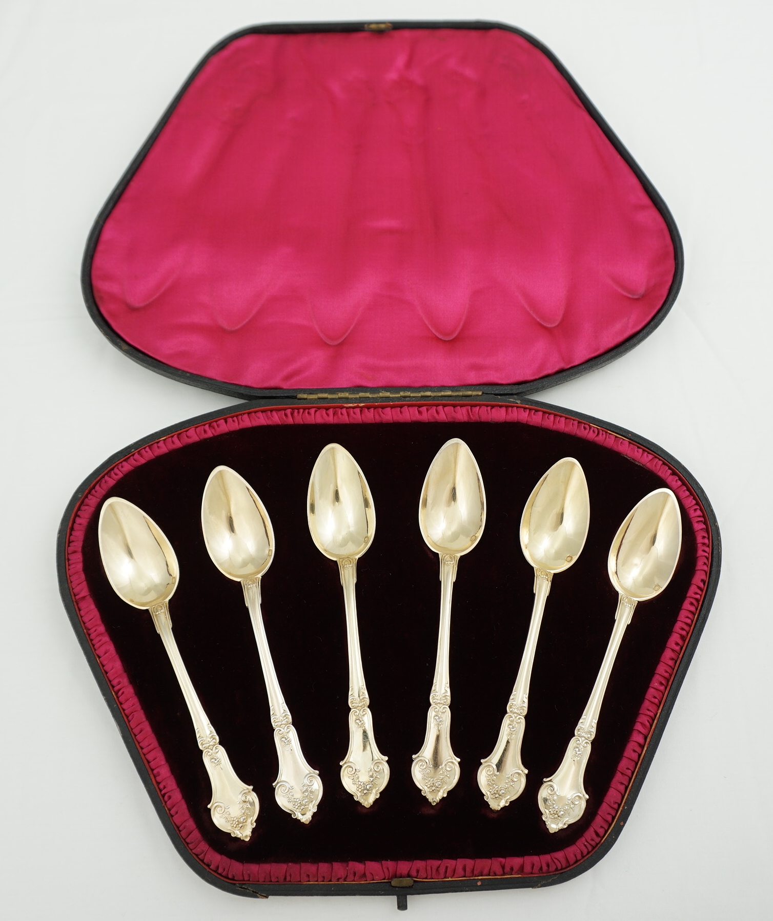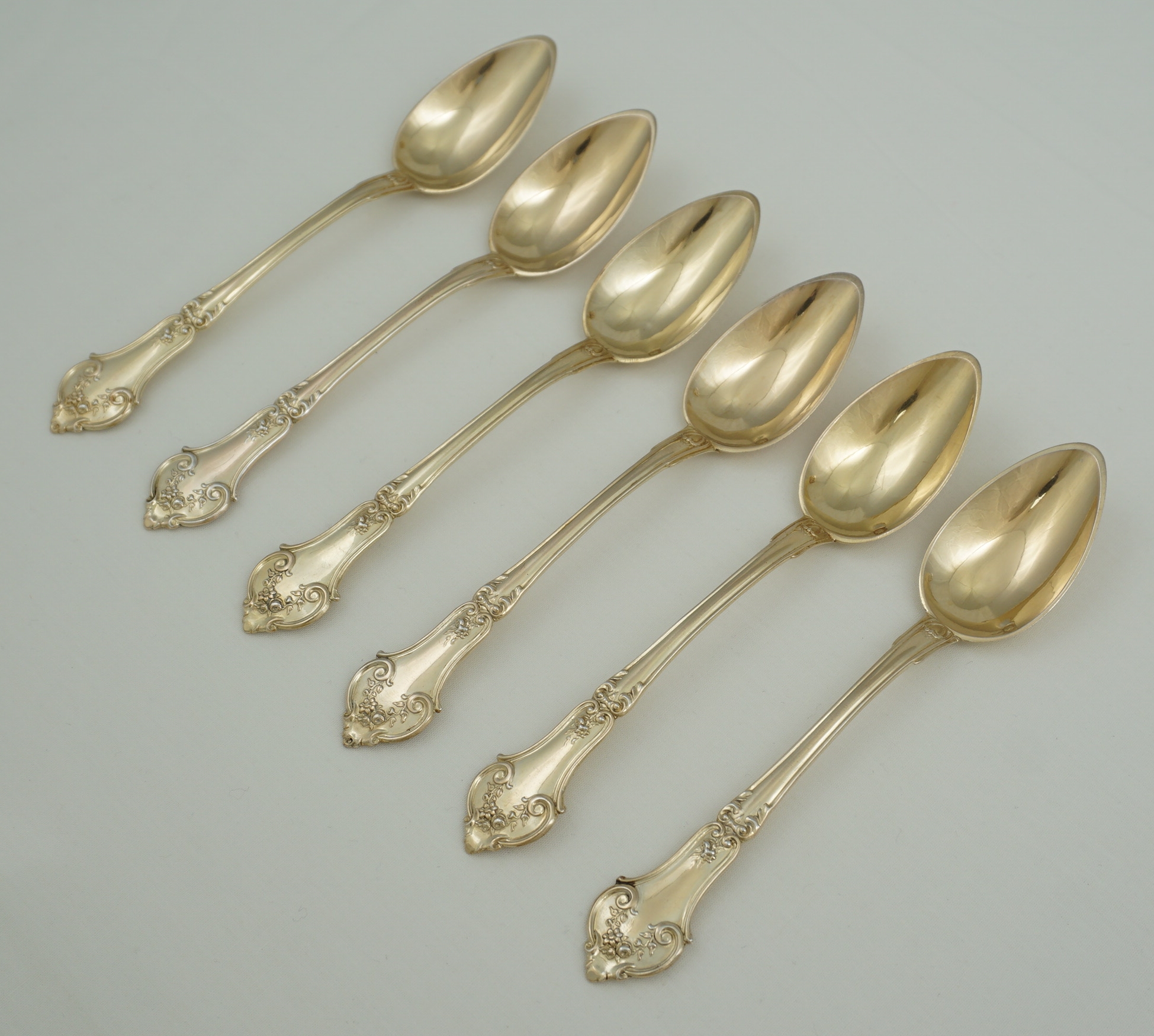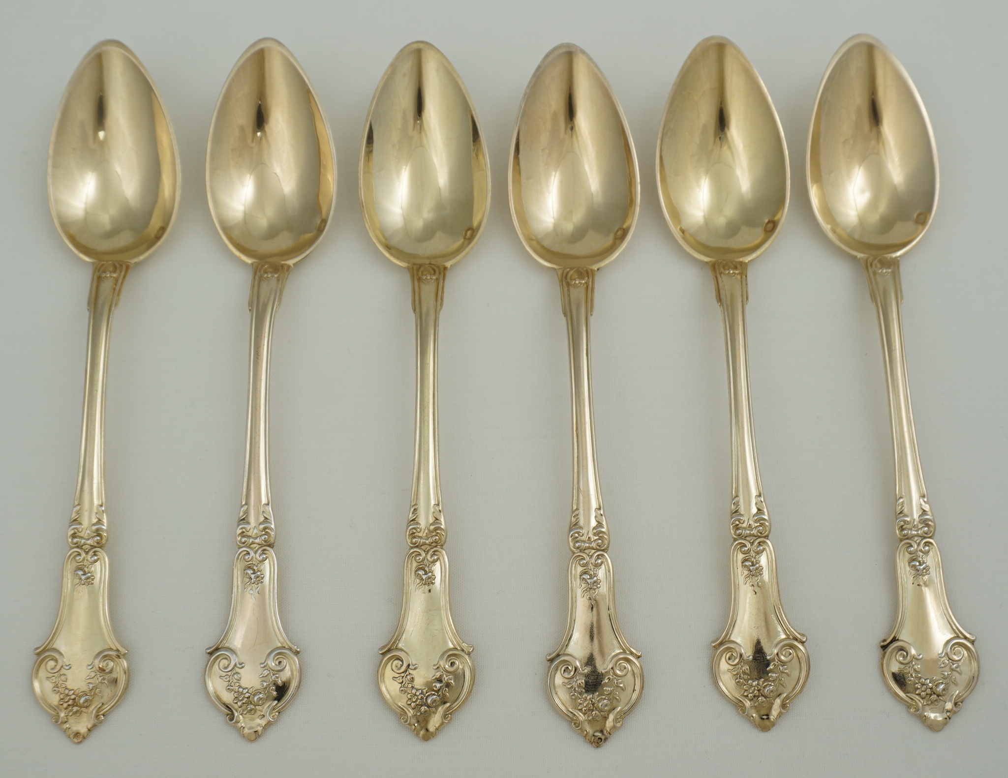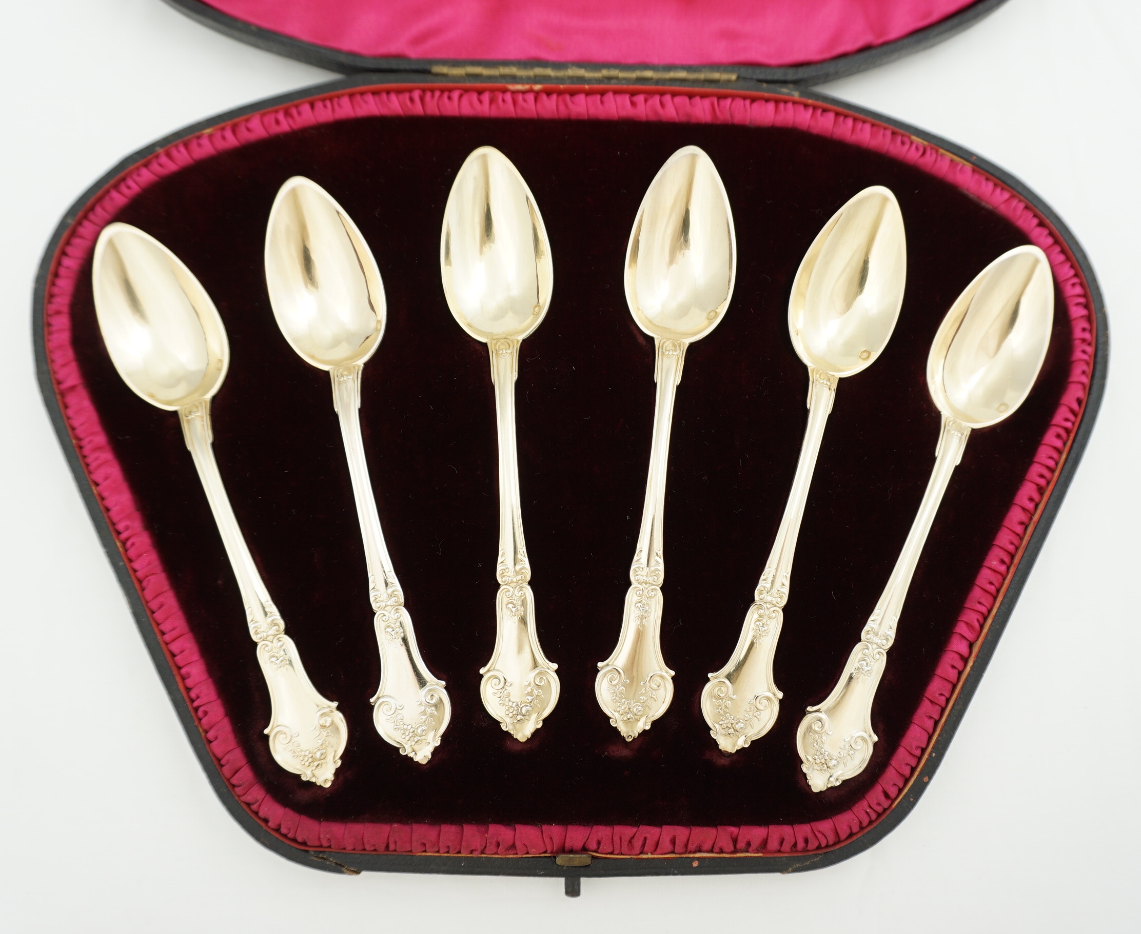 DESCRIPTION | Pretty and cased set of six antique/vintage French solid gilded silver teaspoons. |