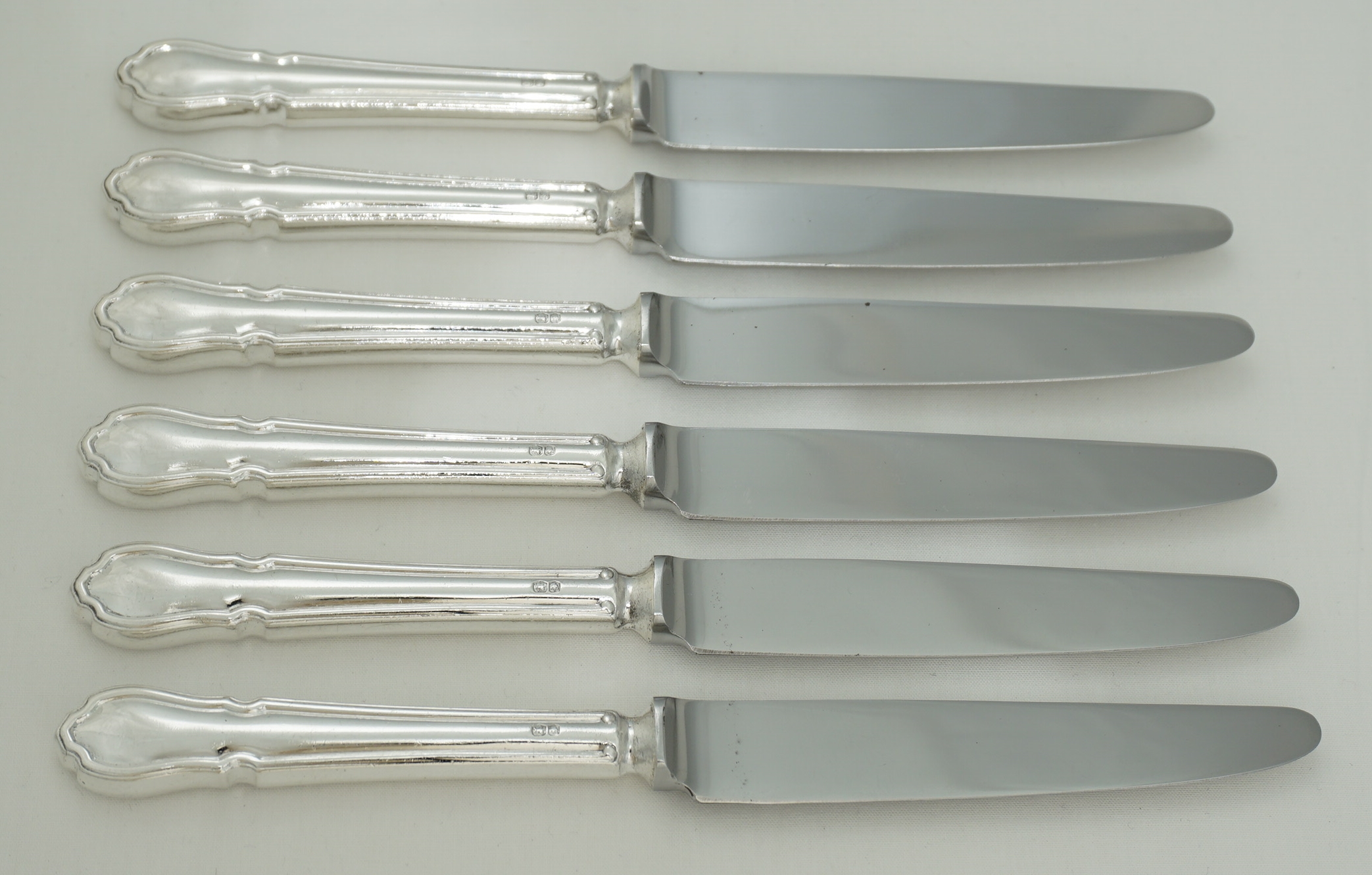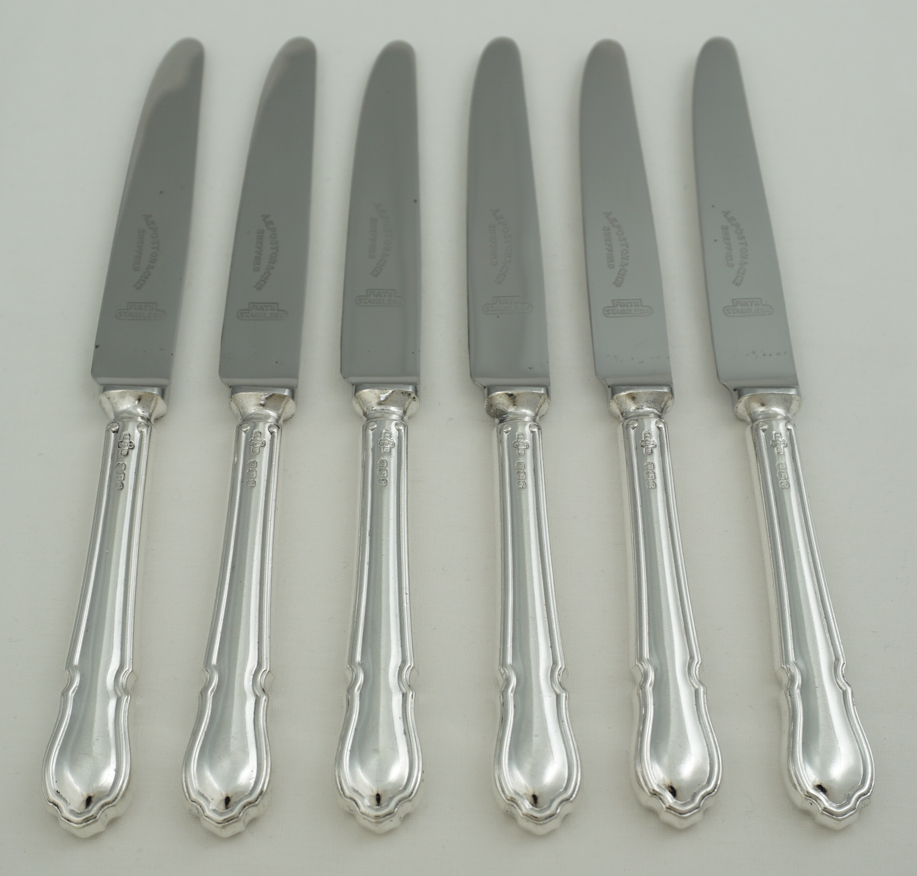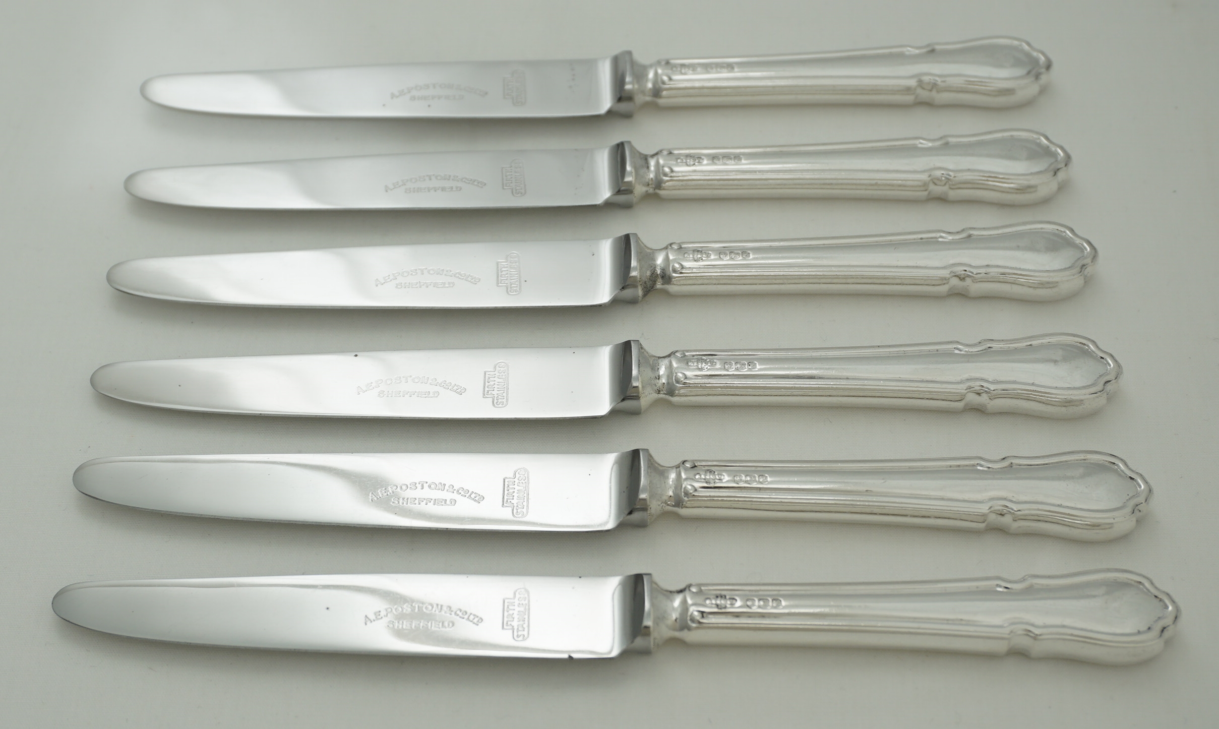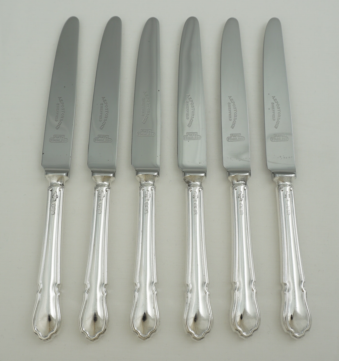 DESCRIPTION | Good and useful set of six vintage English tea knives with loaded solid sterling silver handles and stainless steel blades. These benefit from soldered joints between the handles and blades so could be cleaned in a dishwasher. |