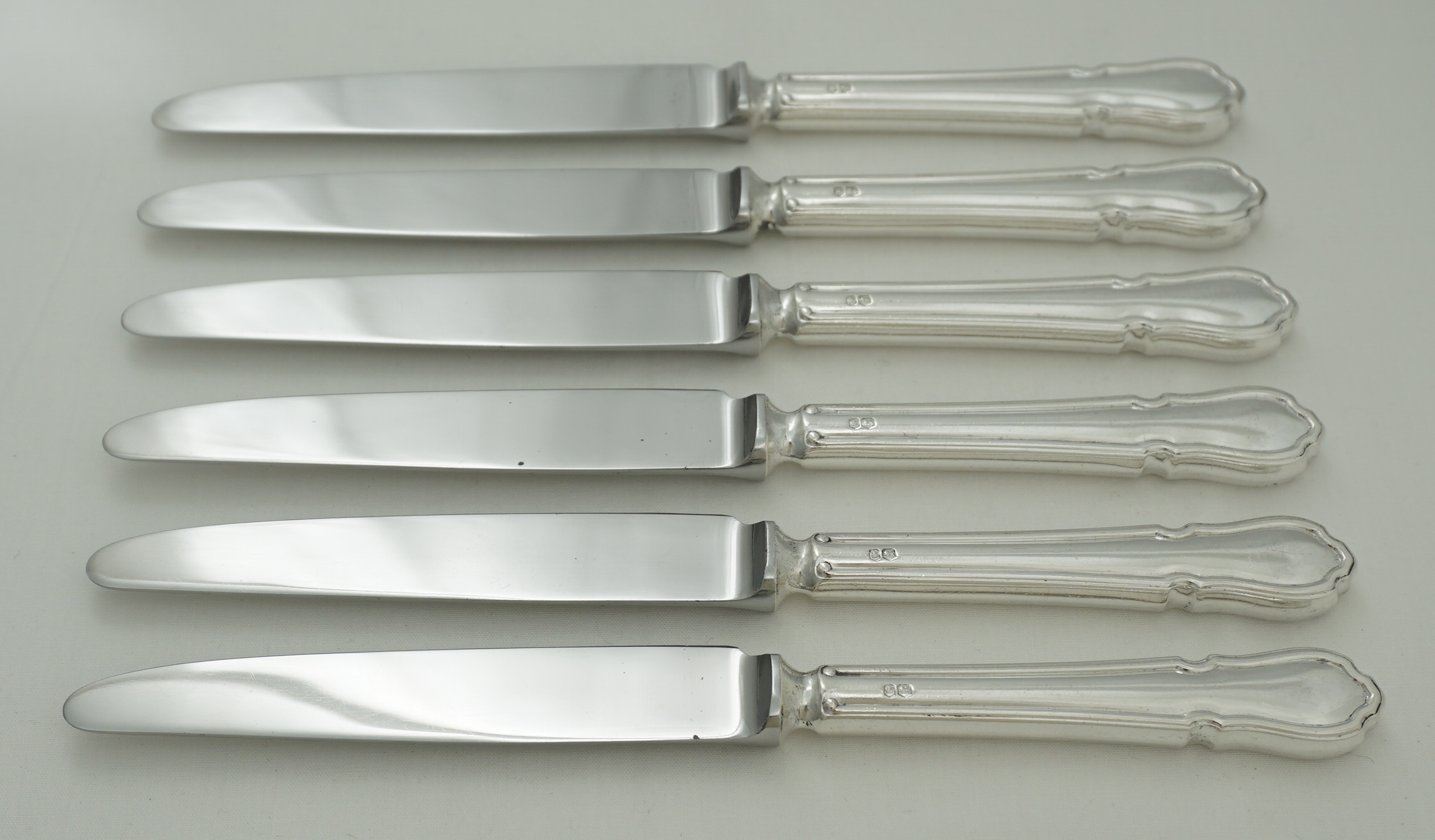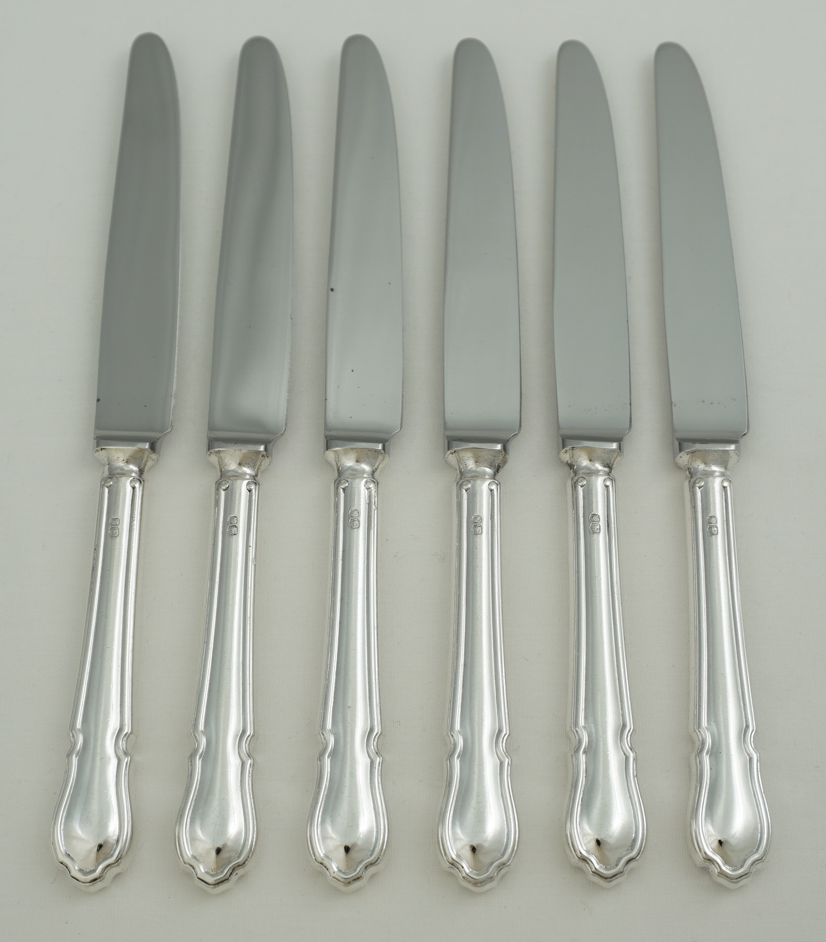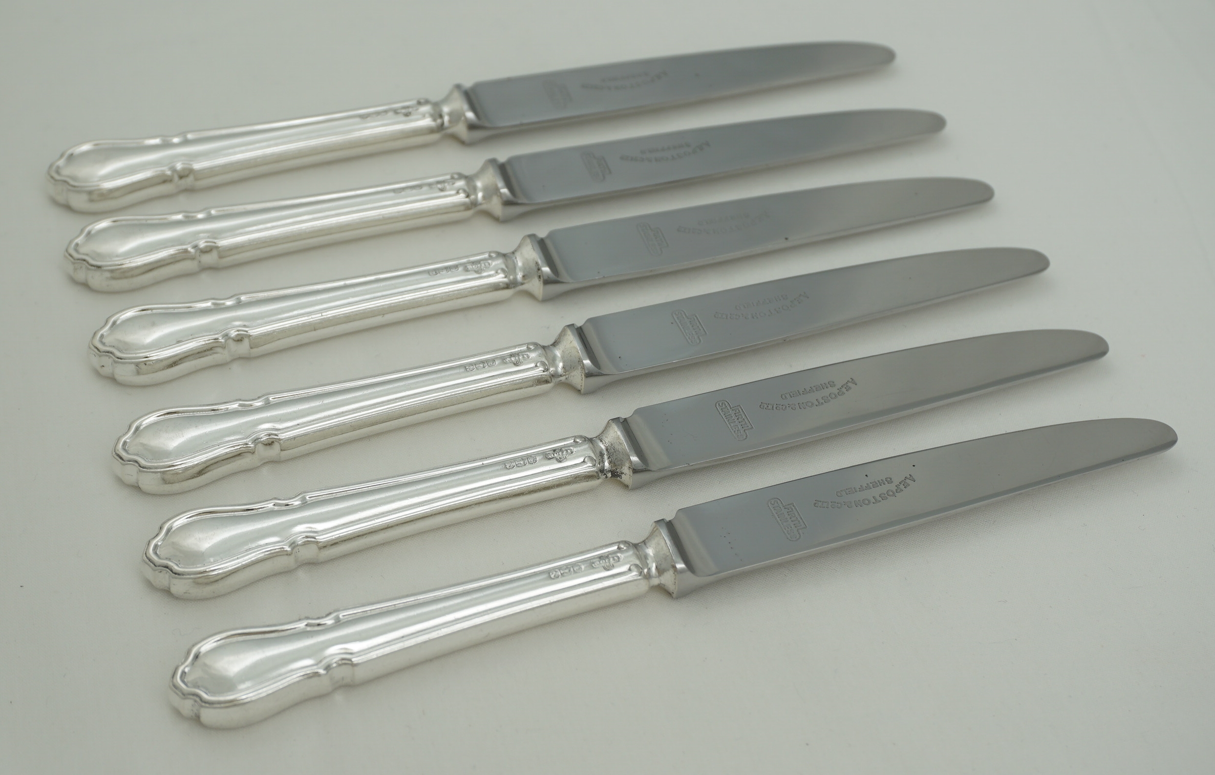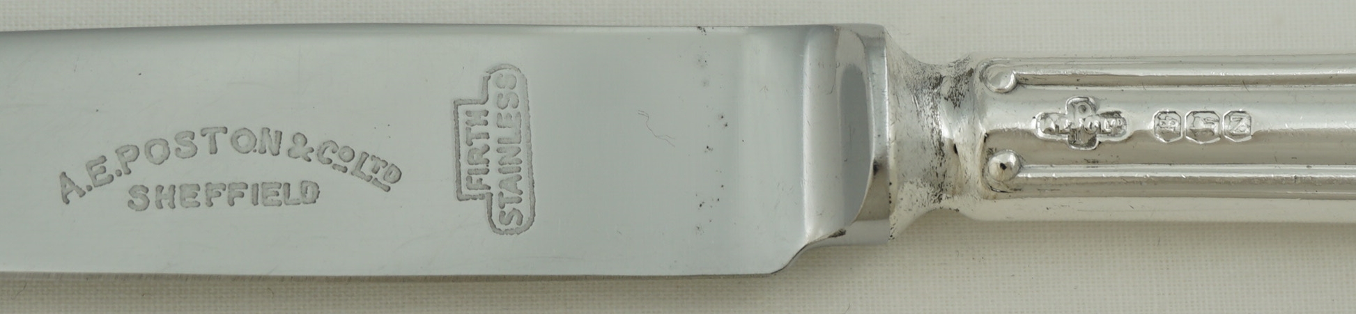 DESCRIPTION | Good and useful set of six vintage English tea knives with loaded solid sterling silver handles and stainless steel blades. These benefit from soldered joints between the handles and blades so could be cleaned in a dishwasher. |
