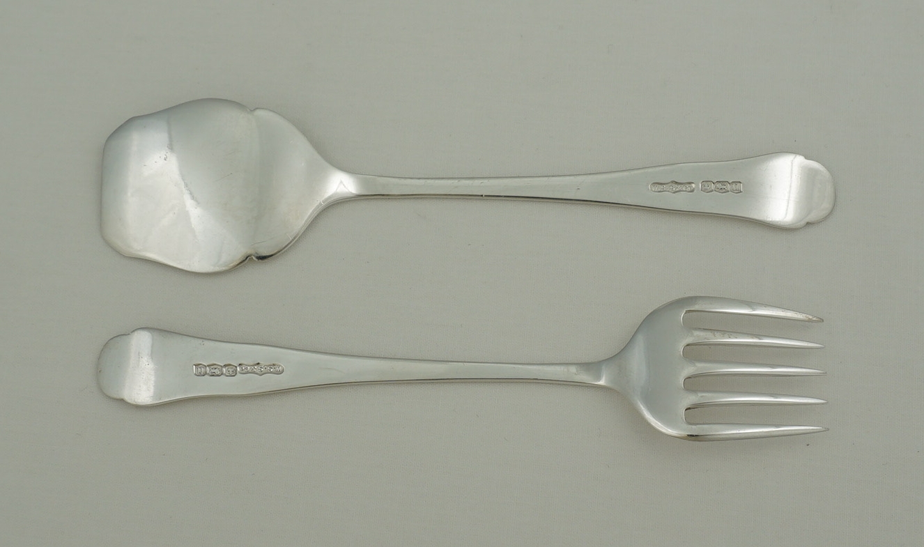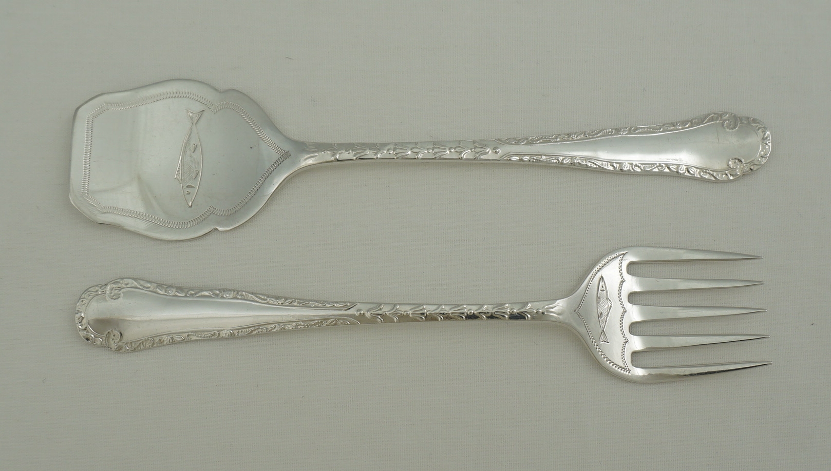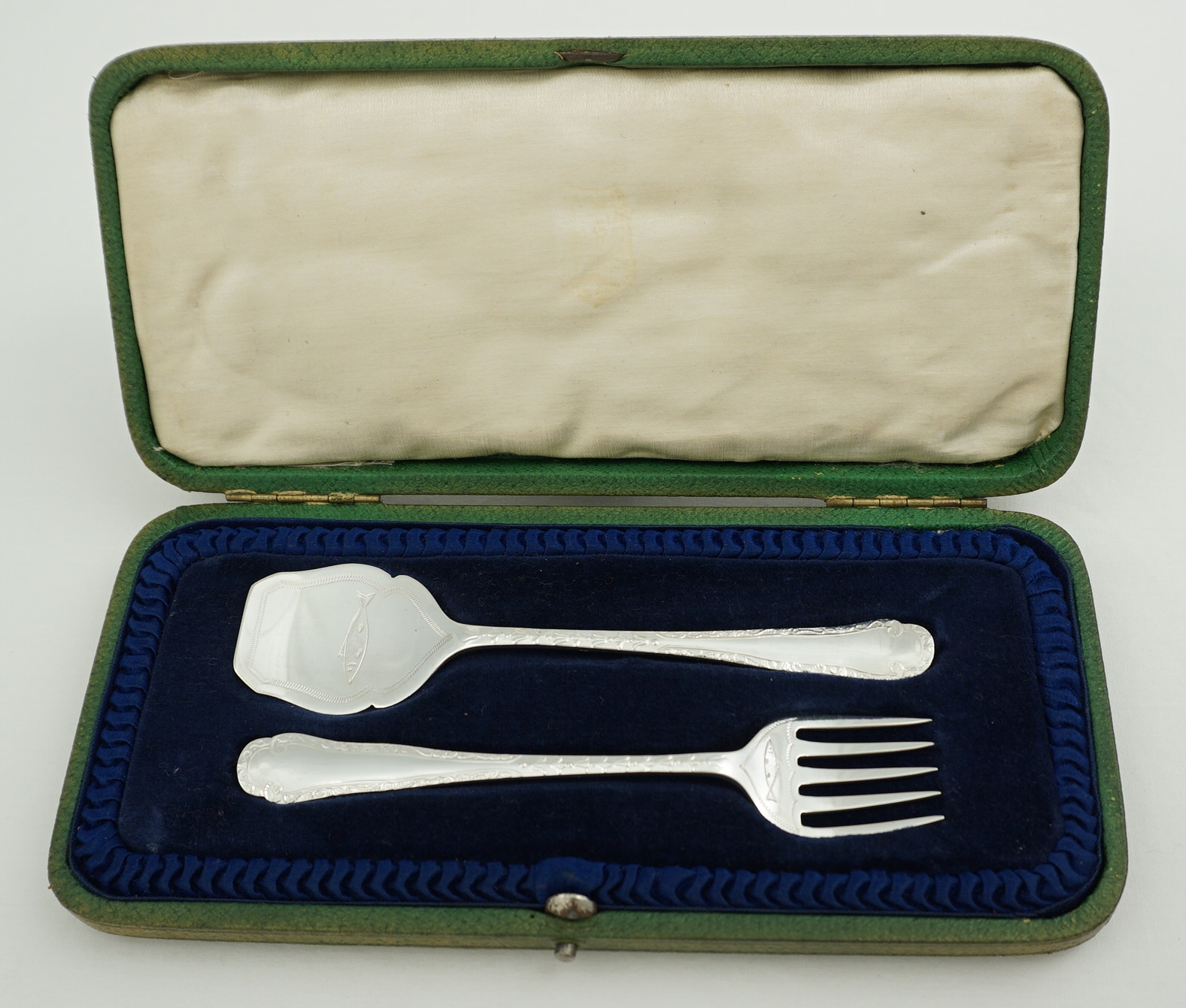 DESCRIPTION | Pretty and cased pair of vintage English solid sterling silver sardine servers with engraved sardine decoration. |