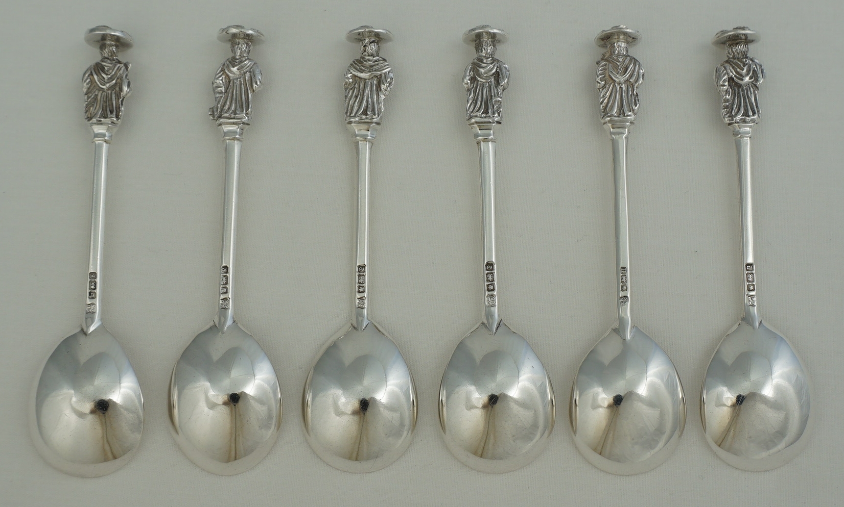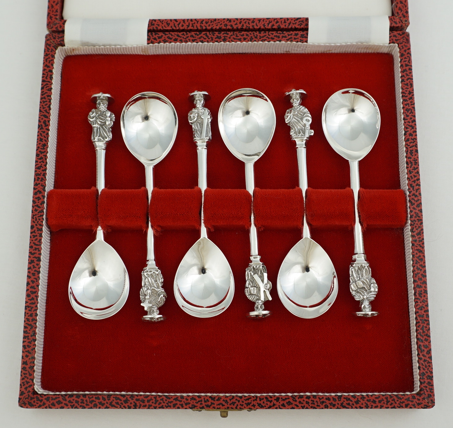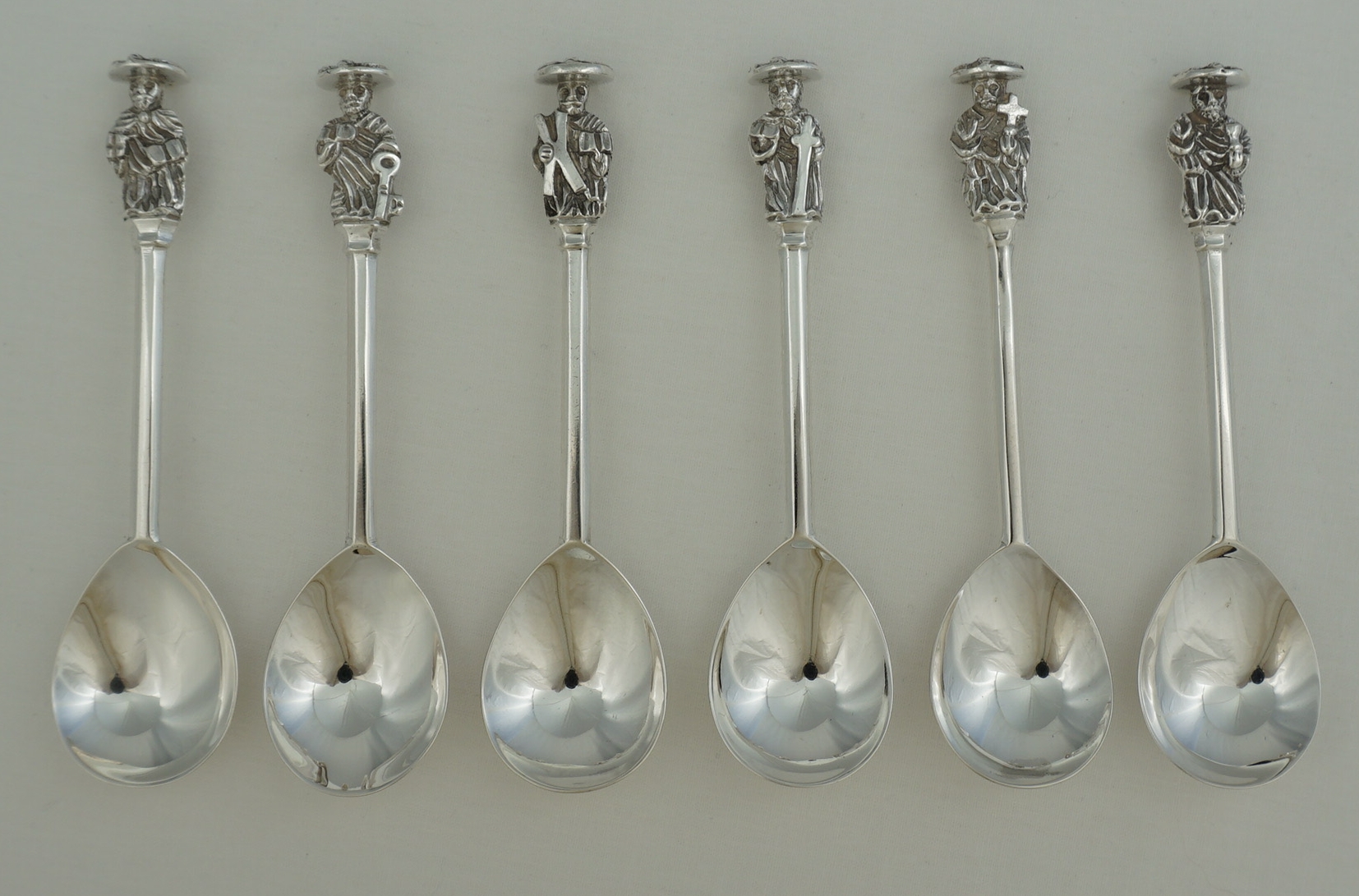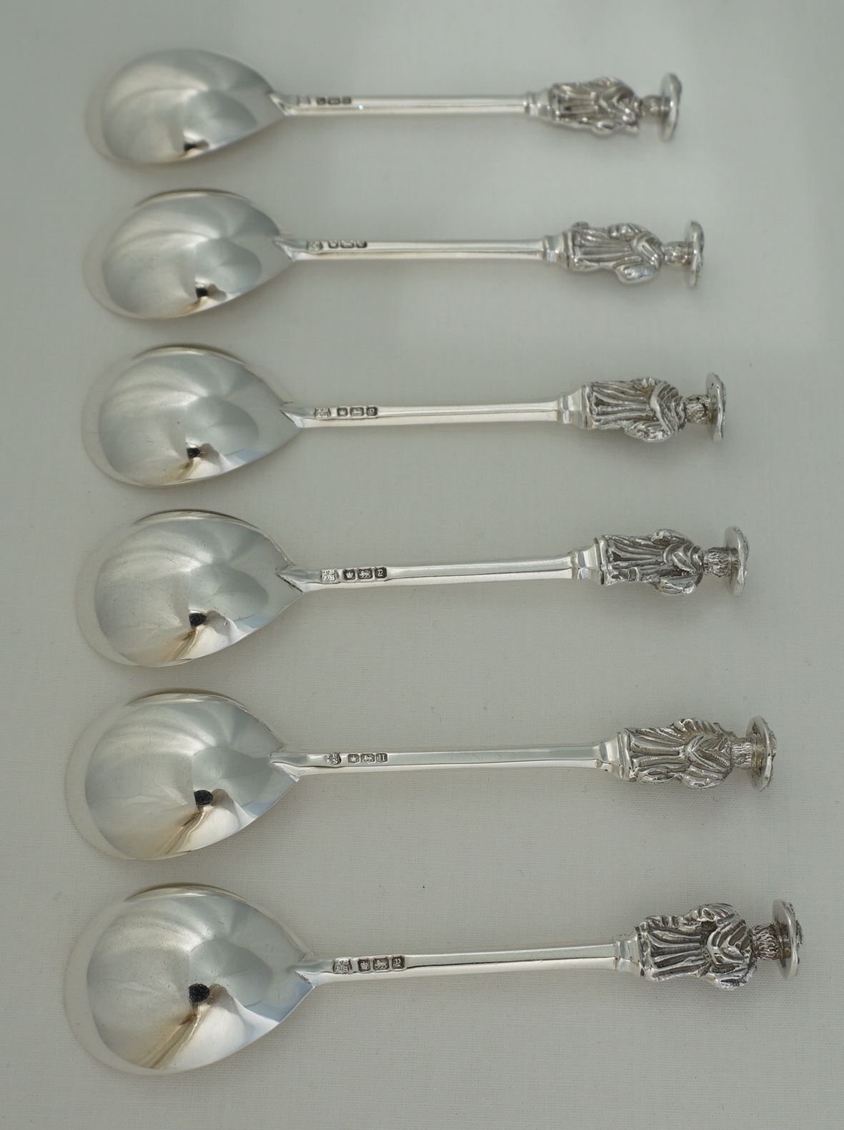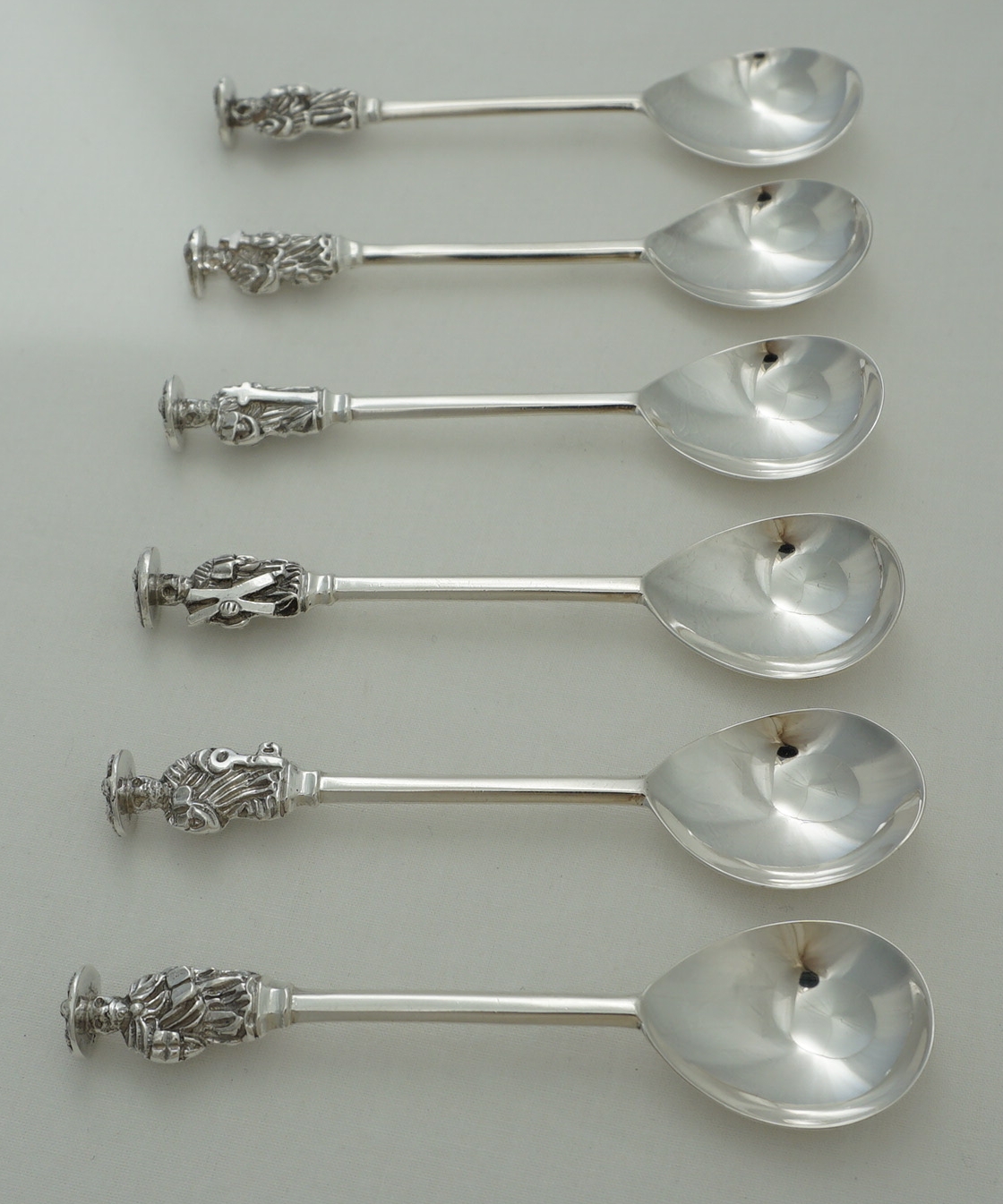 DESCRIPTION | Unusually good set of six antique English solid sterling silver seal top apostle spoons. I think that the little lads are: Peter, John, Andrew, Paul, The Master and one unknown. |