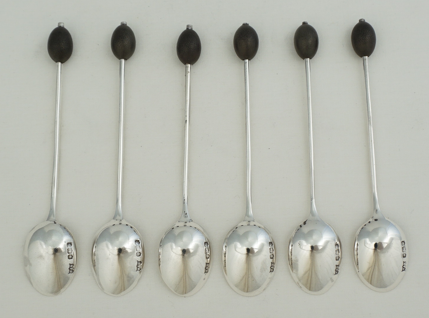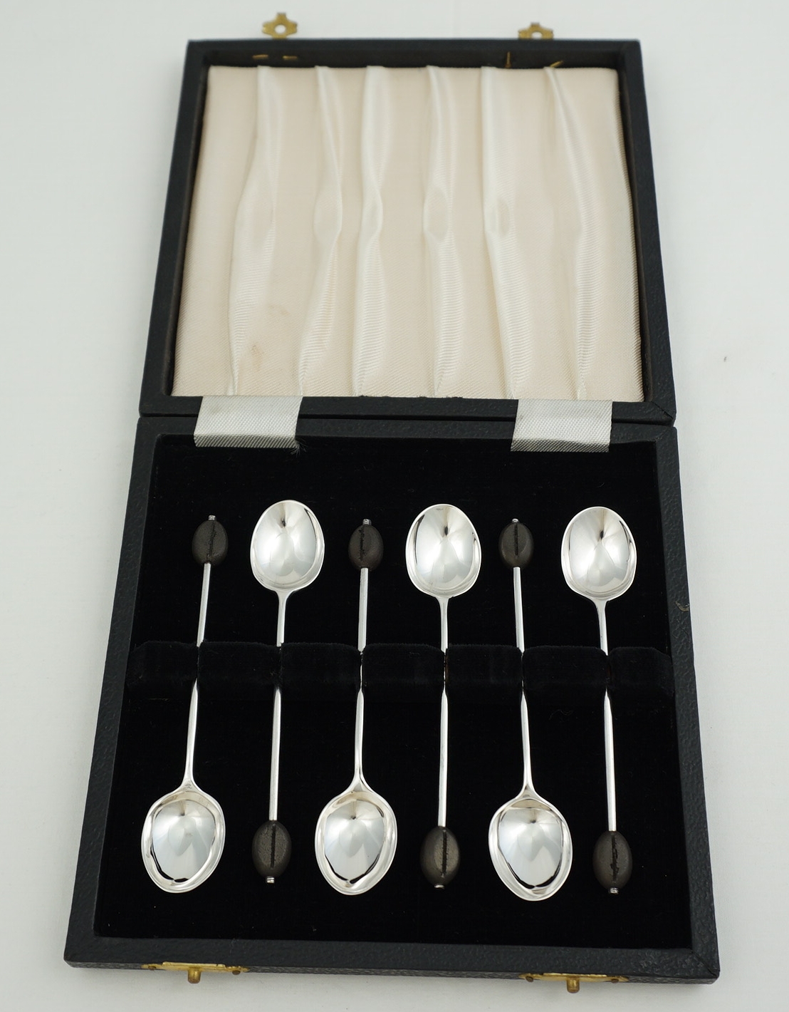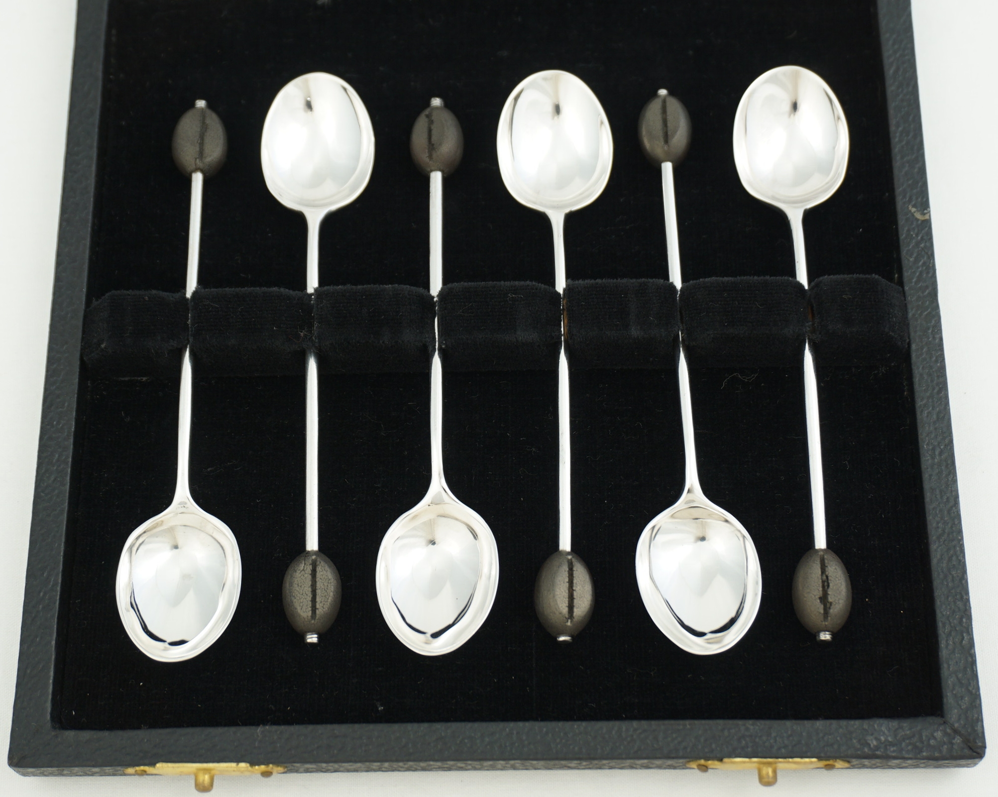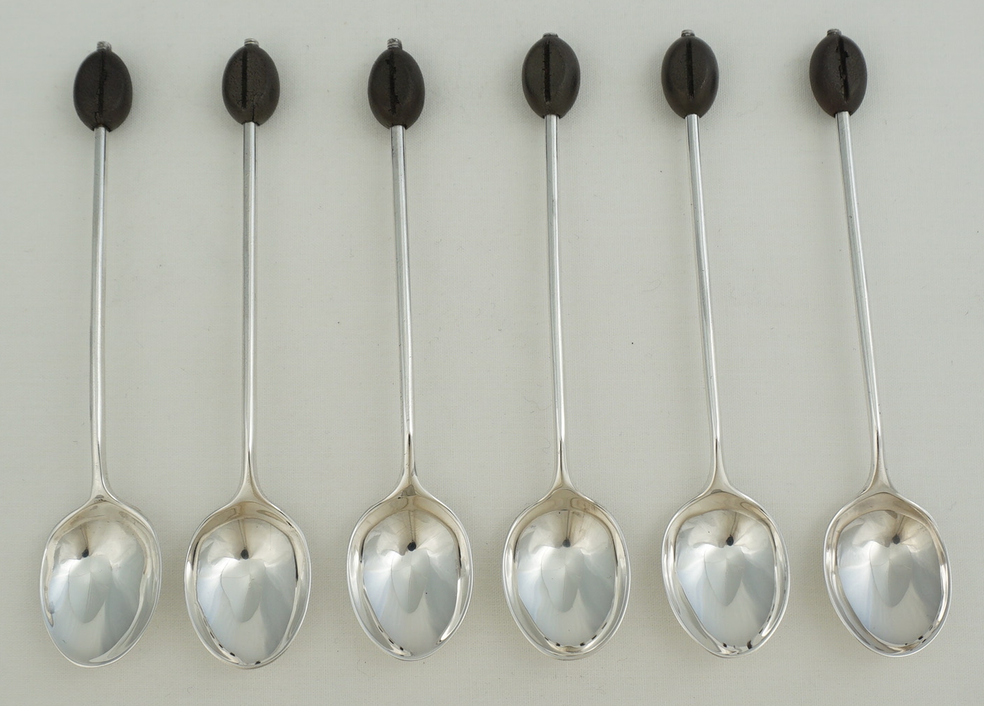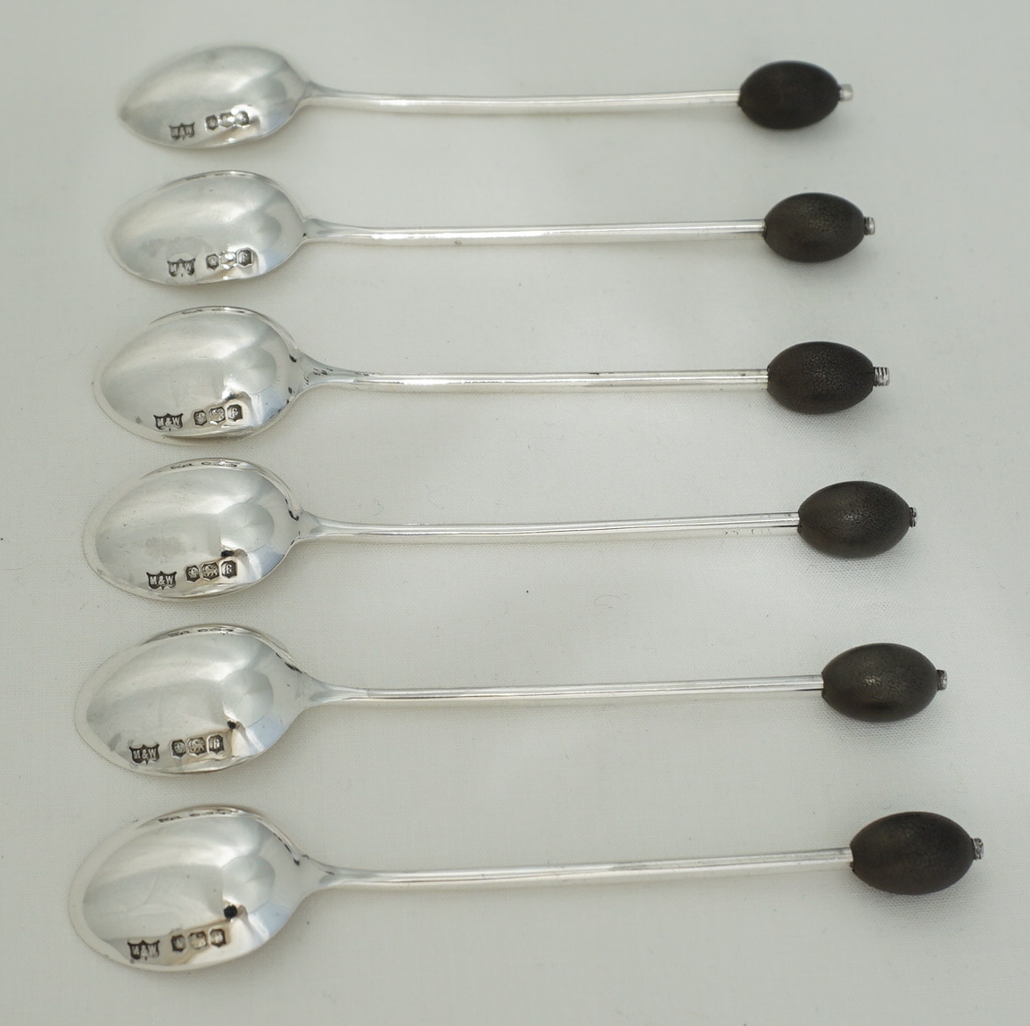 DESCRIPTION | Cased set of six antique English solid sterling silver simulated coffee bean end coffee spoons. |