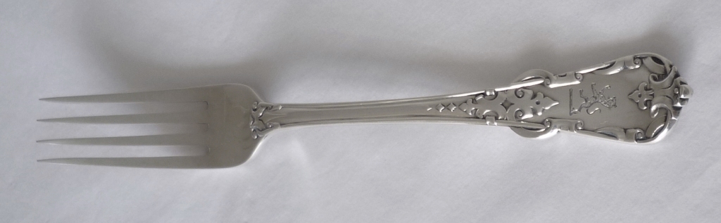Heavy Victorian silver Tudor pattern dessert fork. Frontal rampant leopard crest, fully hallmarked throughout and additionally marked verso with a design registration lozenge for 14th August 1850. |