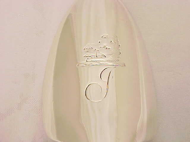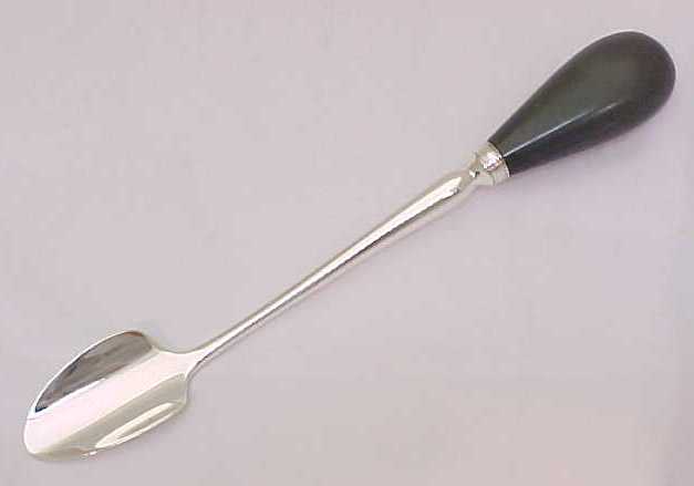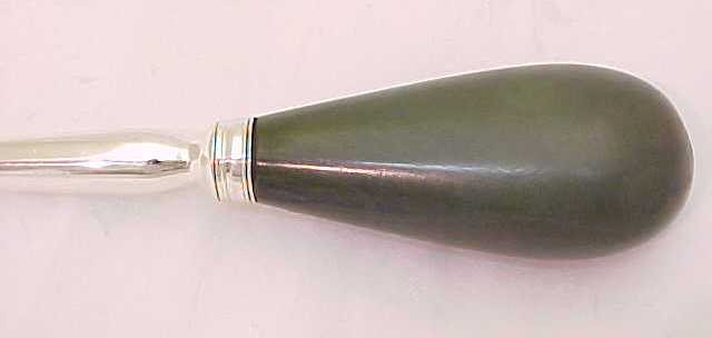Sturdy Georgian silver cheese scoop with green cobalt stained ivory handle, initial engraved below a boar's head crest. |