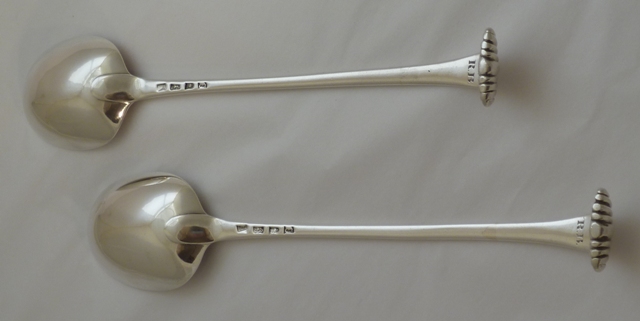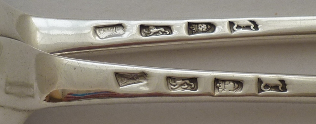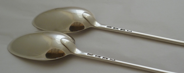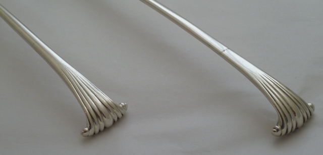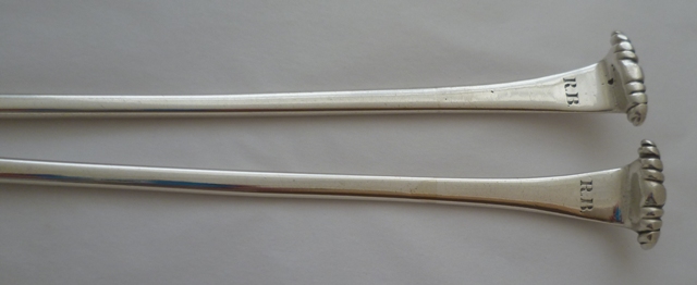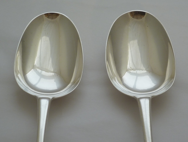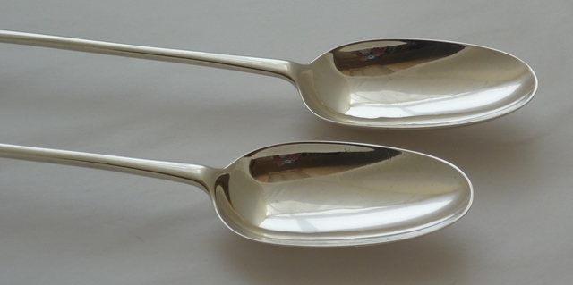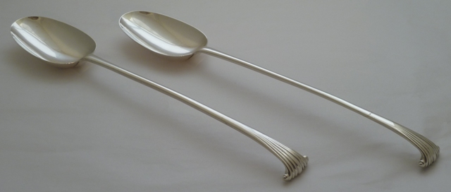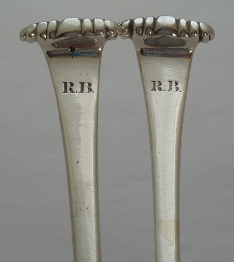 Two Georgian silver Onslow pattern basting spoons, both initial engraved R.B. to the terminals. Scarf joints to the terminal sections which is the correct construction for early Onslow. |