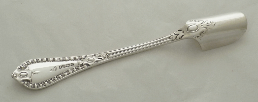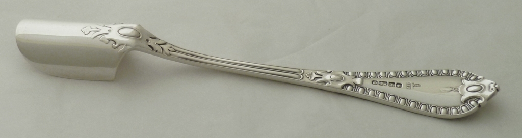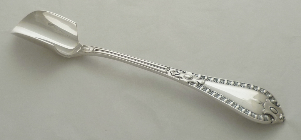 Good, large and heavy Victorian solid silver Grecian pattern cheese scoop. |