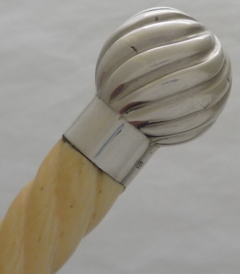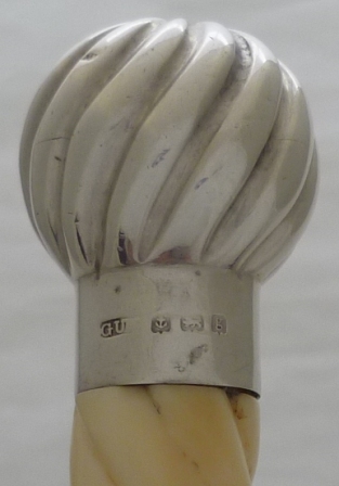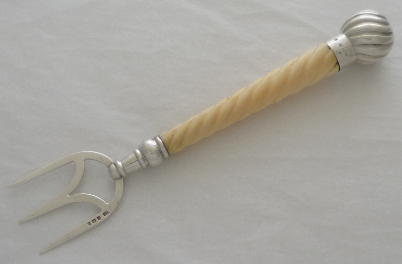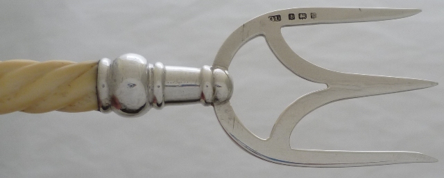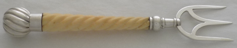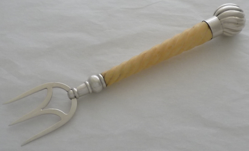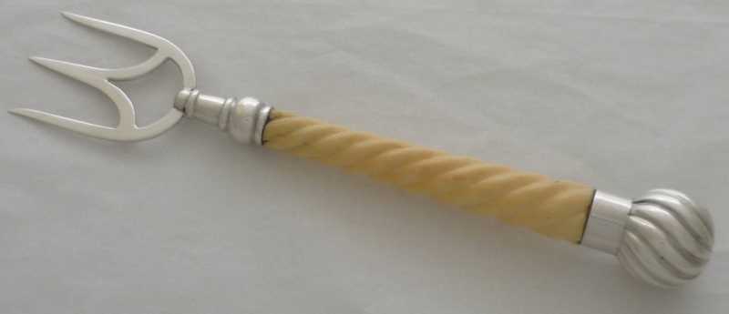 Edwardian silver trident serving fork with a spiral twist carved ivory handle. |