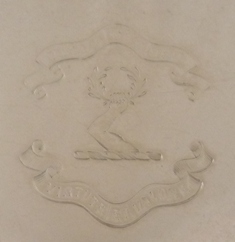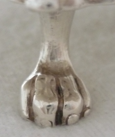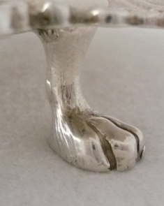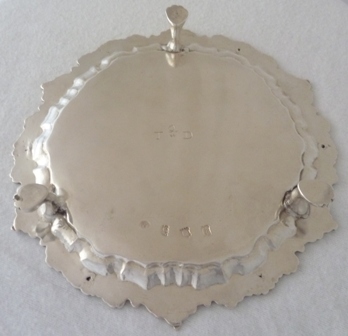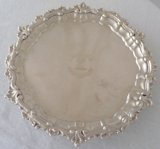 Good quality Georgian silver salver with rococo border, three lion's paw feet, a crest with motto engraved to the top and the earlier initial engraving verso. Nicely detailed border and feet. |