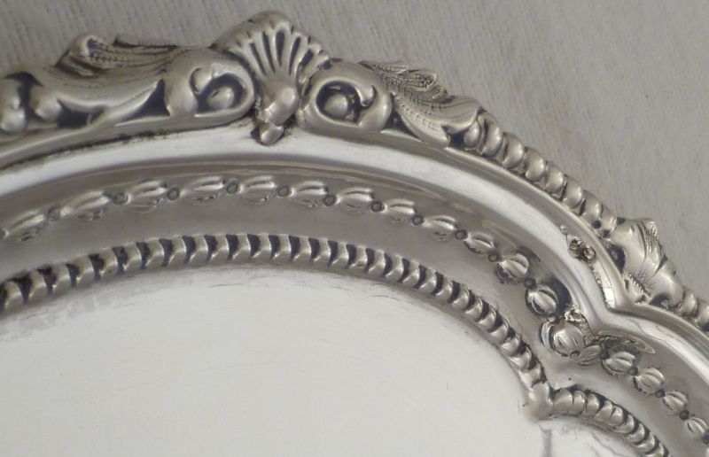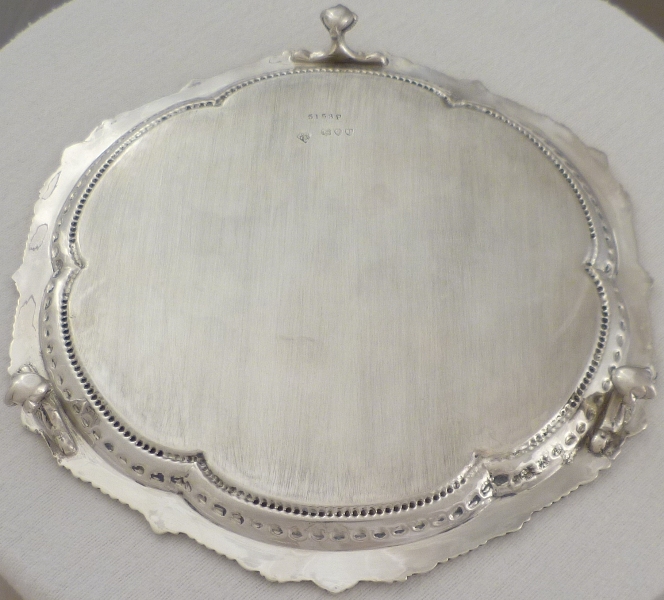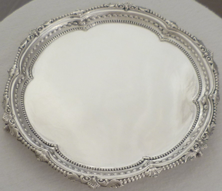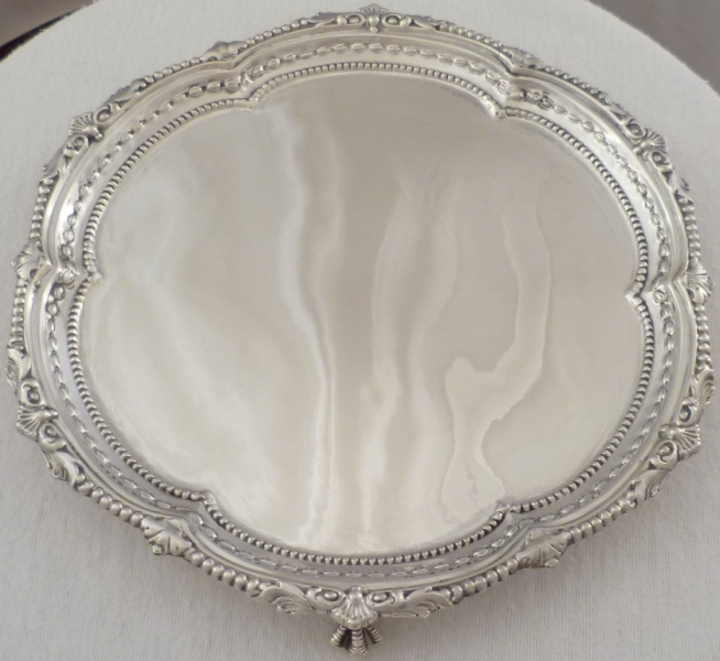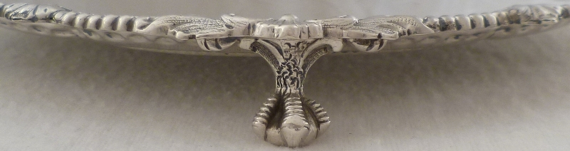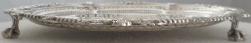 DESCRIPTION | Very pretty Victorian silver salver with highly decorative rim decoration and three nicely detailed ball and claw feet. |