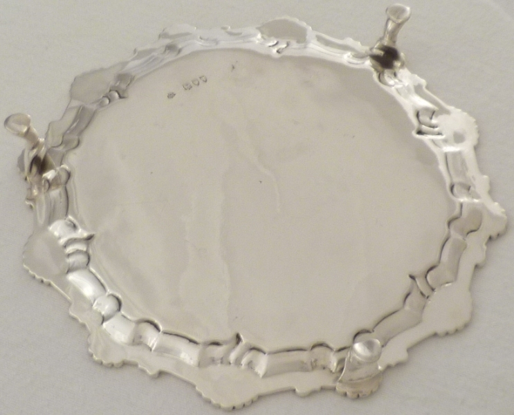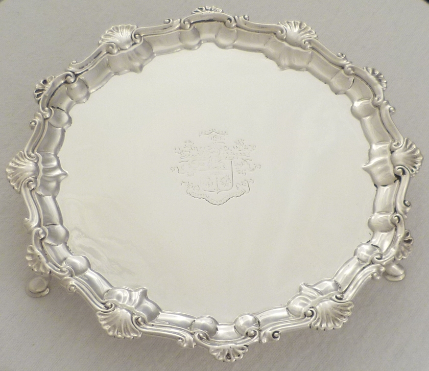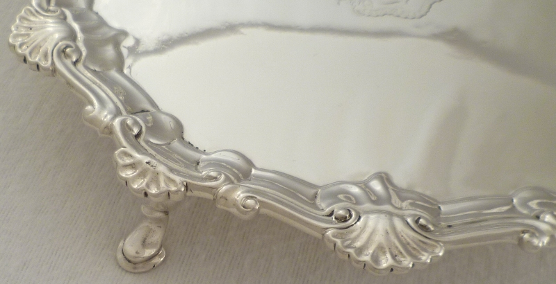 DESCRIPTION | Attractive and useful Victorian silver salver with a shell and scroll rim and three pad feet. A chunky little piece of good weight for its size. The original armorial engraving to the centre is for the Sassoon family from whom I purchased it, via their agent, earlier this year. |