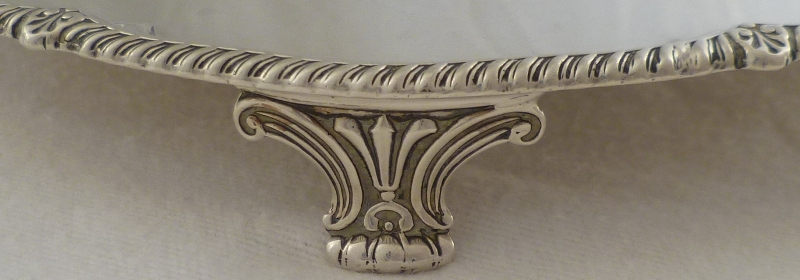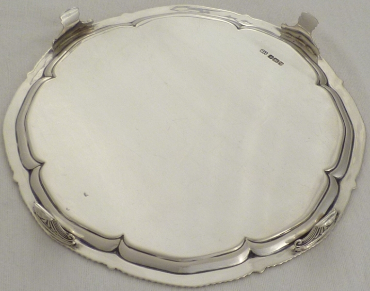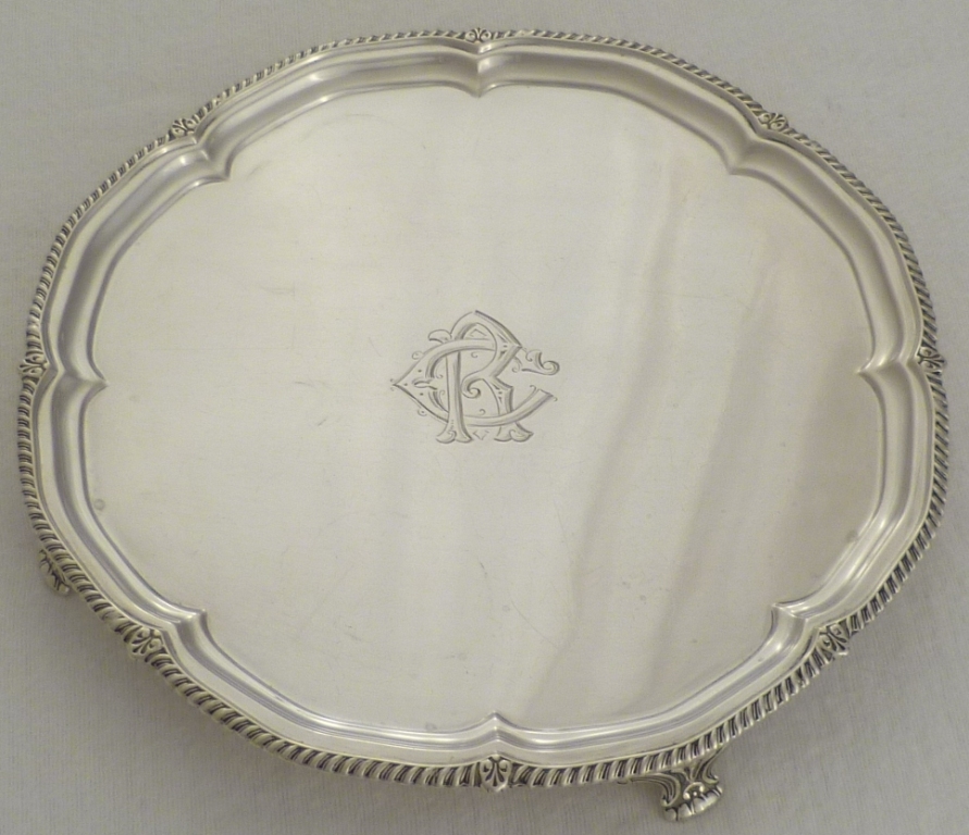 DESCRIPTION | Useful and attractive silver salver on four scroll decorated feet, gadroon and shell decorated border and the original monogram engraving to the centre. |
