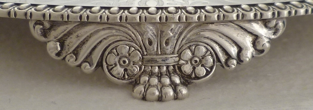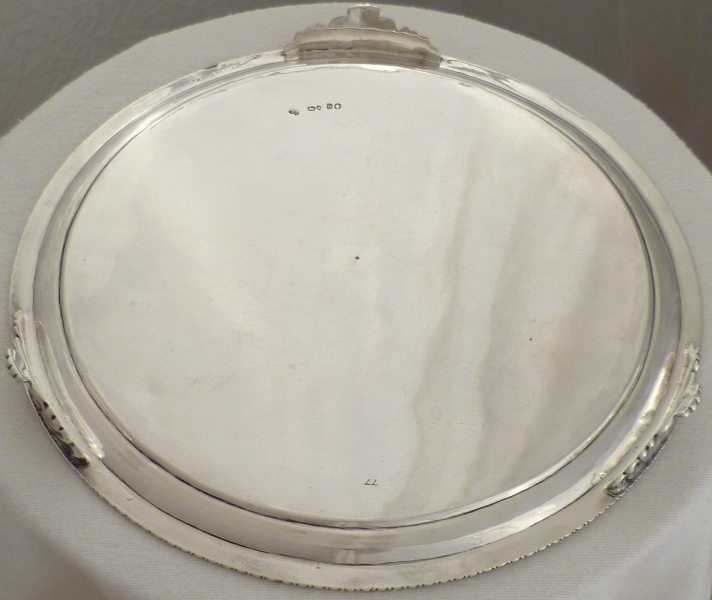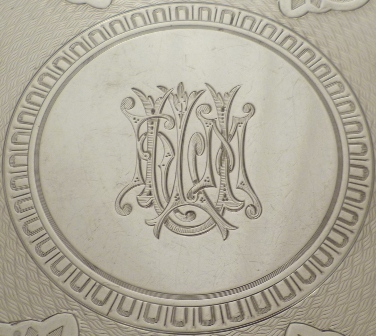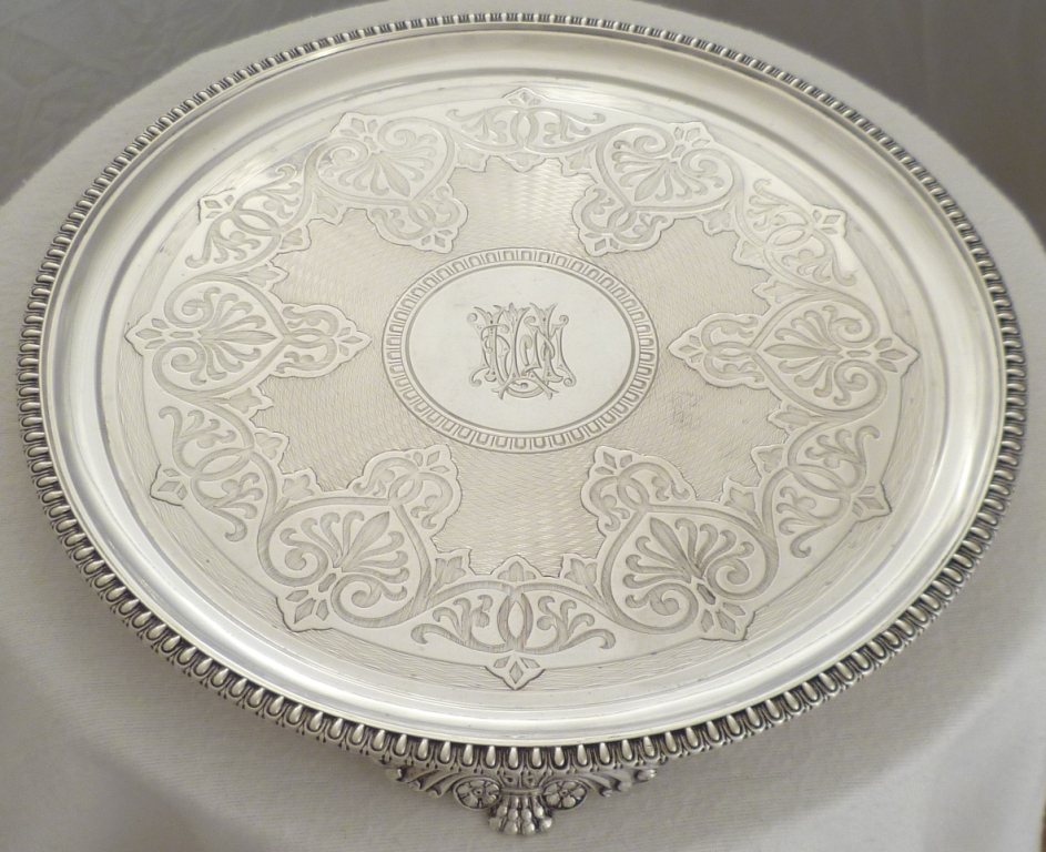 DESCRIPTION | High Victorian silver salver with engraved decoration, central monogram and three bracket feet. |
