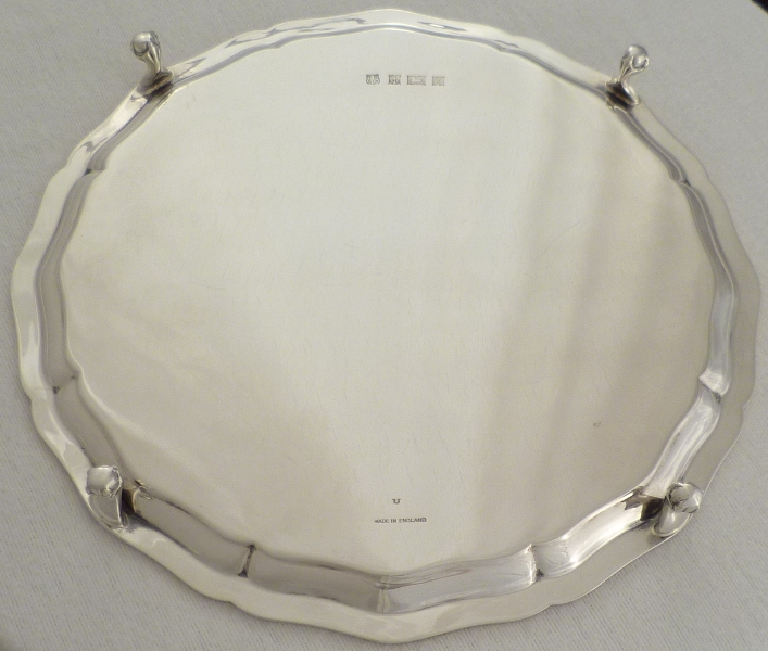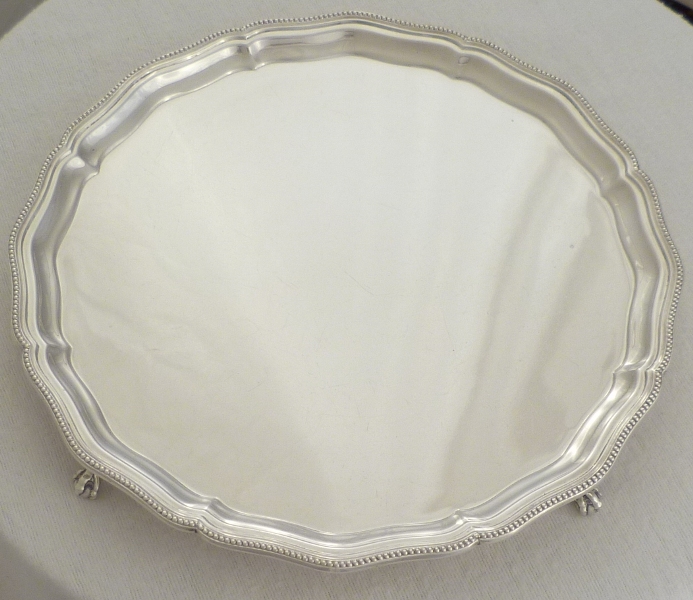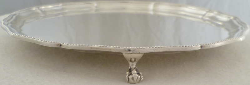 DESCRIPTION | Silver salver with bead edge decoration and four ball and claw feet. |